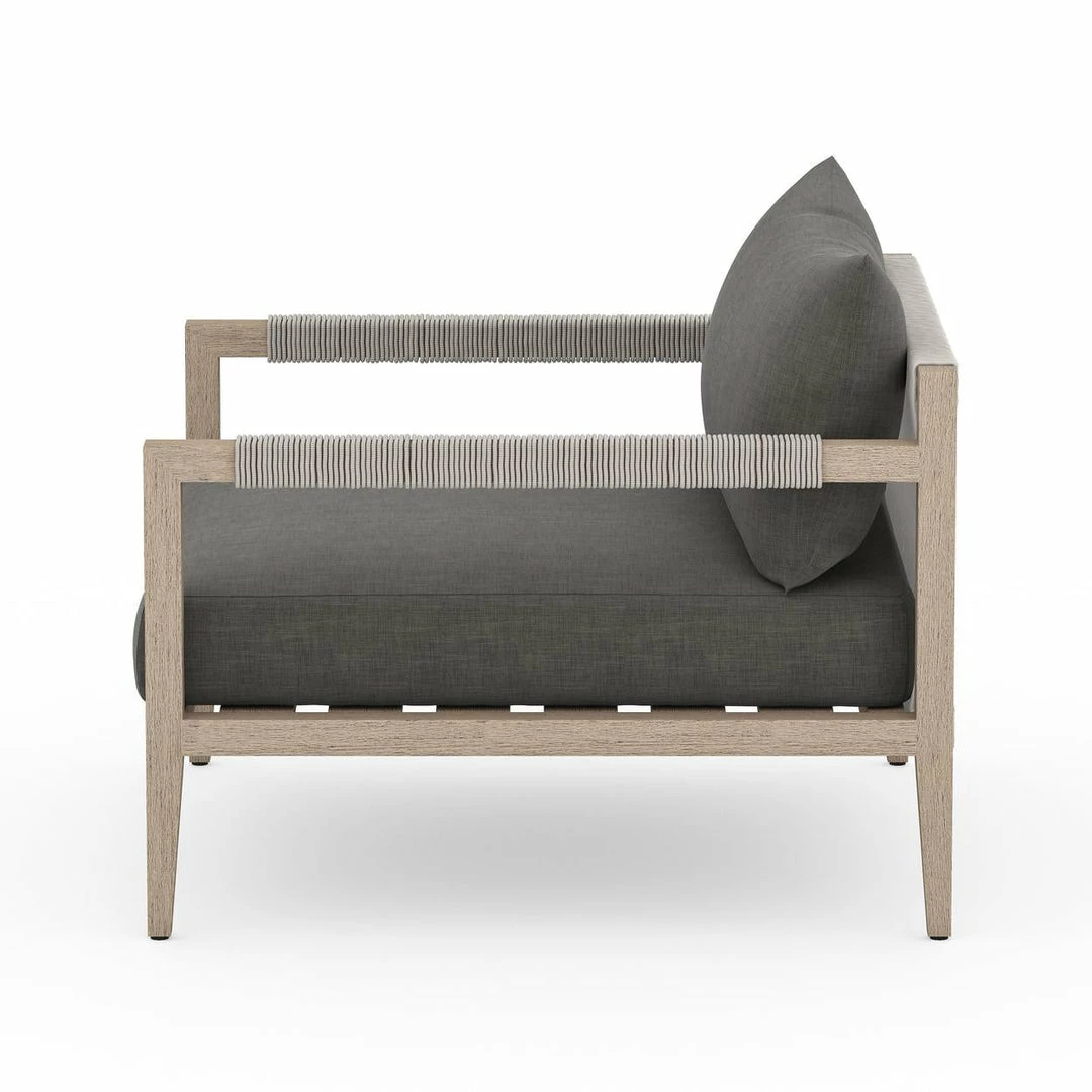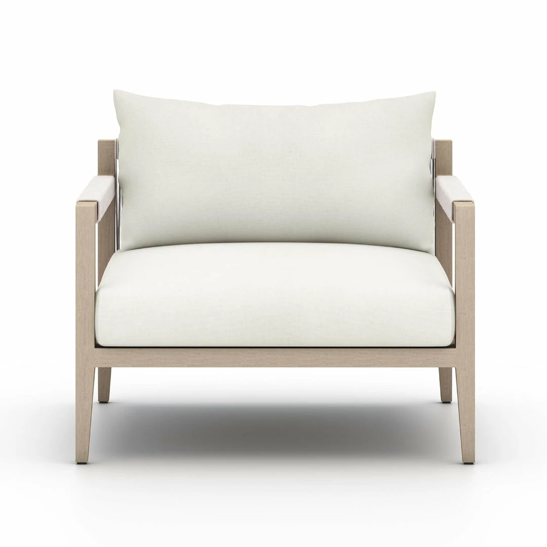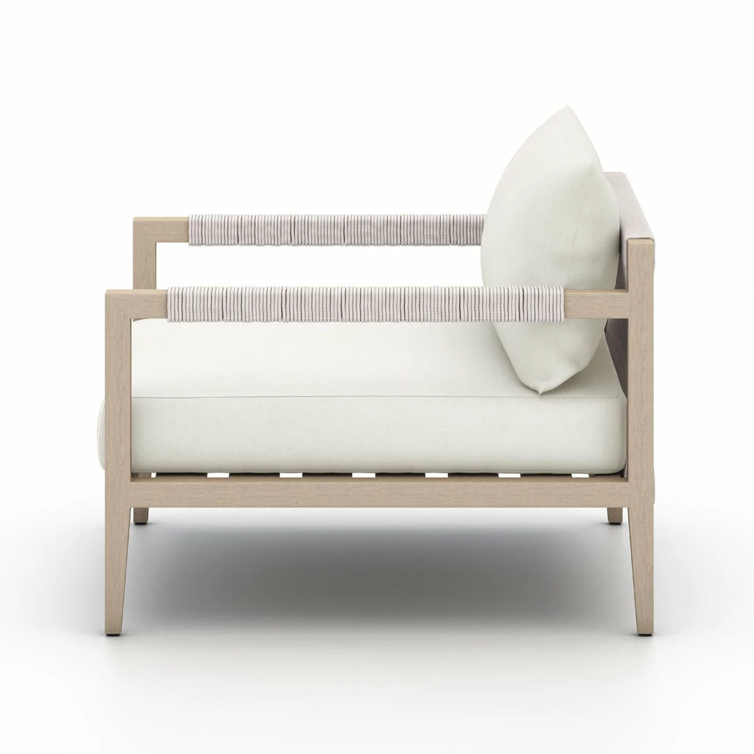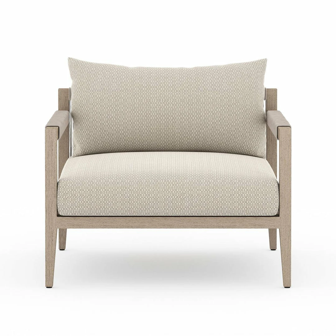 Modern materials ready a stylish silhouette for the outdoors. Washed brown teak forms a clean frame for UV-resistant and water-repellent Sunproof fabric in a light sand. Cover or store indoors during inclement weather.