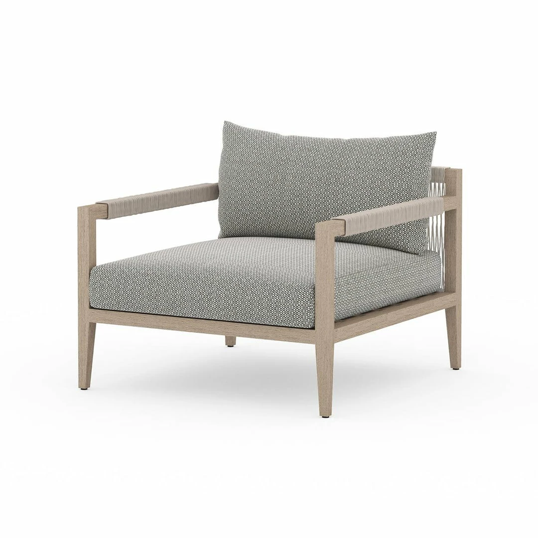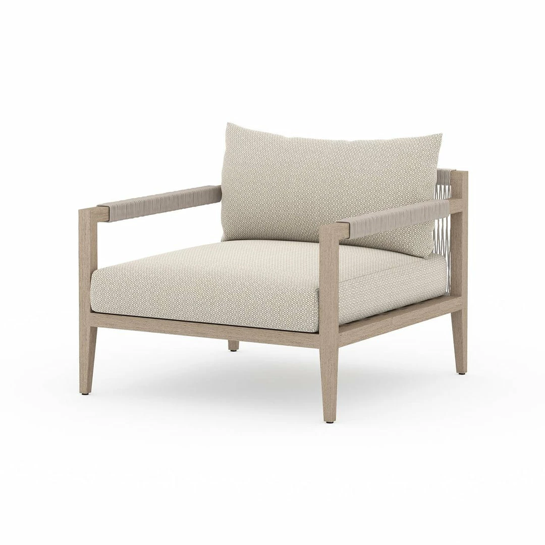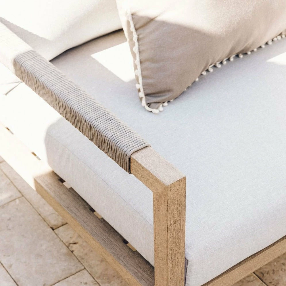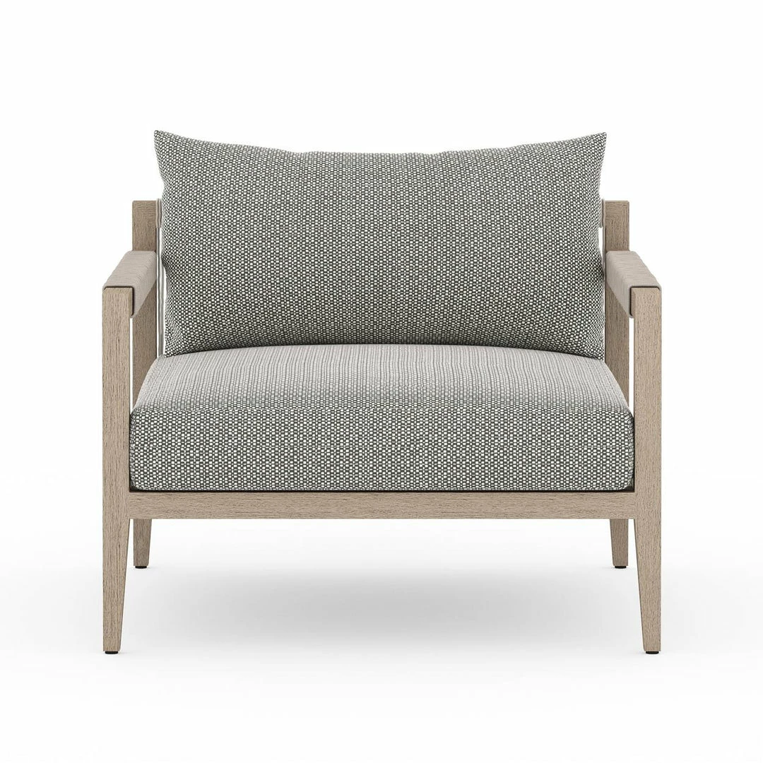 Modern materials ready a stylish silhouette for the outdoors. Washed brown teak forms a clean frame for UV-resistant and water-repellent Sunproof fabric in a light sand. Cover or store indoors during inclement weather.