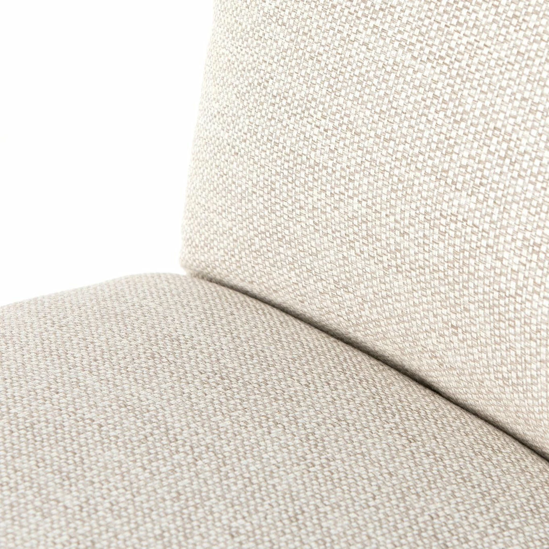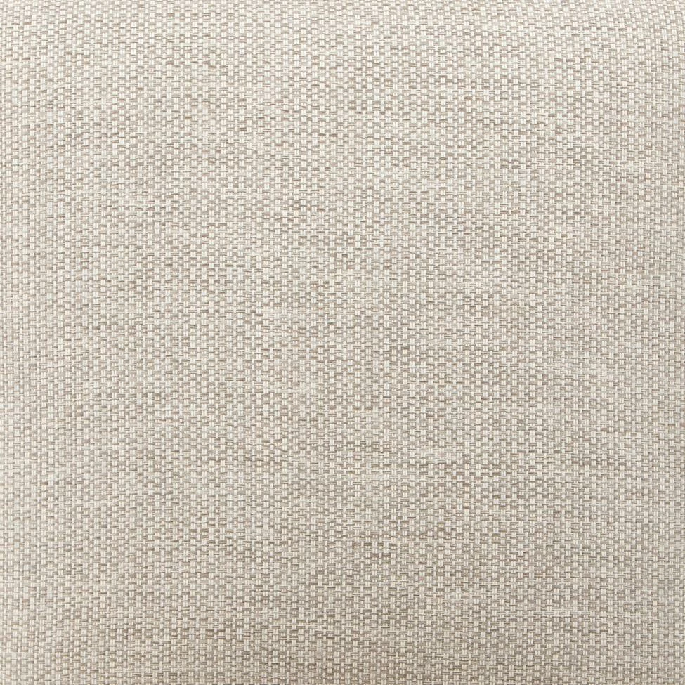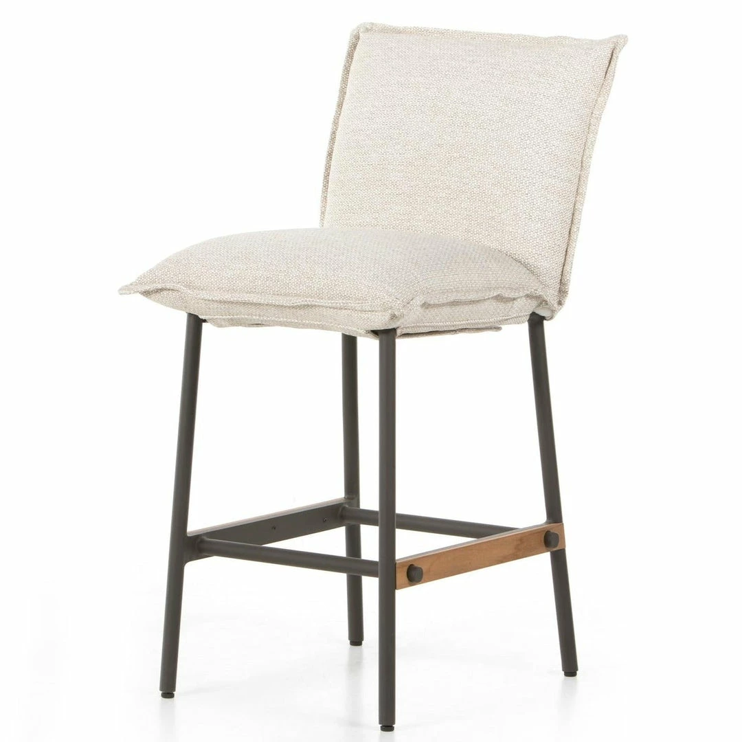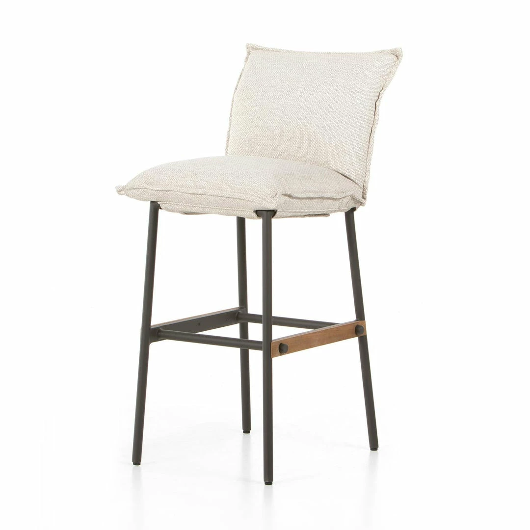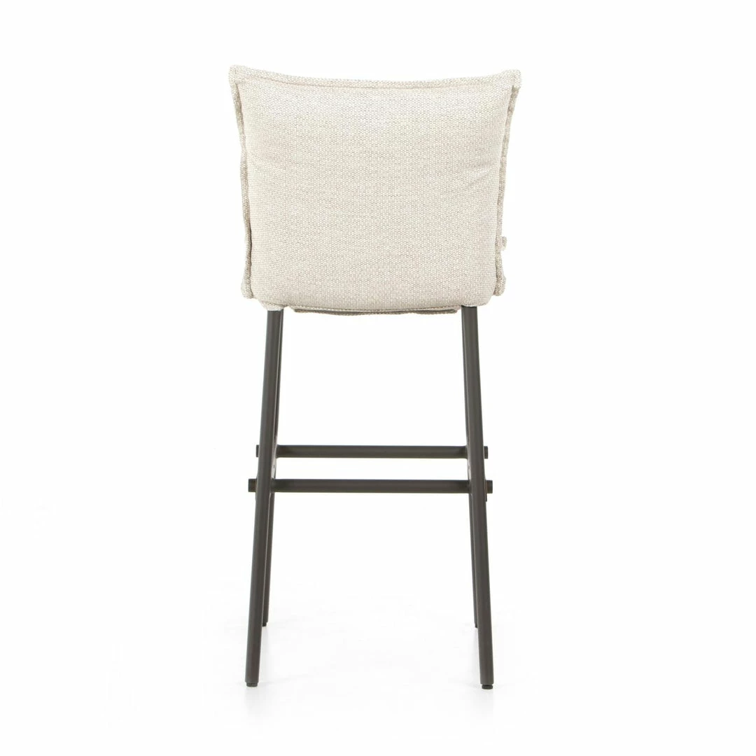 A plush take on outdoor entertaining. Durable sand-colored upholstery features flange detailing, for a luxuriously comfy sit with fresh flair. An airy, dark bronze-finished iron base with teak-detailed stretchers mixes materials to beautifully modern effect. Cover or store indoors during inclement weather and when not in use.