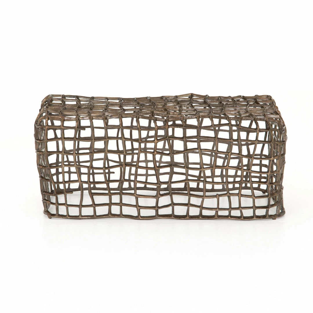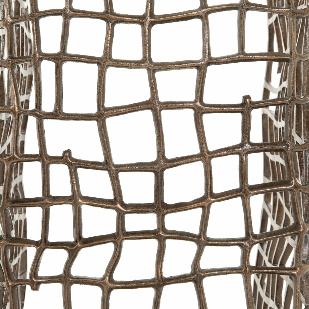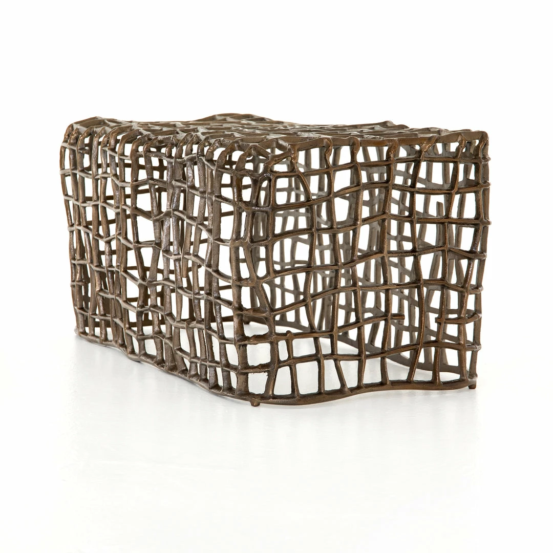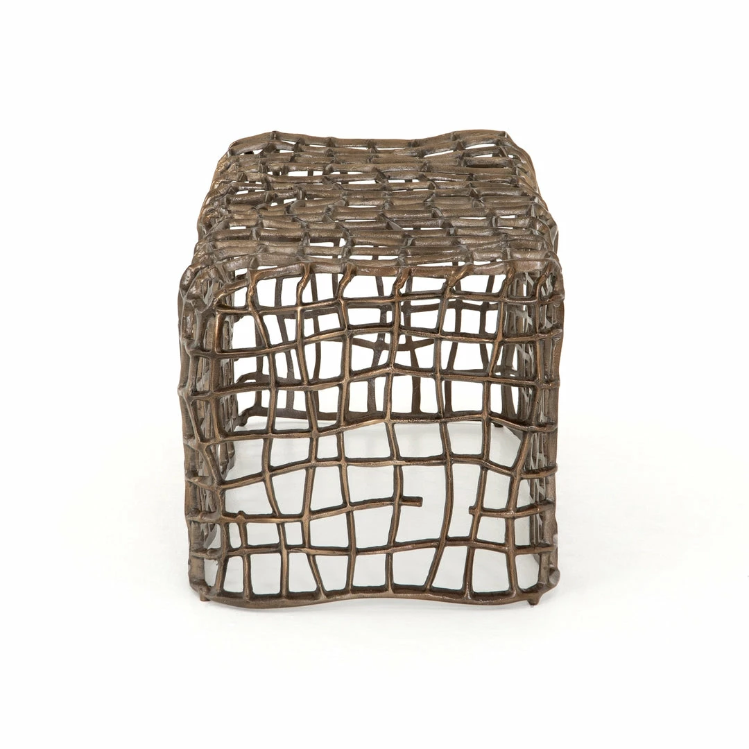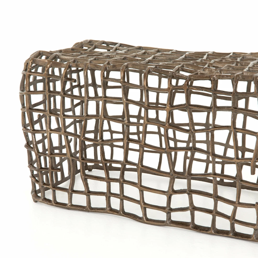 Aged bronze-finished aluminum forms a fluid, cage-like bench, for a forward-thinking look with clever distinction, indoors or out. Cover or store indoors during inclement weather and when not in use.