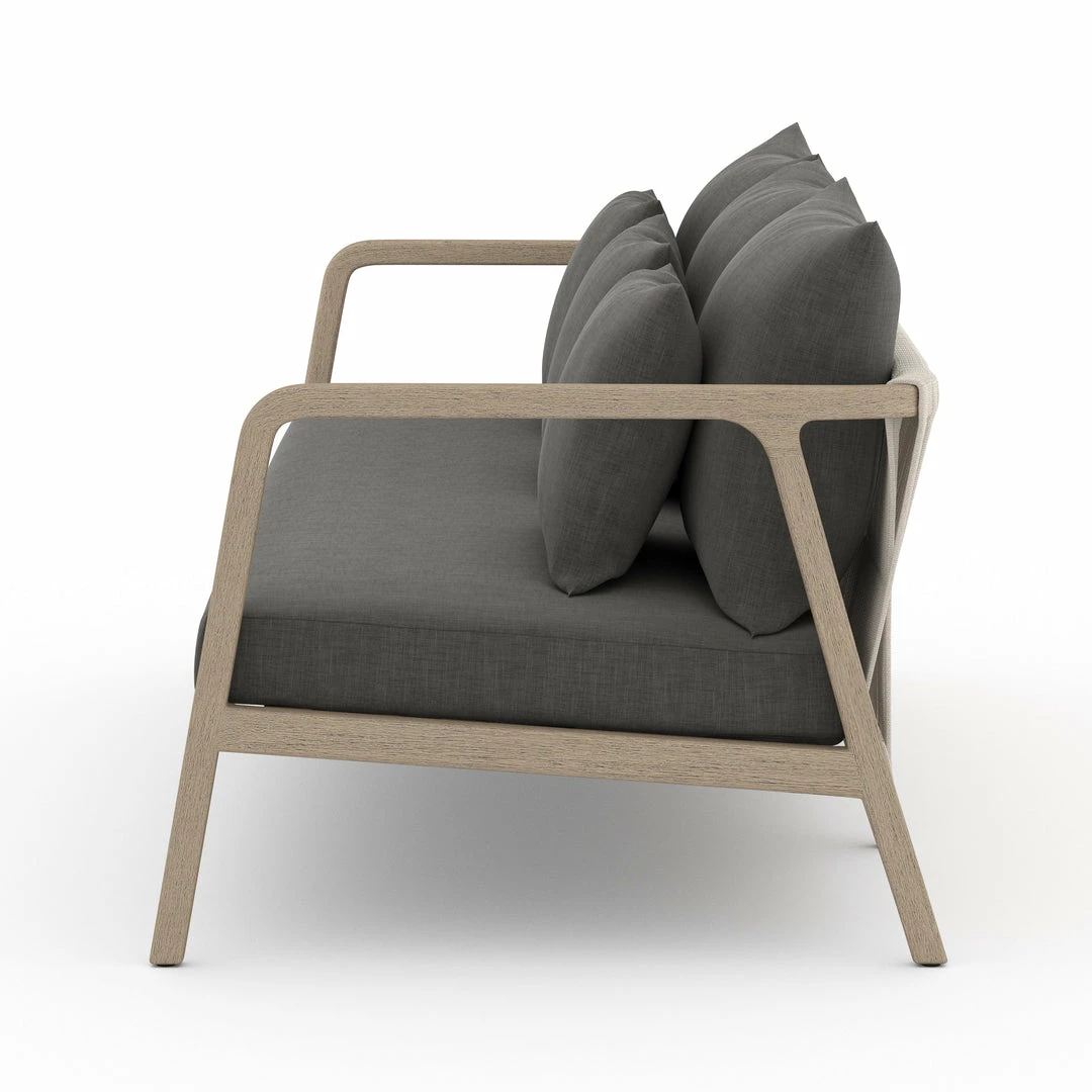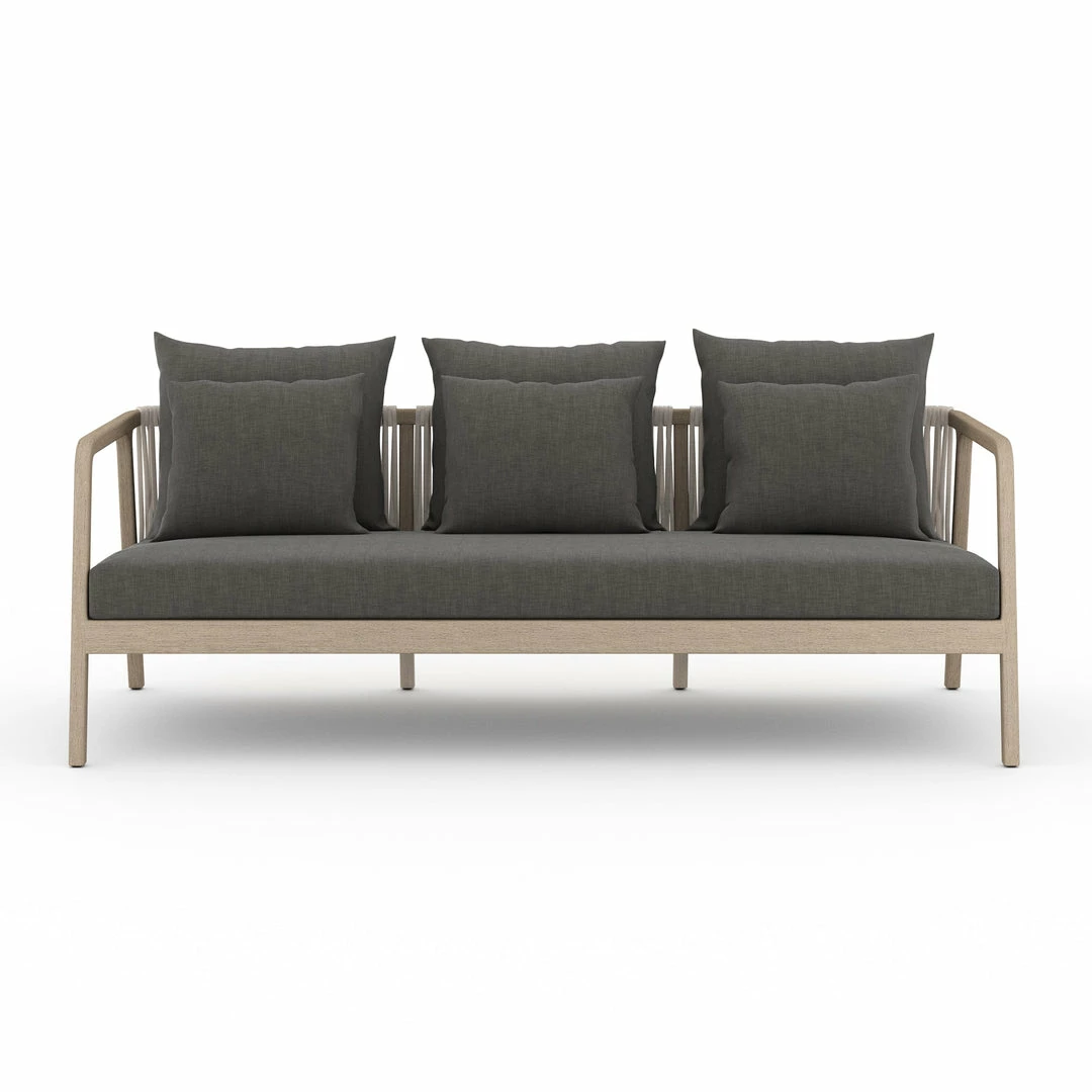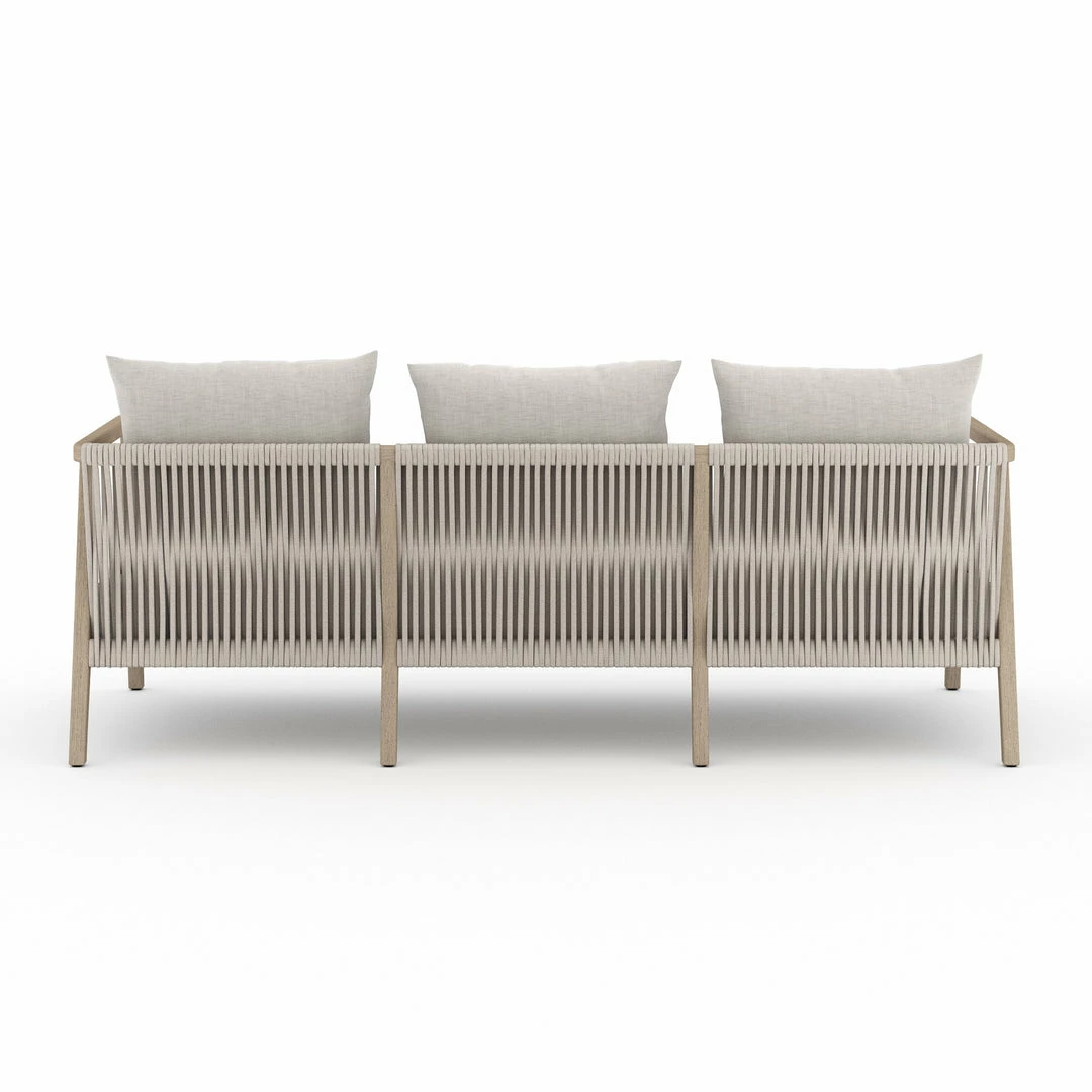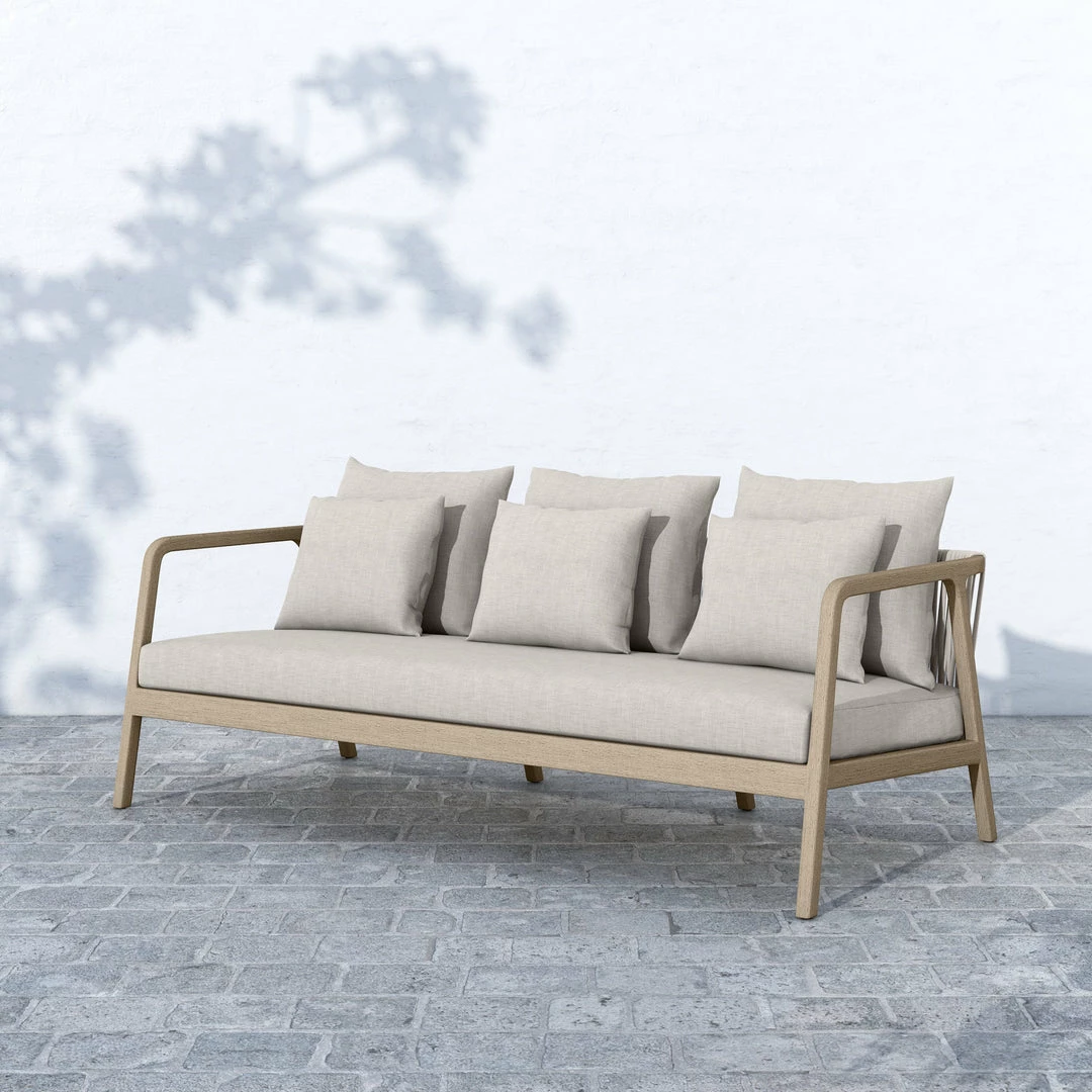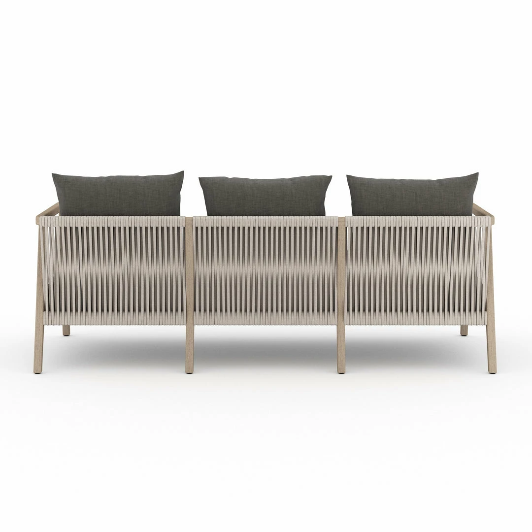 Durable materials ready a stylish three-seat silhouette for the outdoors. Washed brown teak framing features dramatically sculpted arms and rear rope weaving for extra texture. Cover or store inside during inclement weather.