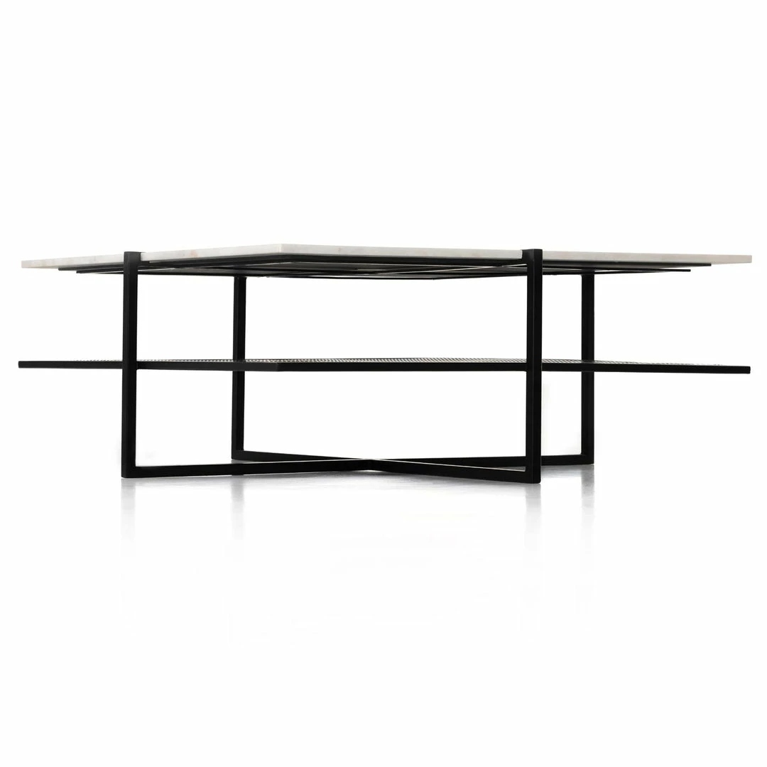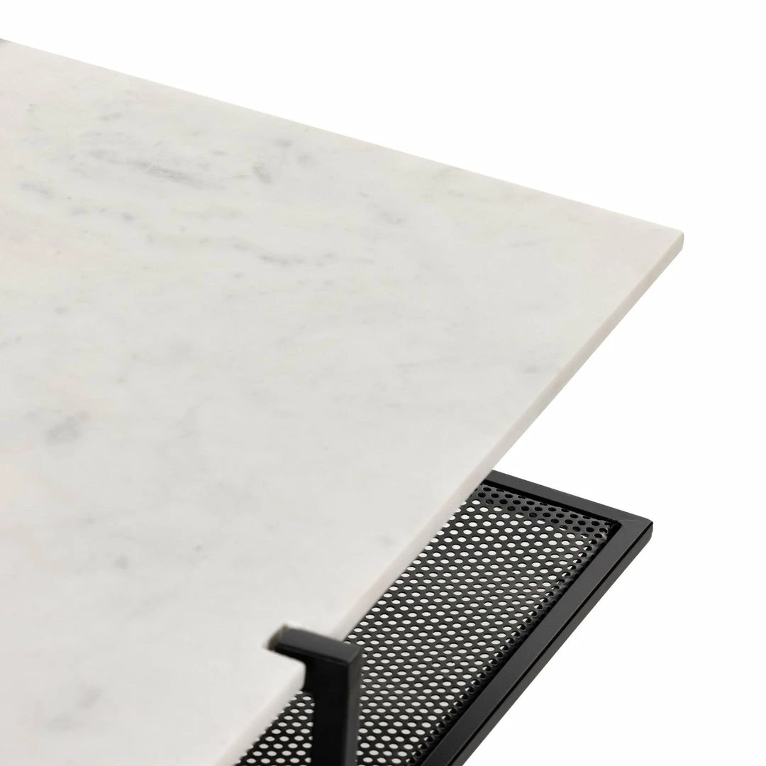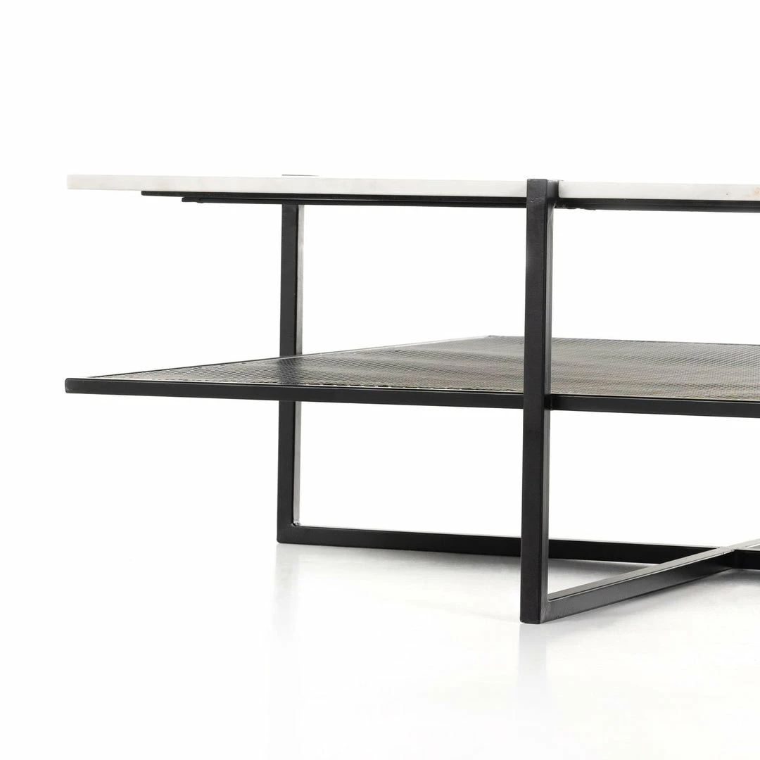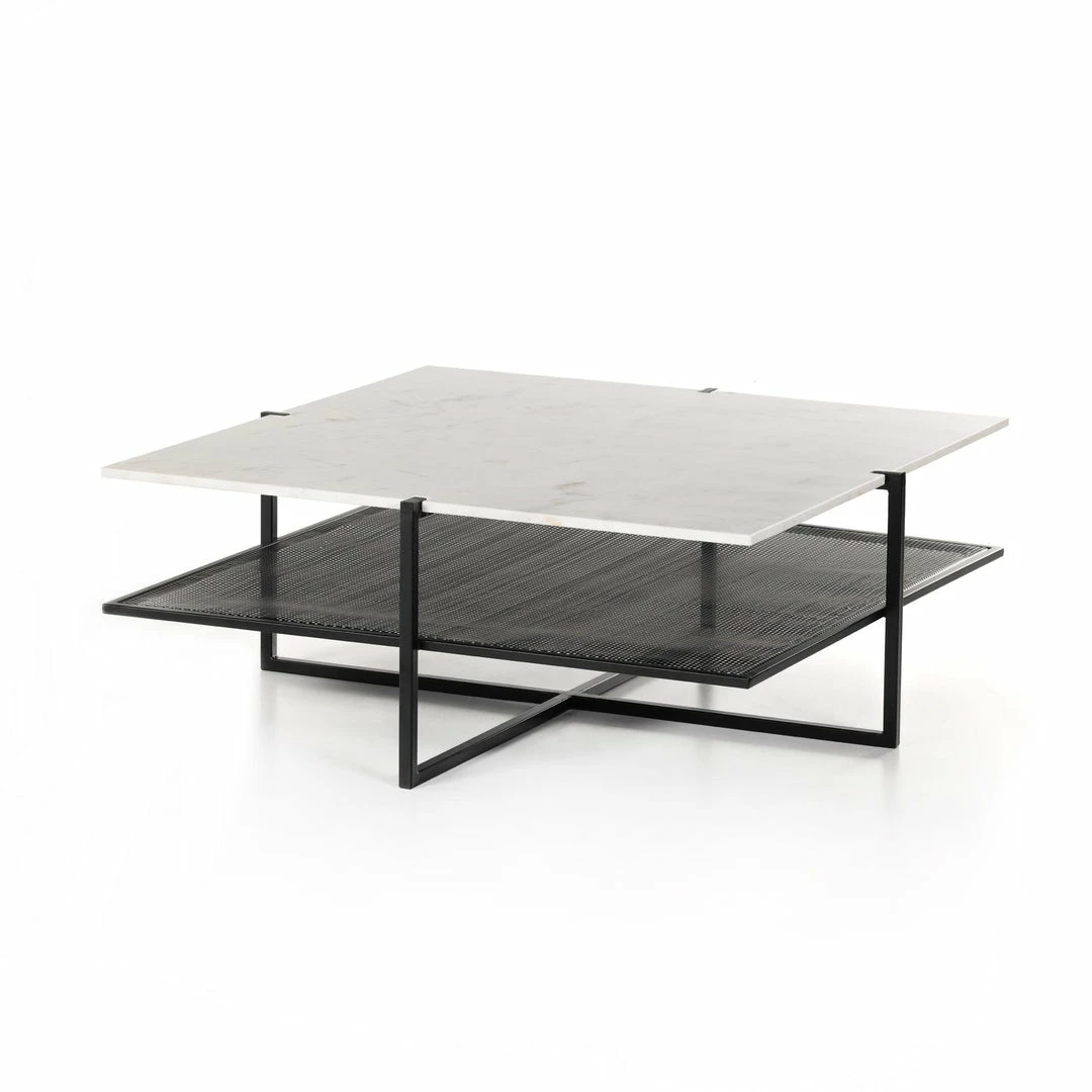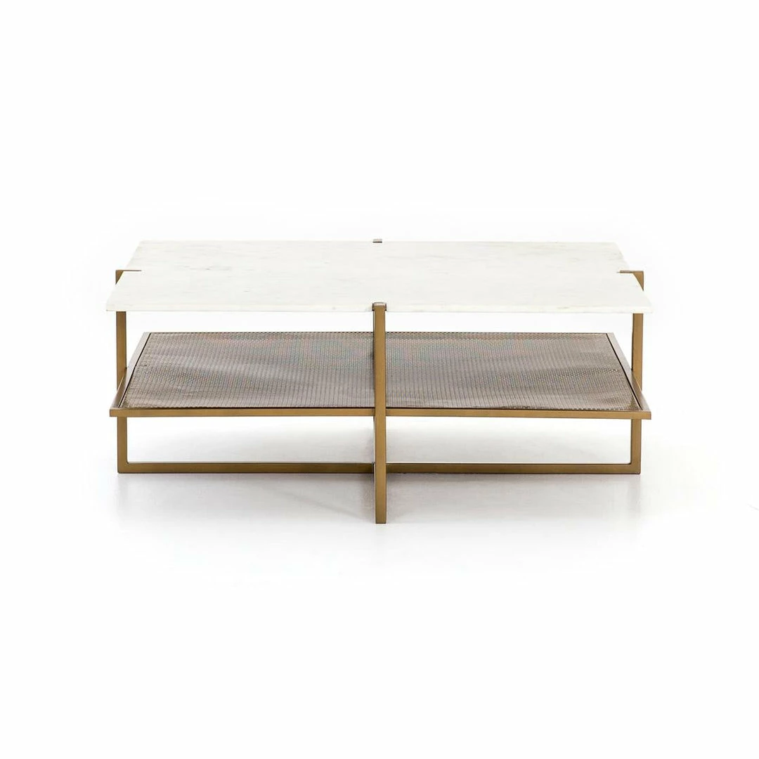 Add a pop of sophistication with a two-tone touch. Slim, antique brass-finished iron forms an X to support tiers of perforated metal and polished white marble, bringing a look of simple grace to the modern coffee table.