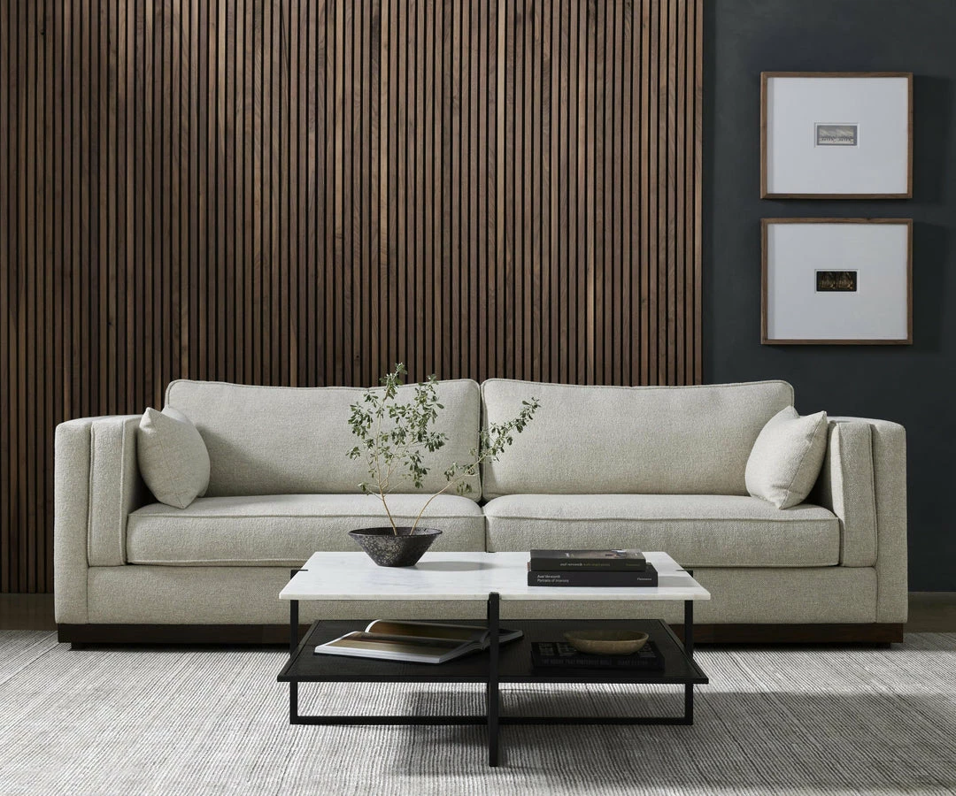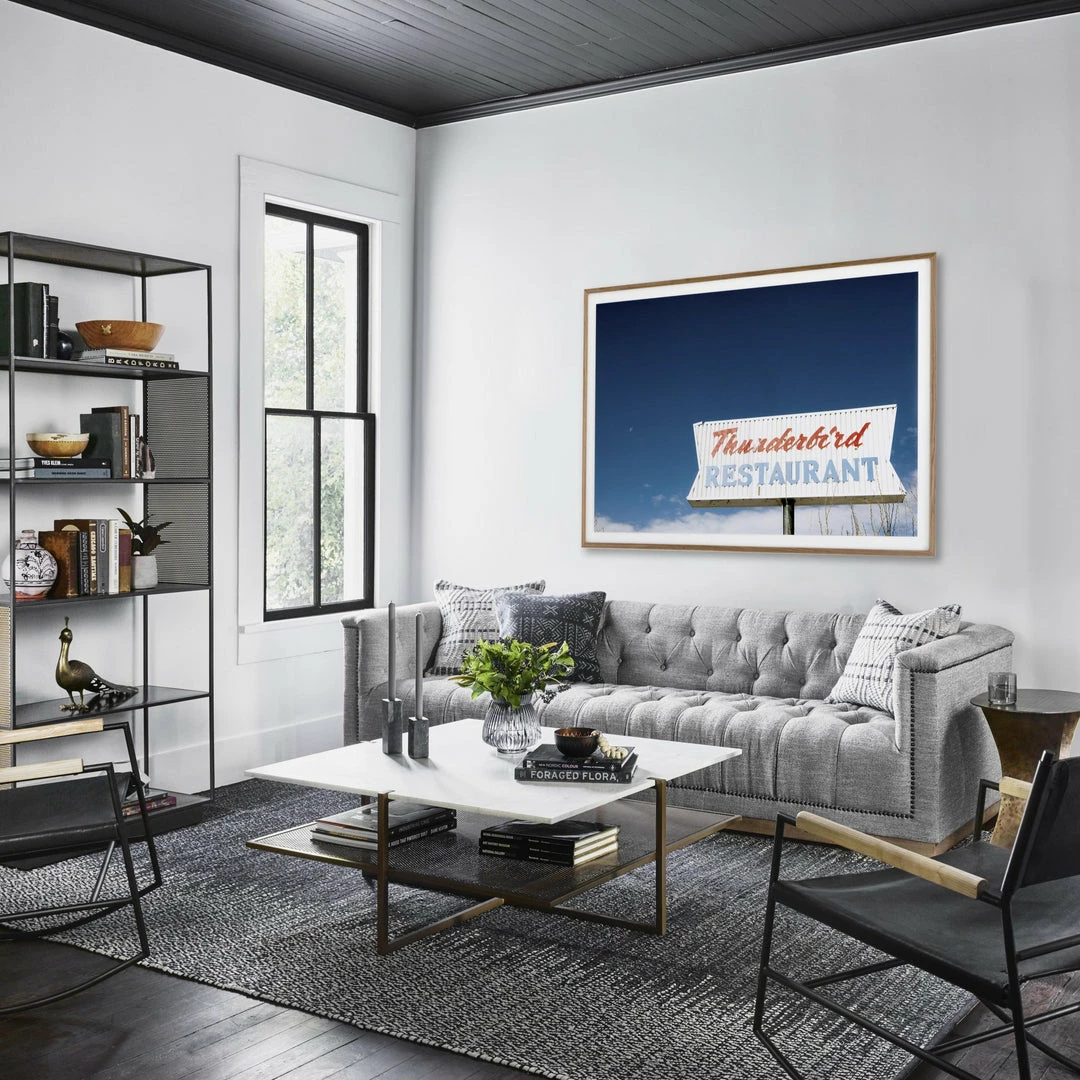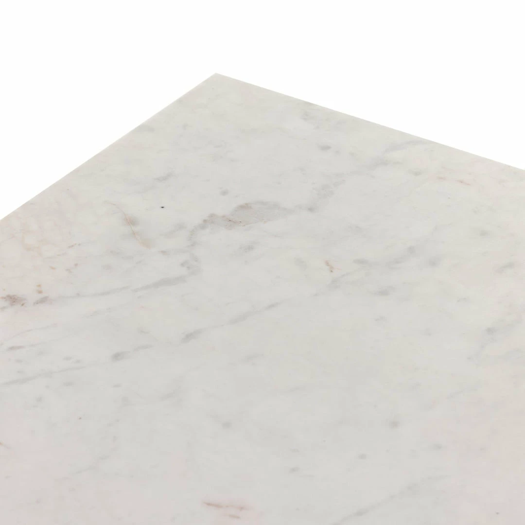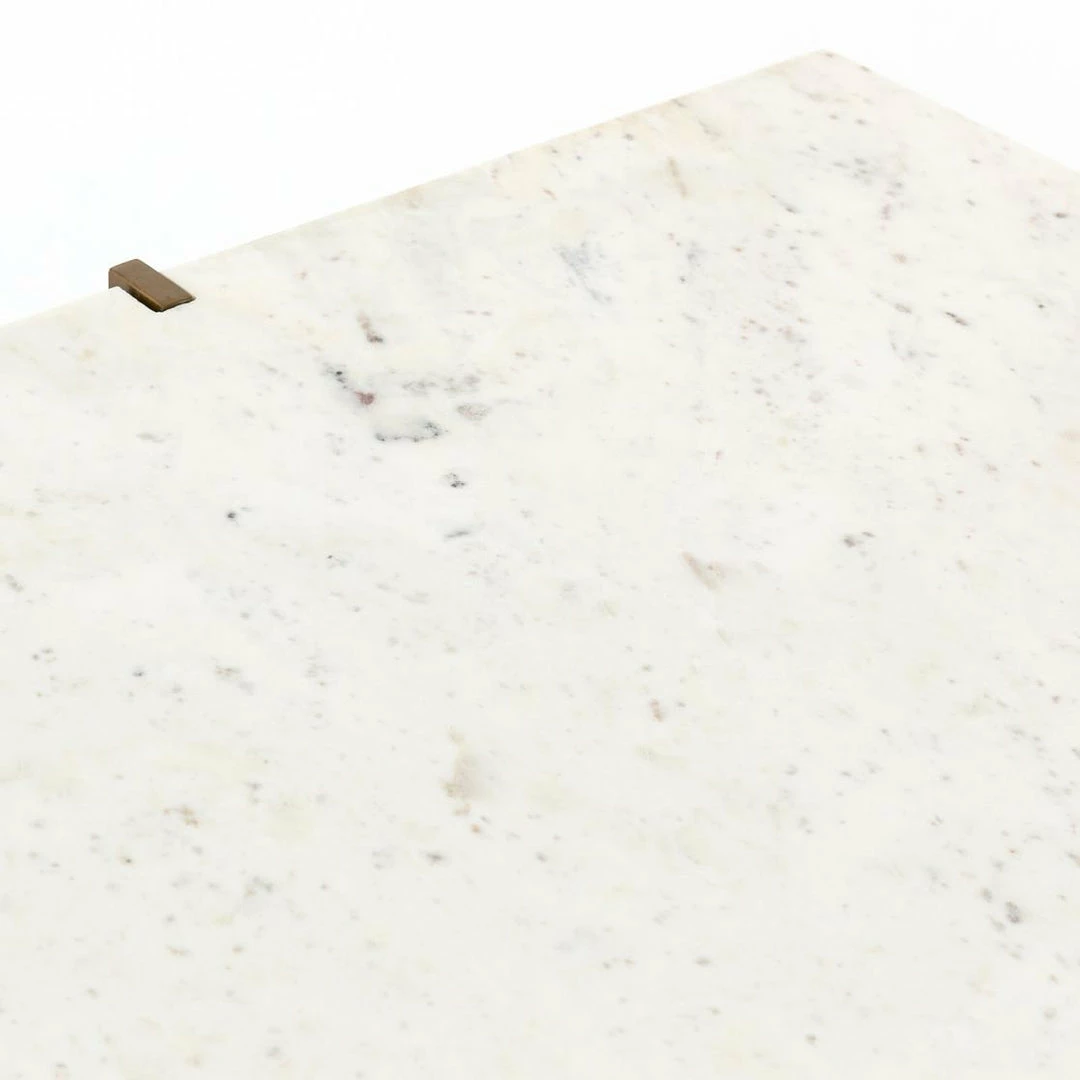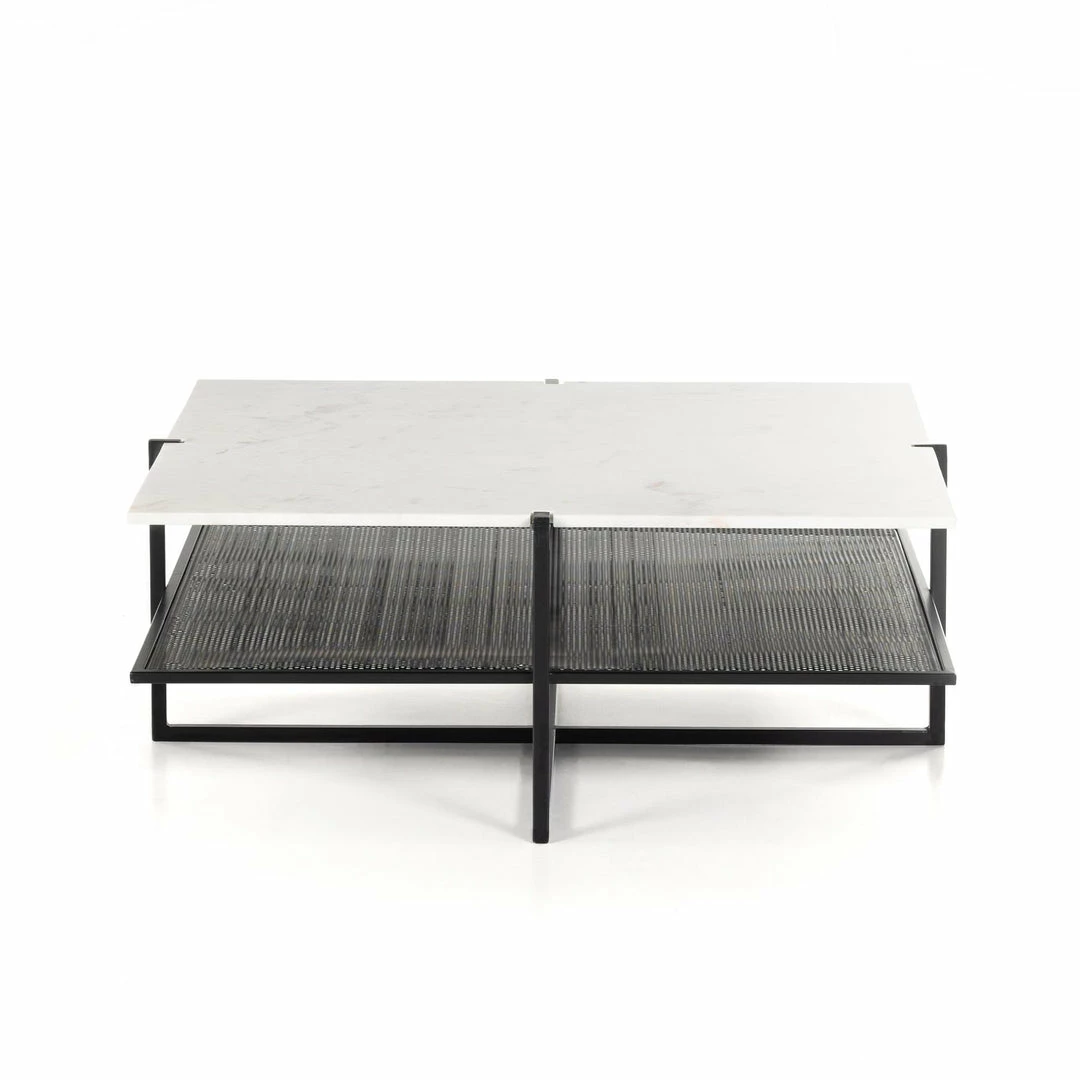 Add a pop of sophistication with a two-tone touch. Slim, antique brass-finished iron forms an X to support tiers of perforated metal and polished white marble, bringing a look of simple grace to the modern coffee table.