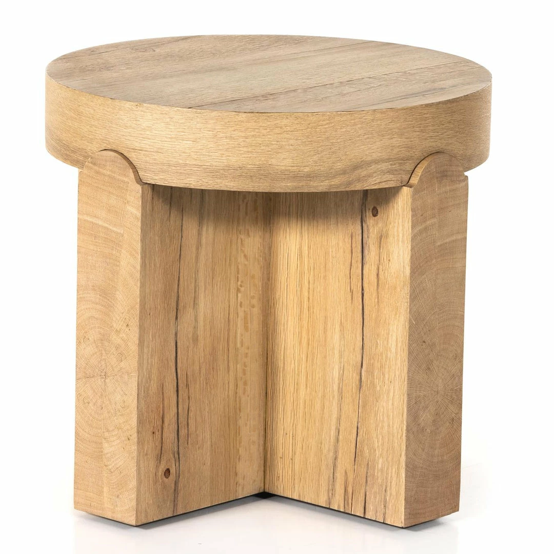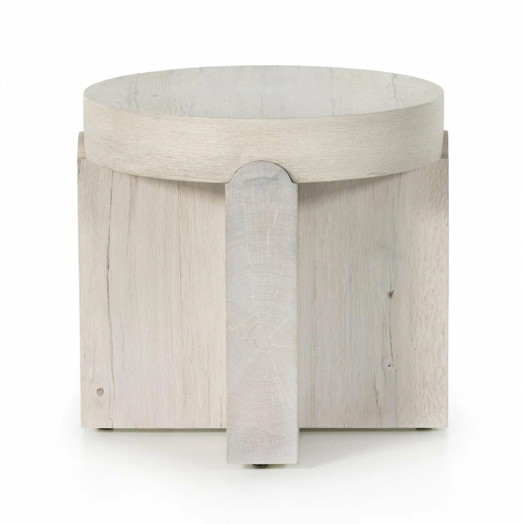 Keep things light and monochromatic with a rounded end table made from bleached oak veneer. Slab-style legs intersect a thick-cut top for an intriguing, geometric touch. A subtle color variance is to be expected from piece to piece, reflective of sun bleaching process.