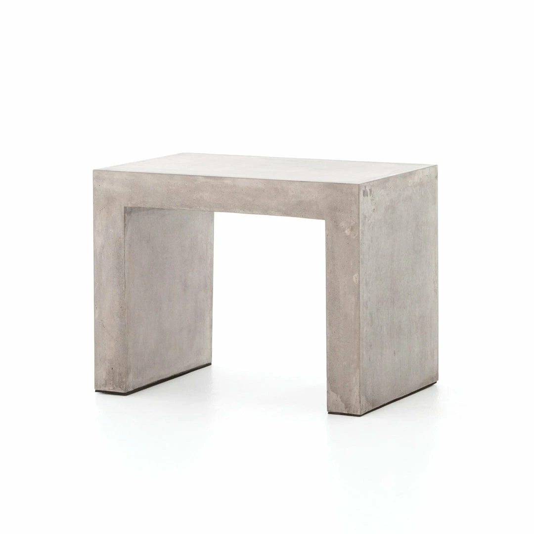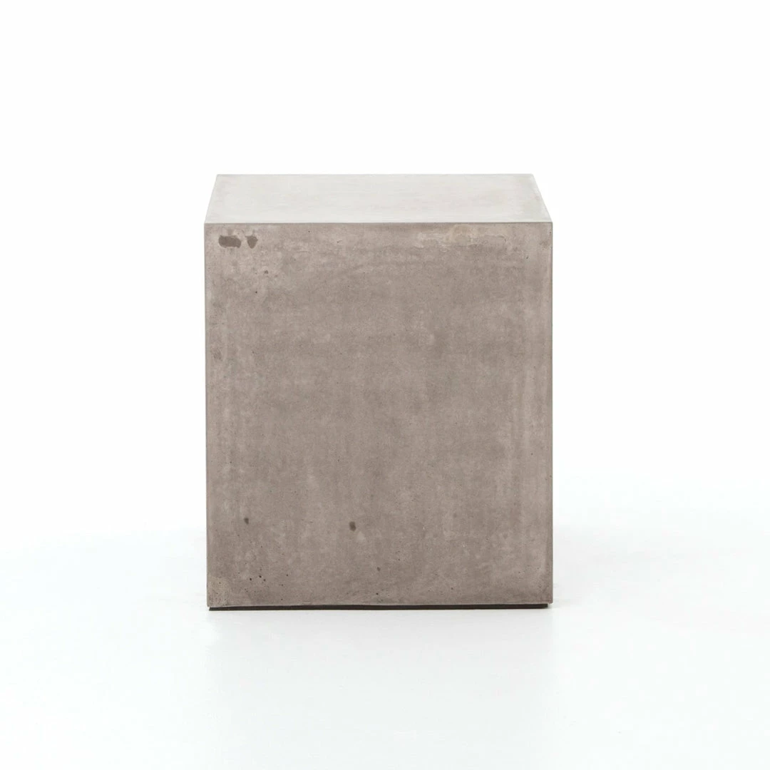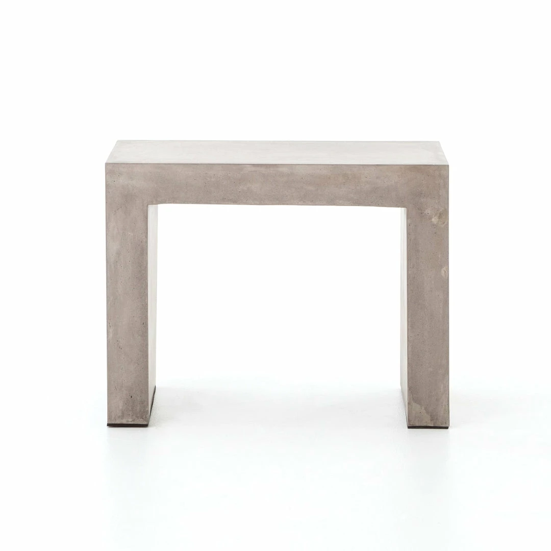 Industrial materials in smoothly refined shapes. Dark grey concrete forms a Parsons style side table. Made for indoor or outdoor spaces— cover or store indoors during inclement weather and when not in use.