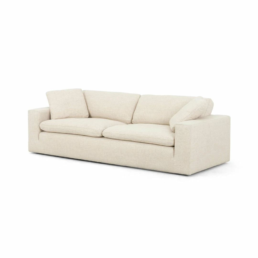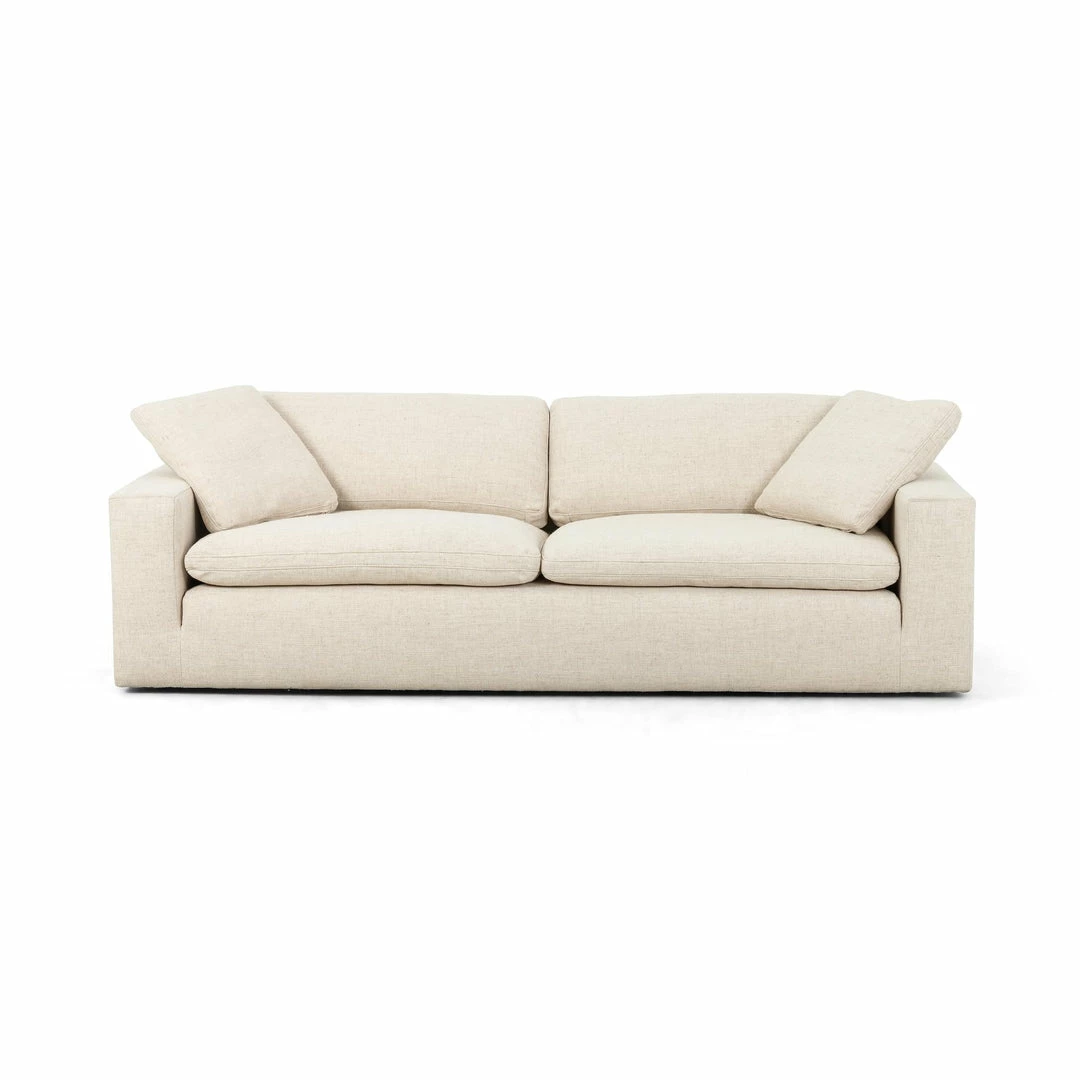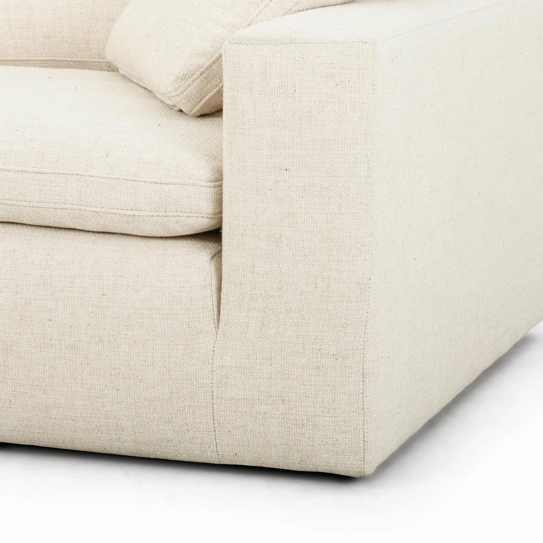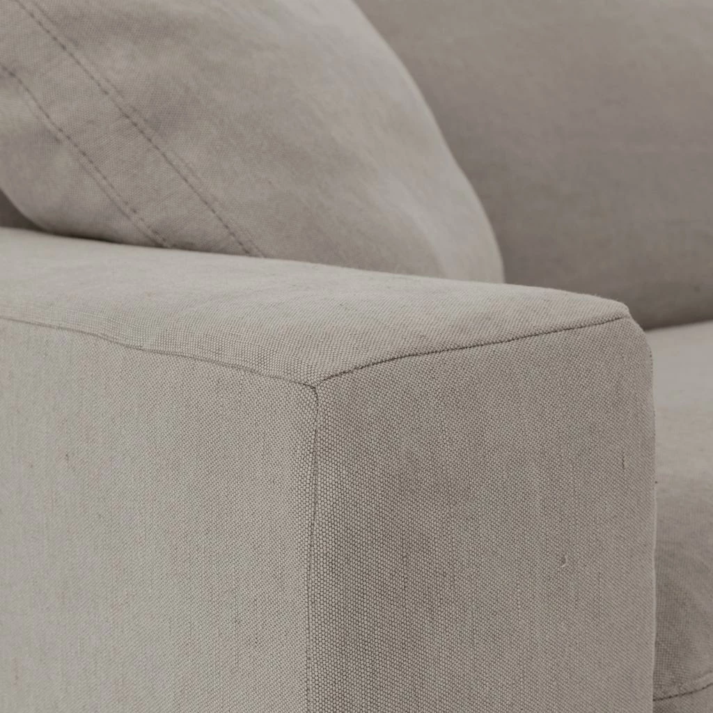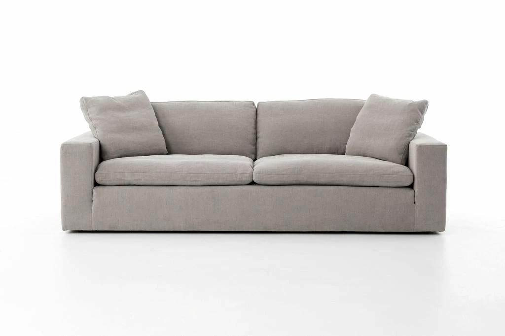 Sink-in luxury. Designed to mimic the casual comfort of a feather duvet, squared block arms frame feather-and down-filled seating for a relaxed look and feel. Fluff cushions regularly to maintain appearance; steam fabric for a more tailored look.