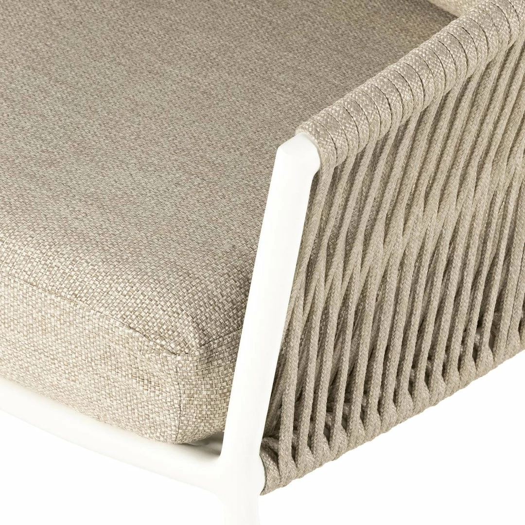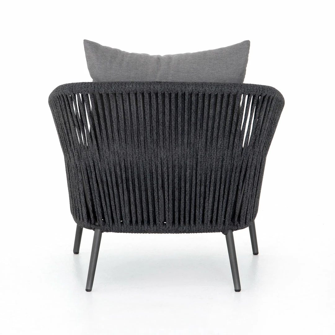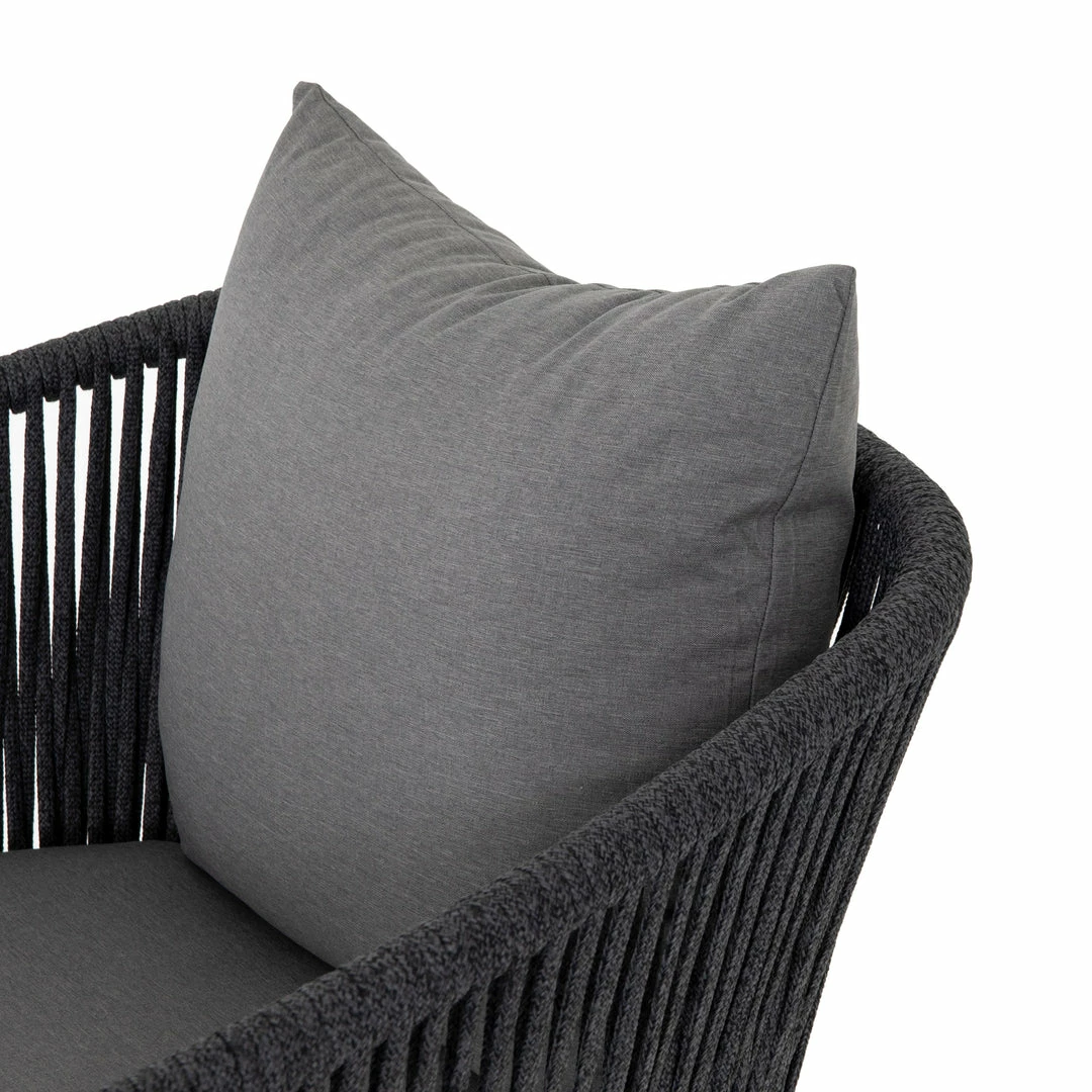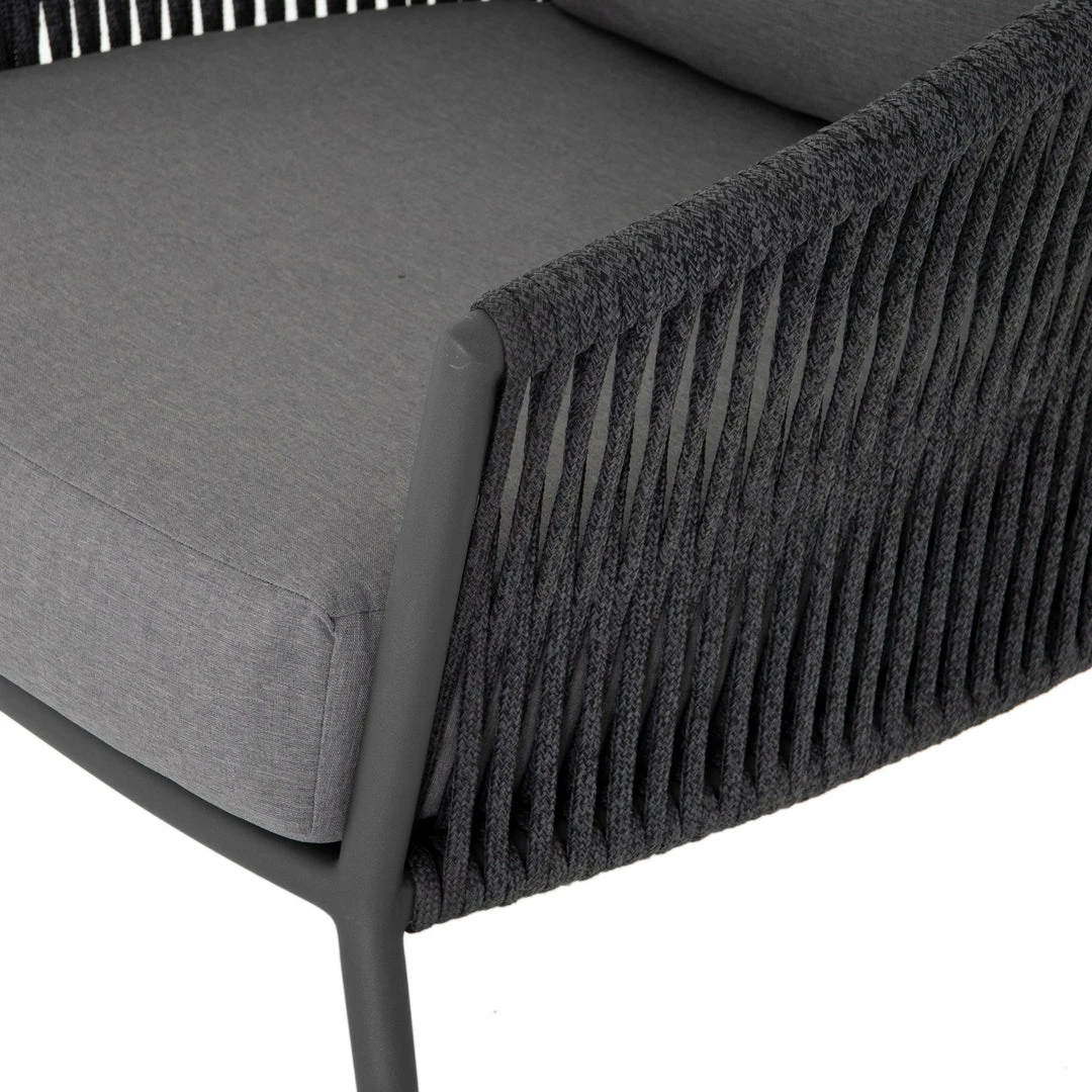 The perfect place for outdoor daydreaming. A beautiful rope-based design is woven across a durable aluminum frame in a rich bronze finish. Topped with a wide cushion and throw pillow, all upholstered in 100% Olefin, known for its UV-resistant, water-repellent and quick-drying abilities. Cover or store indoors during inclement weather and when not in use.