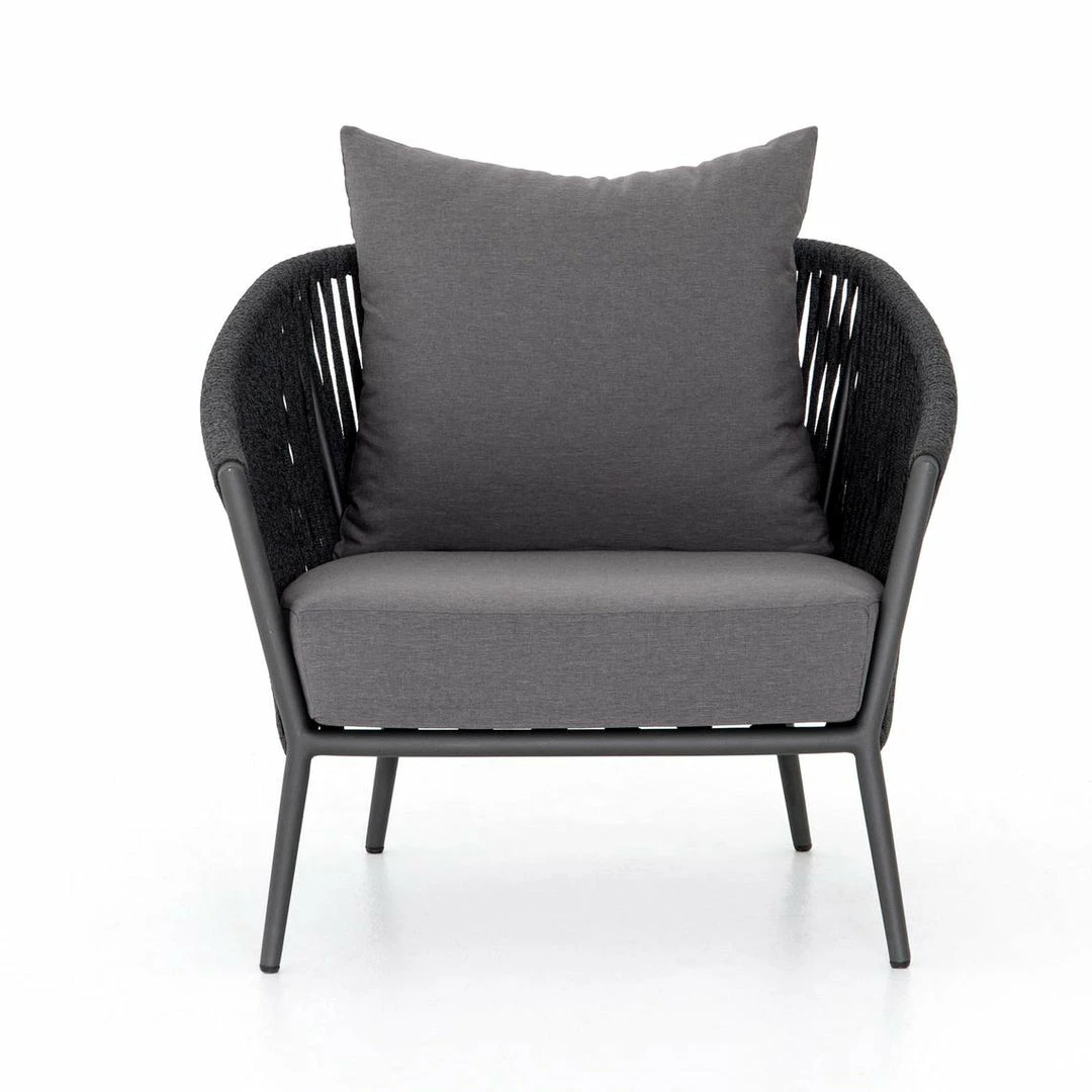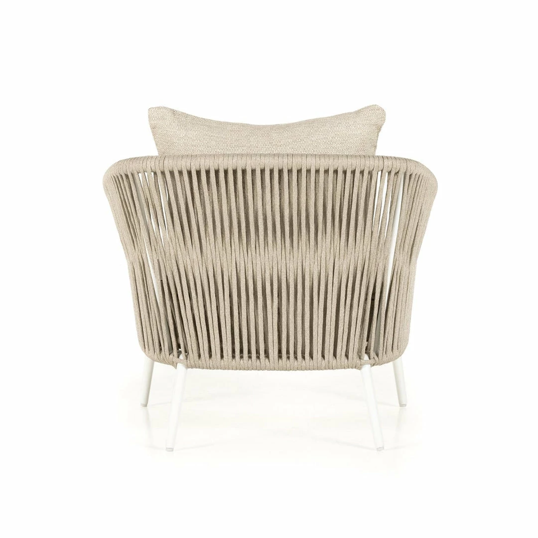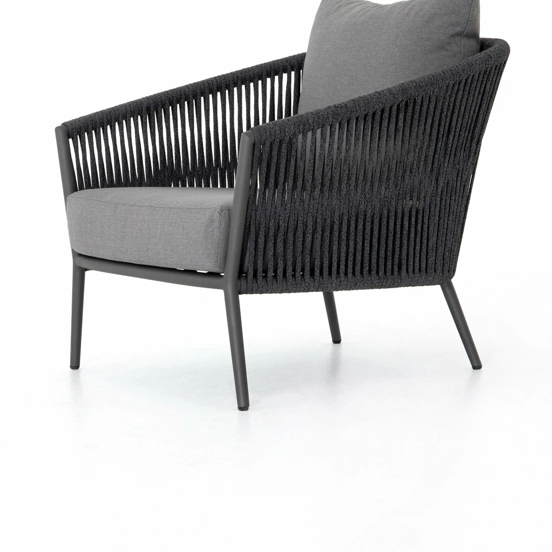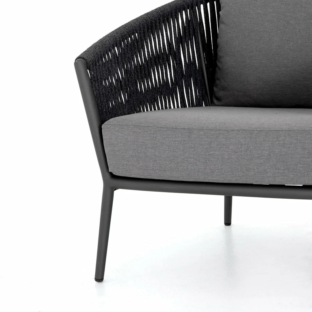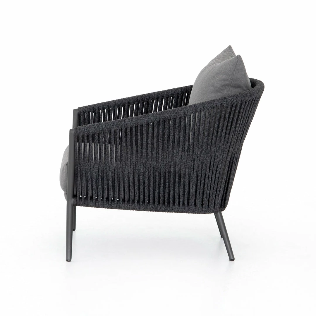 The perfect place for outdoor daydreaming. A beautiful rope-based design is woven across a durable aluminum frame in a rich bronze finish. Topped with a wide cushion and throw pillow, all upholstered in 100% Olefin, known for its UV-resistant, water-repellent and quick-drying abilities. Cover or store indoors during inclement weather and when not in use.