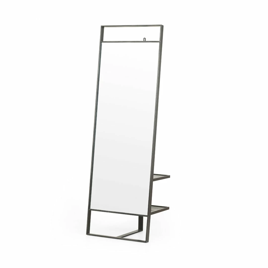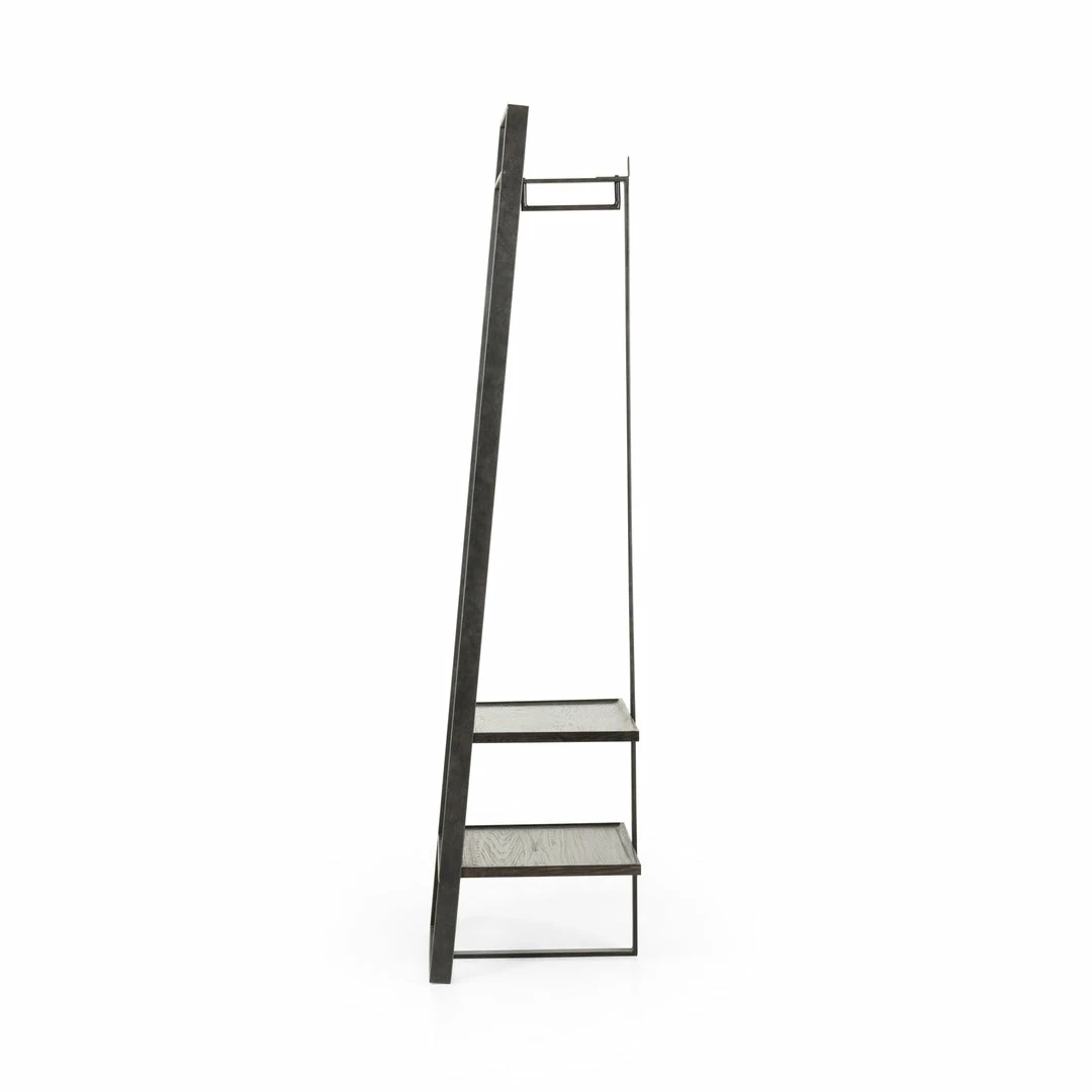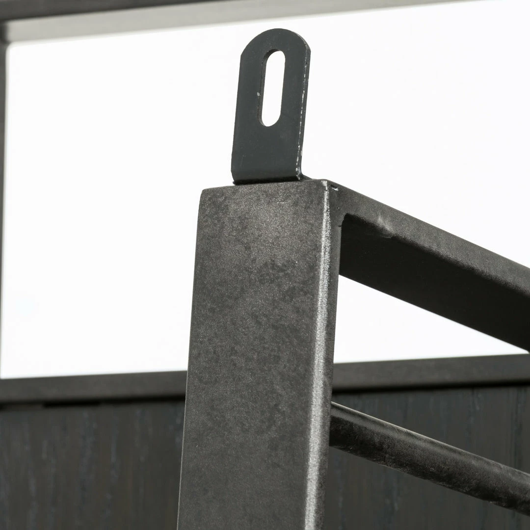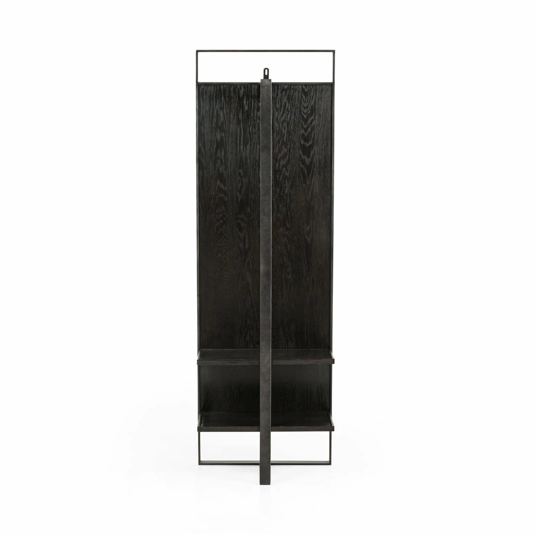 Reflect style and function alike. Behind a rectangular mirror framed in a rustic black finish, dual shelves and a single rack await clothing and shoes – perfect for planning the next day’s attire.
