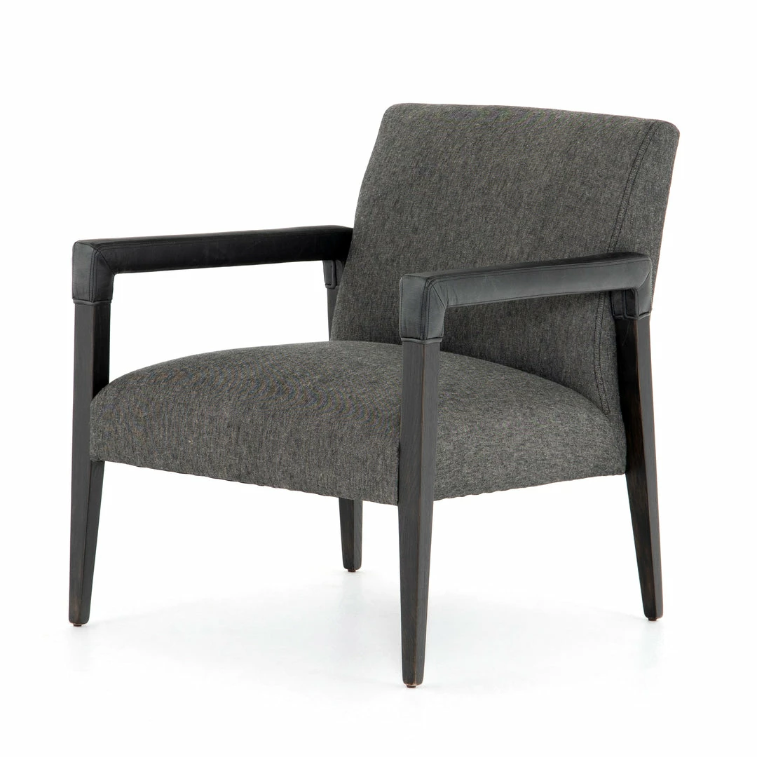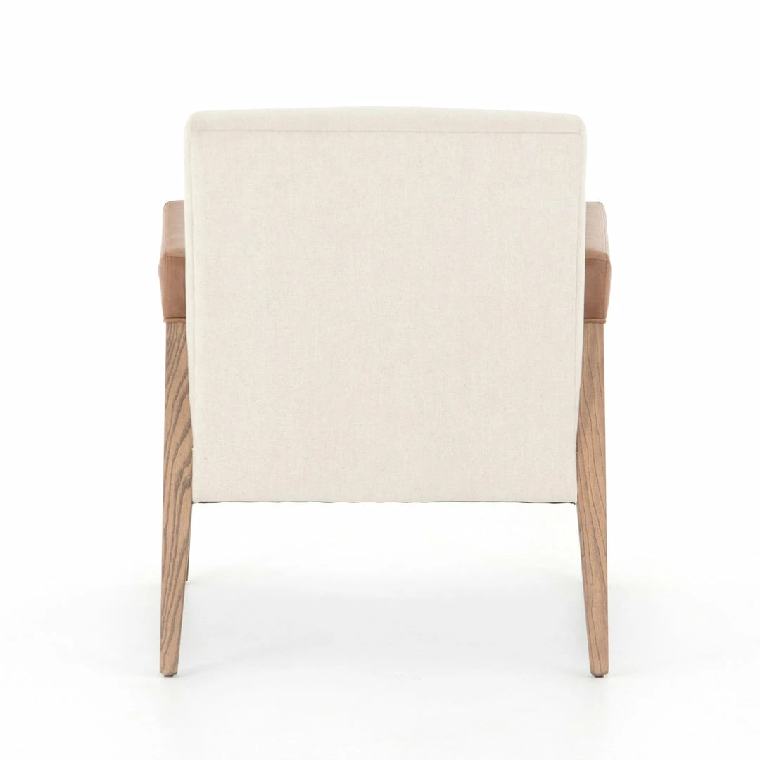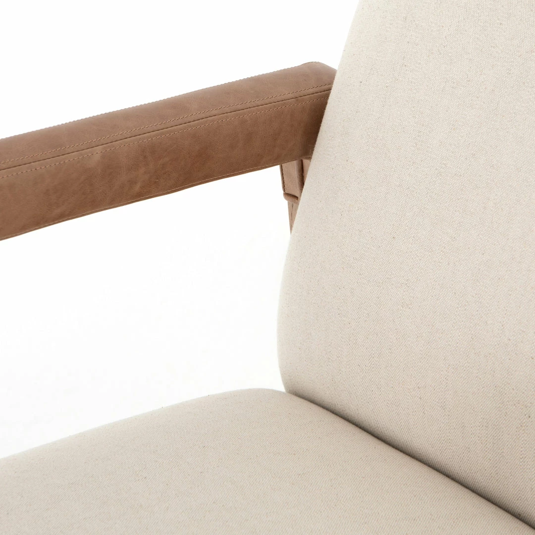 Elegance is no exaggeration. Slim, tapered nettlewood with arms wrapped in vintage leather frames a floating seat covered in a natural cotton and linen blend.