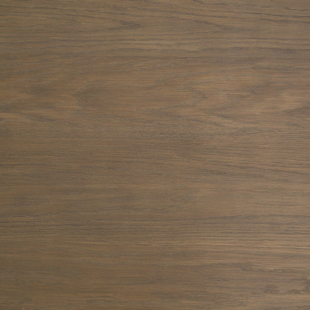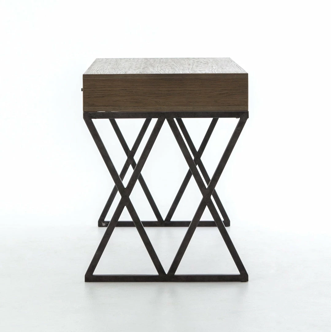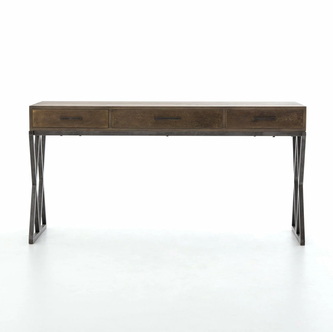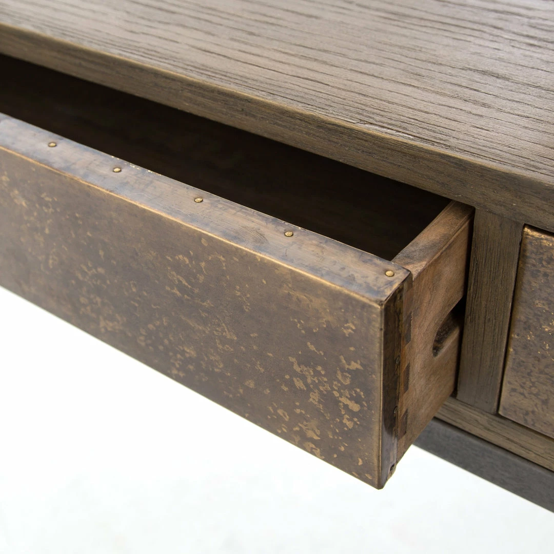 Distinctive lines, sleek scale, and ample storage. Greyed oak desktop contrasts with brass-clad drawer fronts in antiqued brass finish.