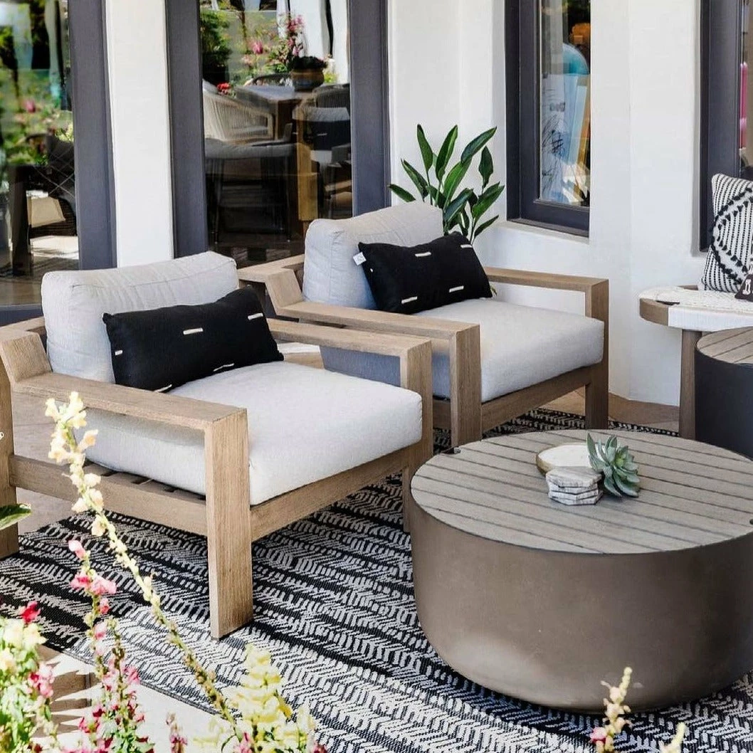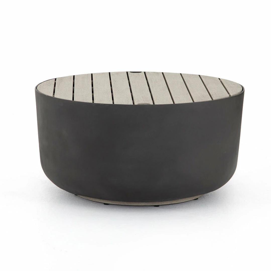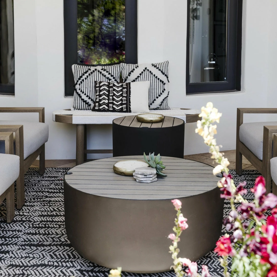 From handy surface to extra storage, a drum-style base of bronze-finished aluminum and removable grey teak top makes for a smart solution indoors or out. Single finger hole for easy top removal. Cover or store inside during inclement weather.