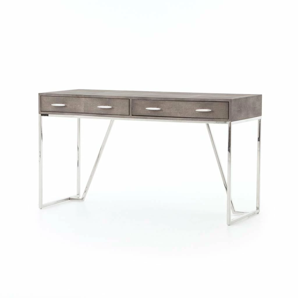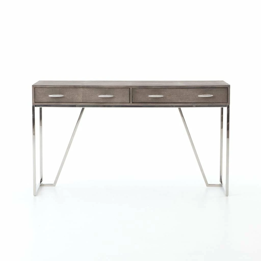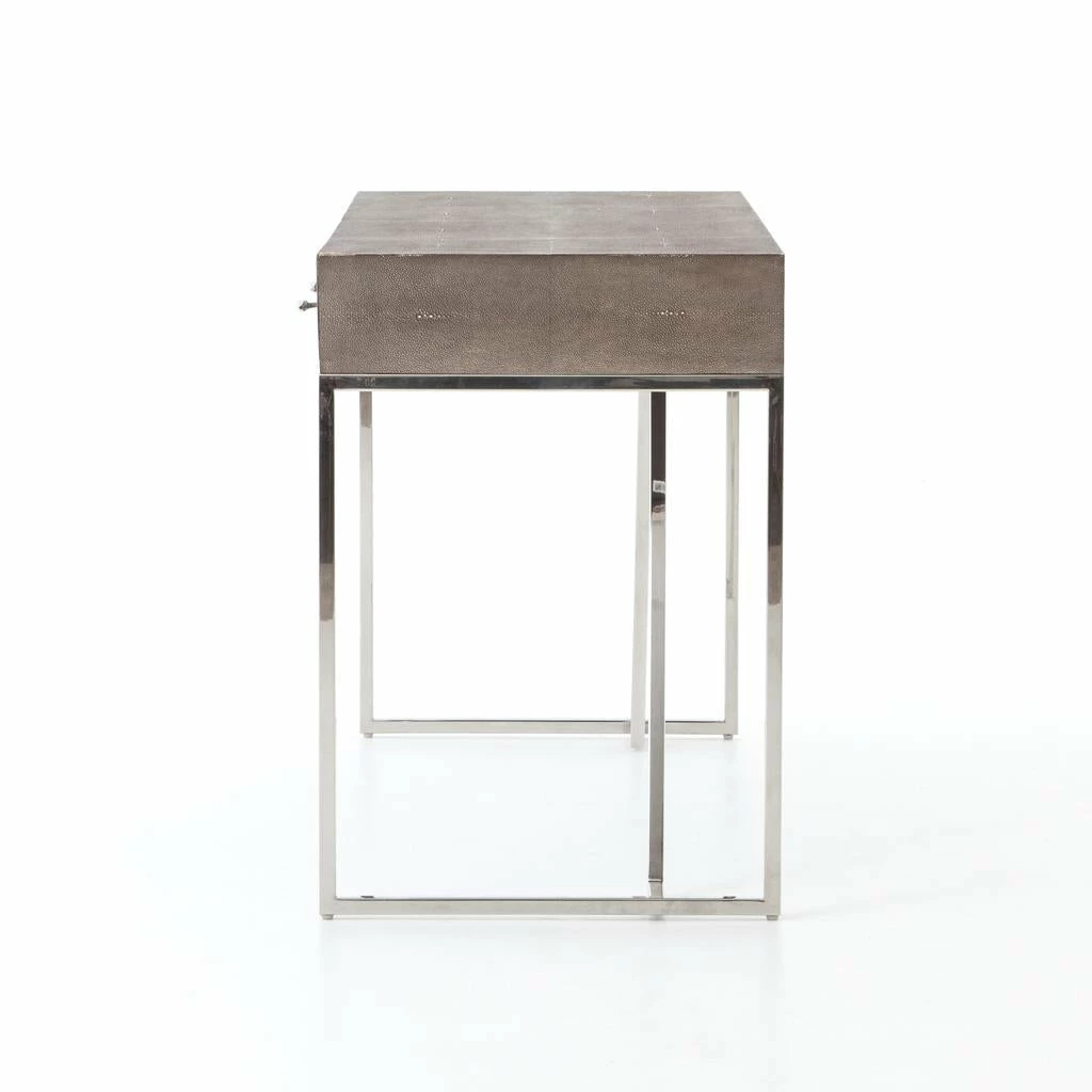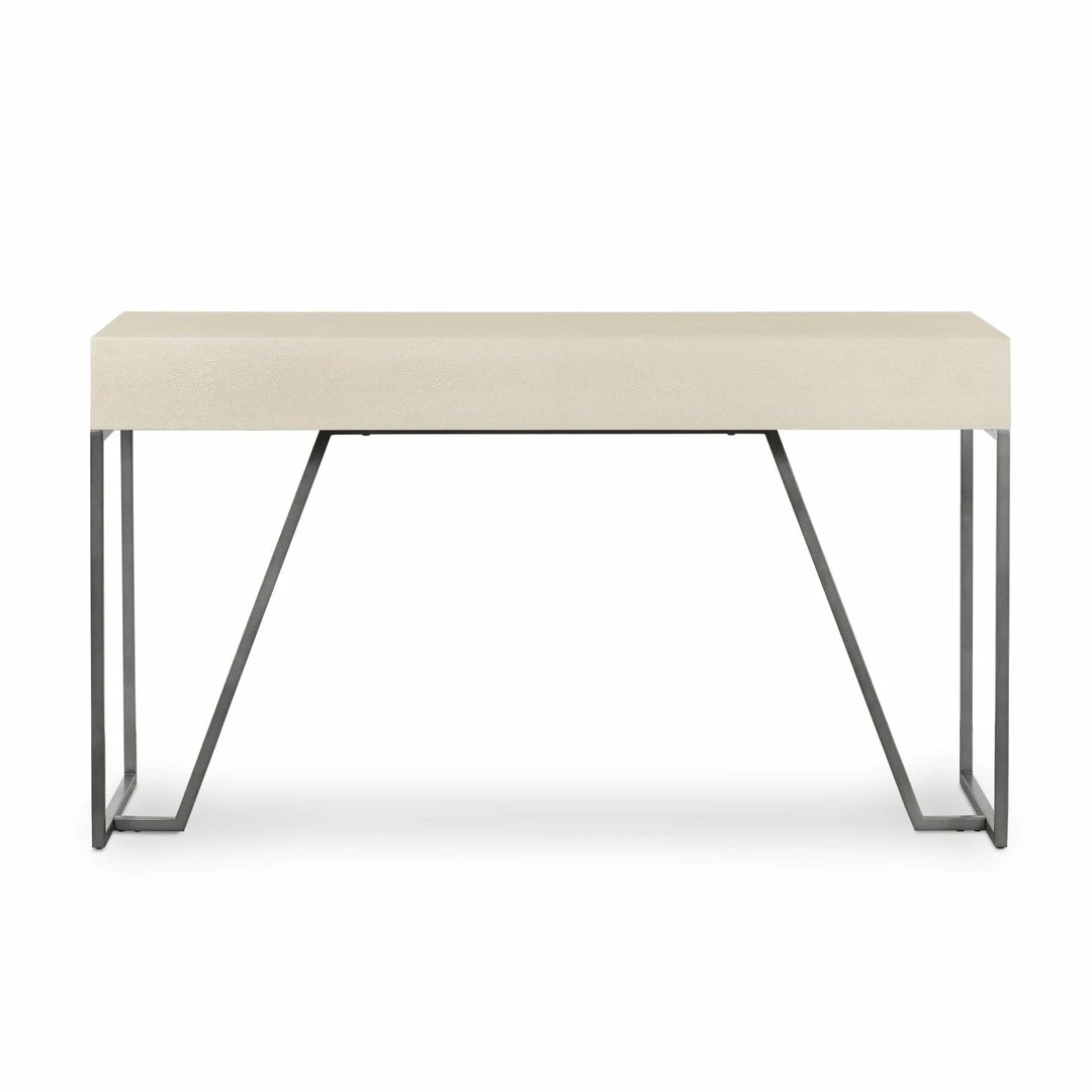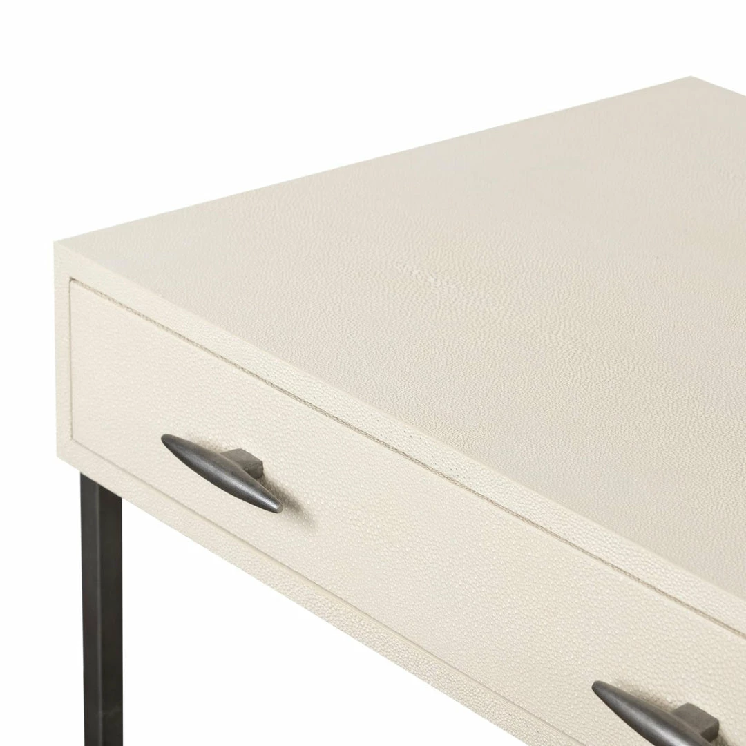 Scaled for utility, textured for style. A grey faux shagreen top floats over a shiny, angular iron base finished in an antique brass.