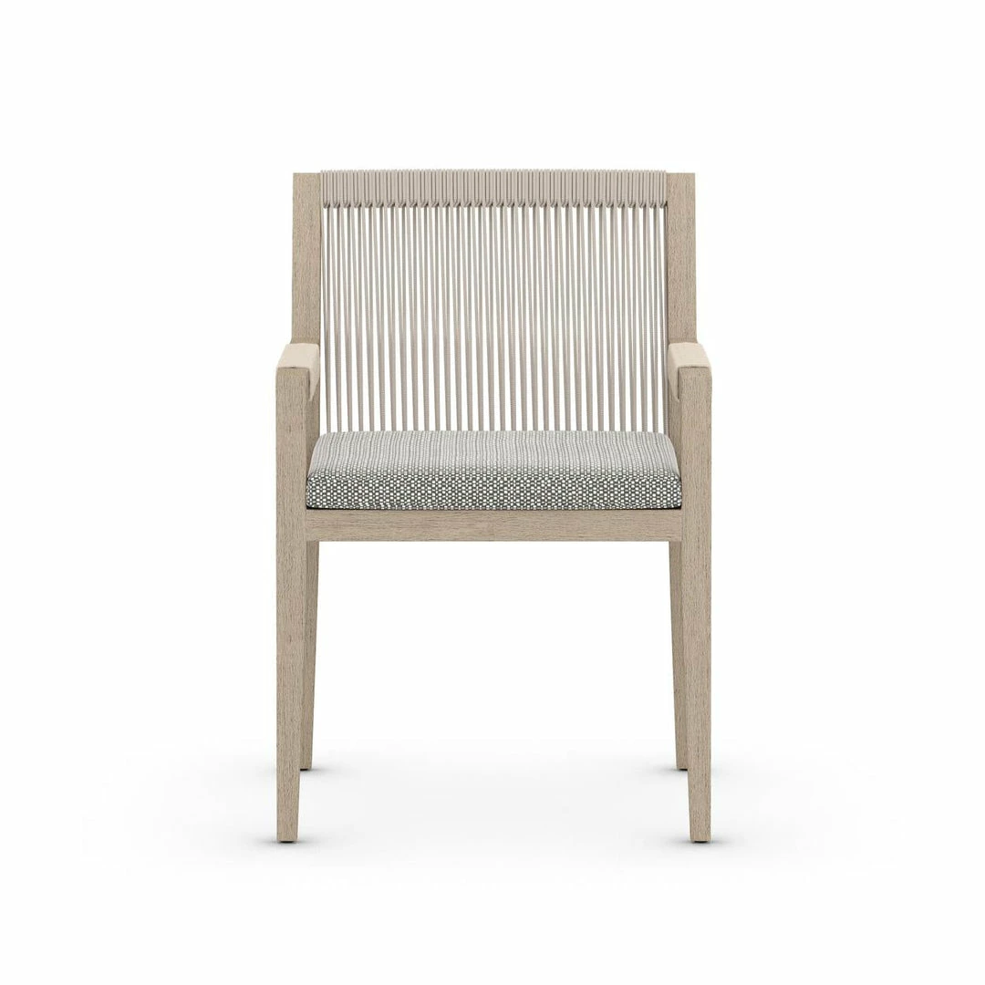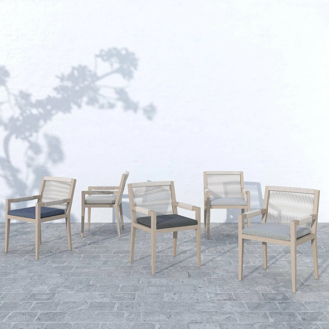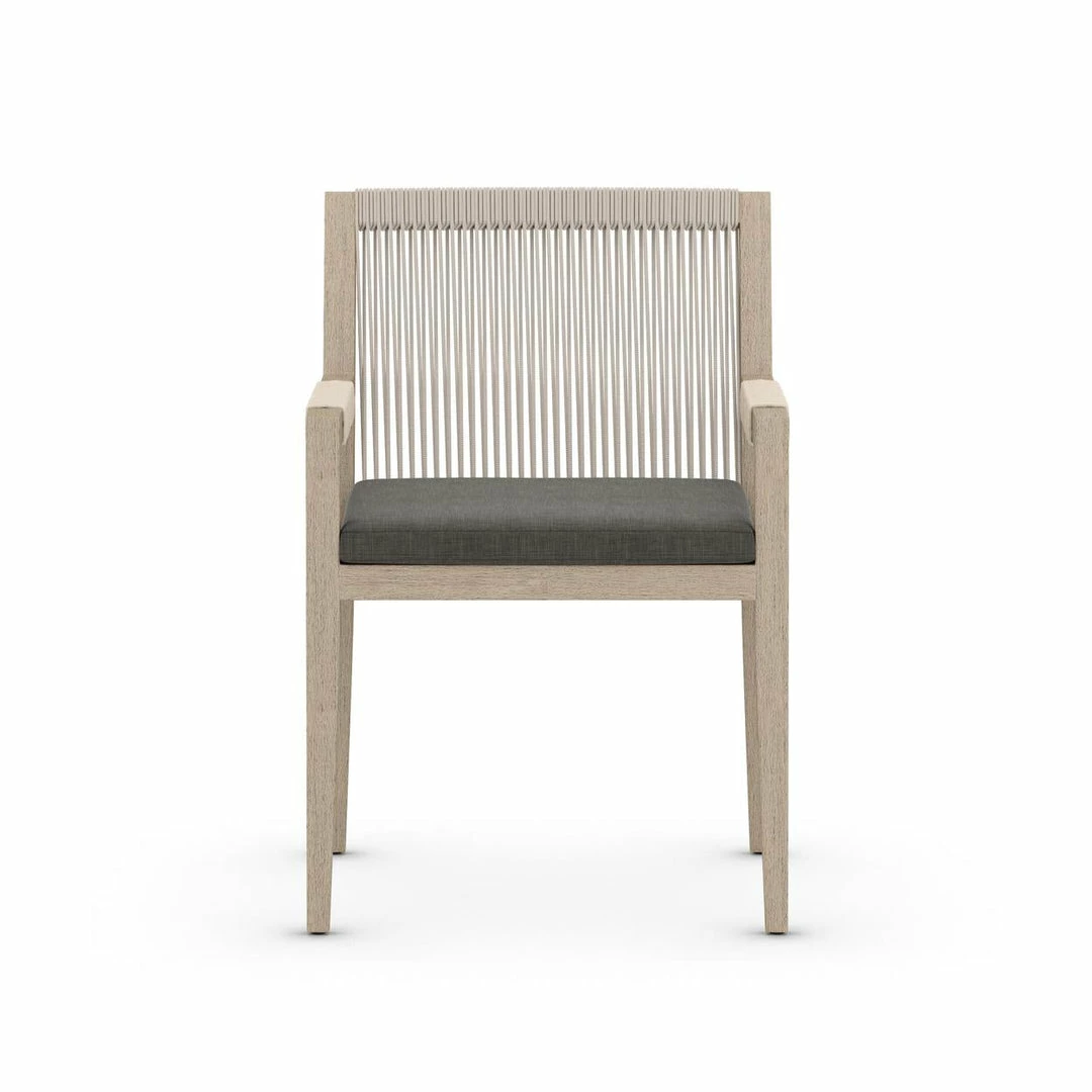 Modern materials ready a stylish silhouette for outdoor dining. Washed brown teak forms a clean frame for UV-resistant and water-repellent Sunproof fabric in a deep charcoal. Cover or store indoors during inclement weather.