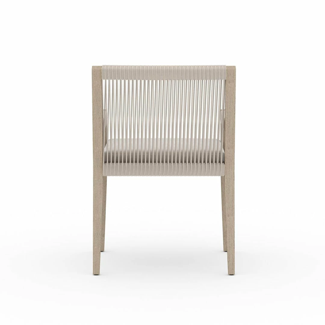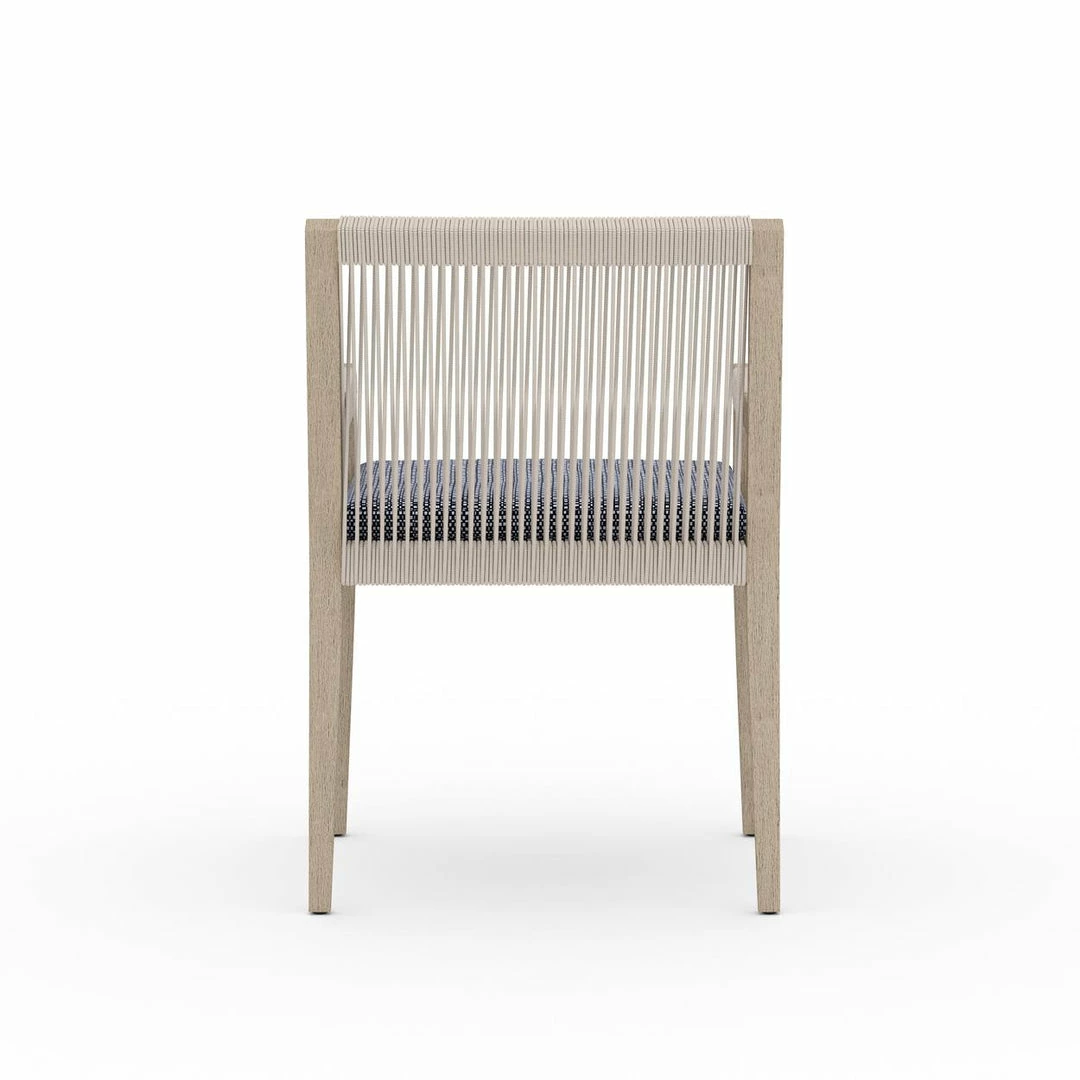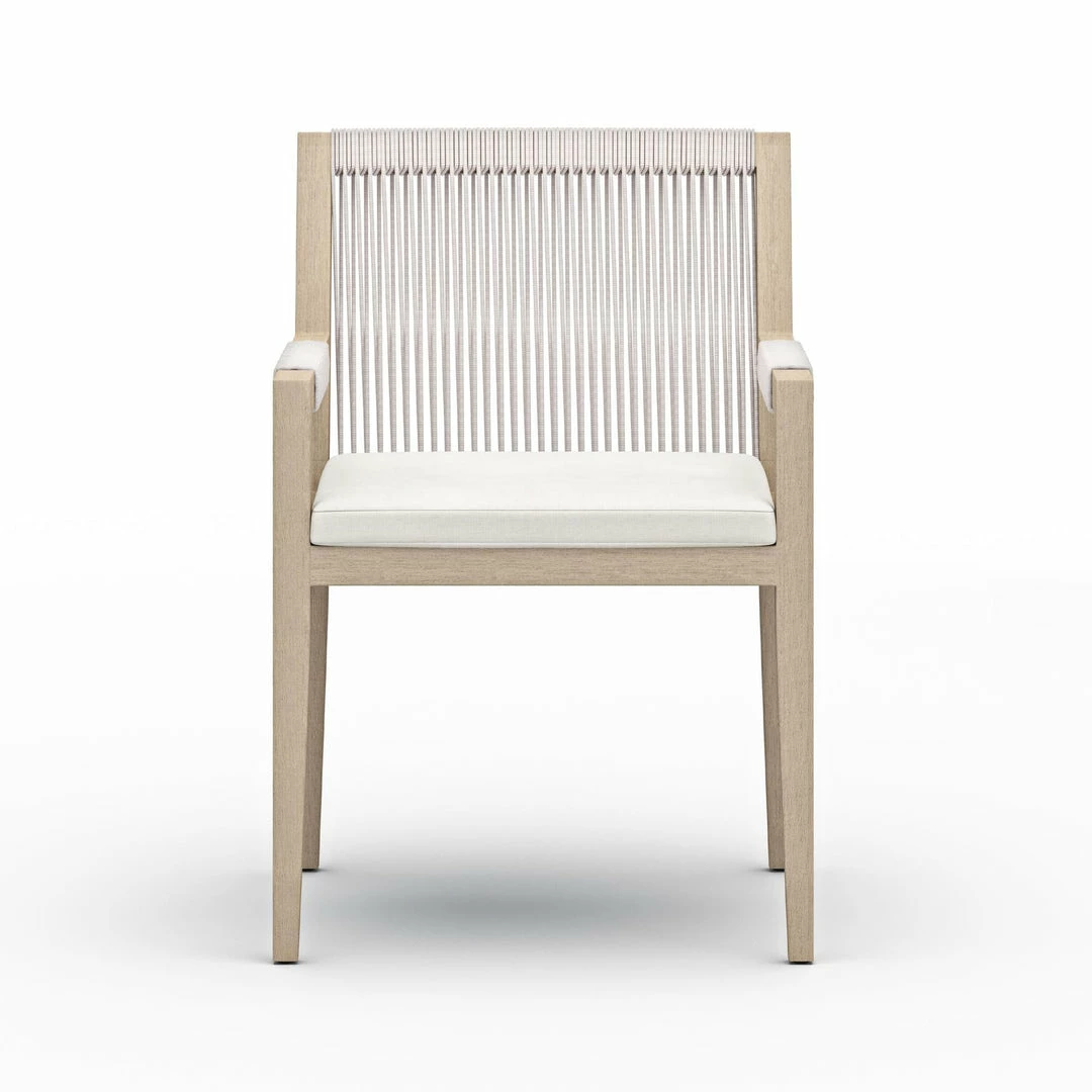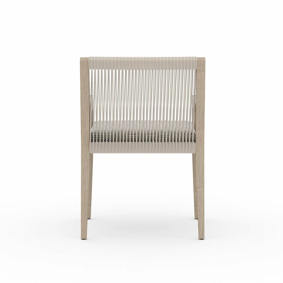Modern materials ready a stylish silhouette for outdoor dining. Washed brown teak forms a clean frame for UV-resistant and water-repellent Sunproof fabric in a deep charcoal. Cover or store indoors during inclement weather.