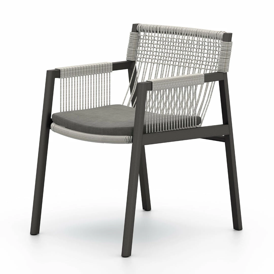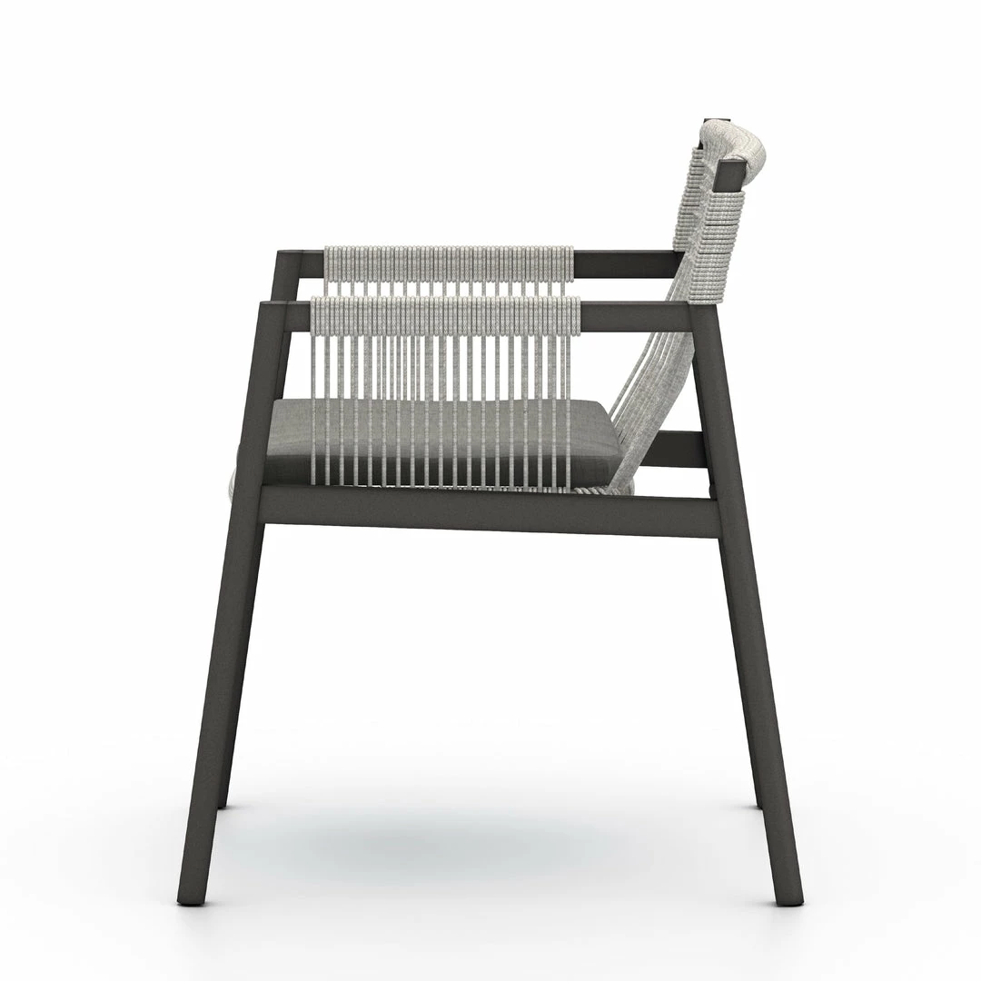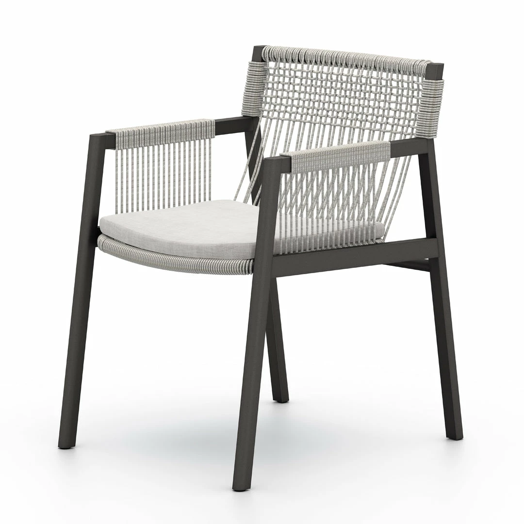 Eyecatching from every angle. Heathered rope is woven at varying widths along the back, sides and arms of this outdoor dining chair for linear detailing all around. Outdoor-friendly aluminum frame with removable seat cushion covered in UV-resistant, water-repellent fabric. Cover or store inside during inclement weather and when not in use.