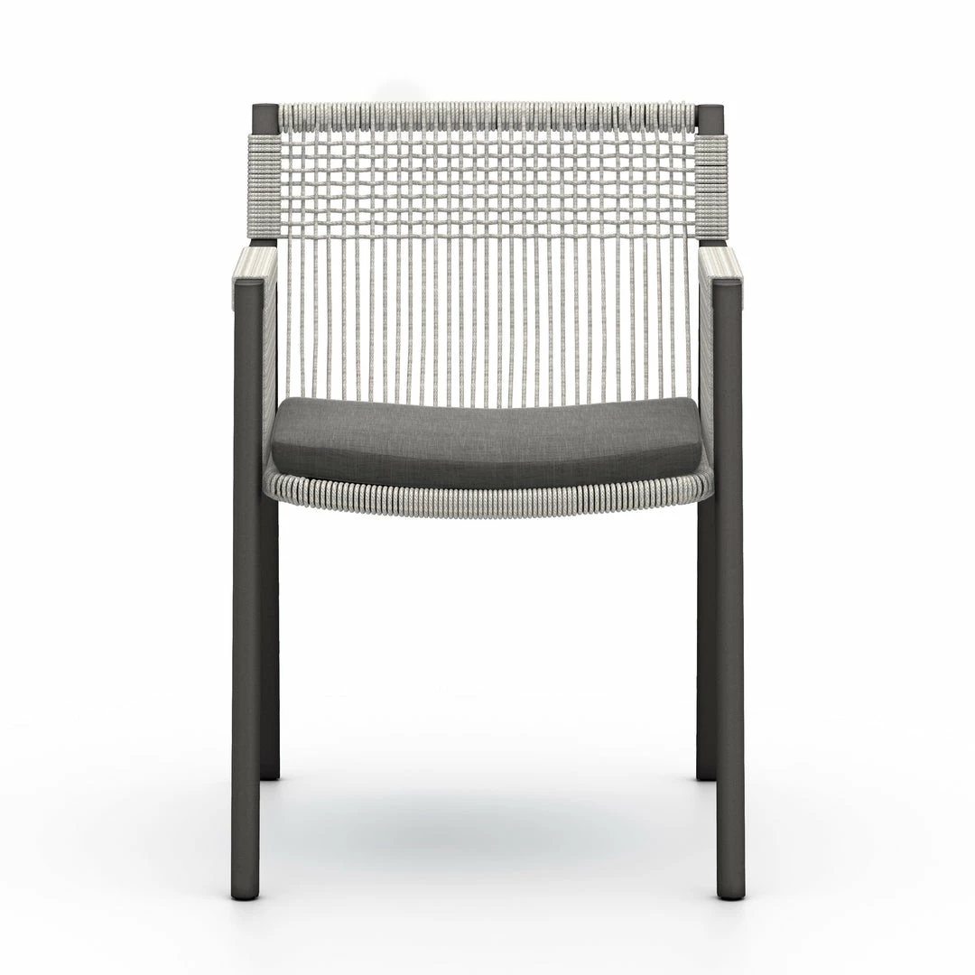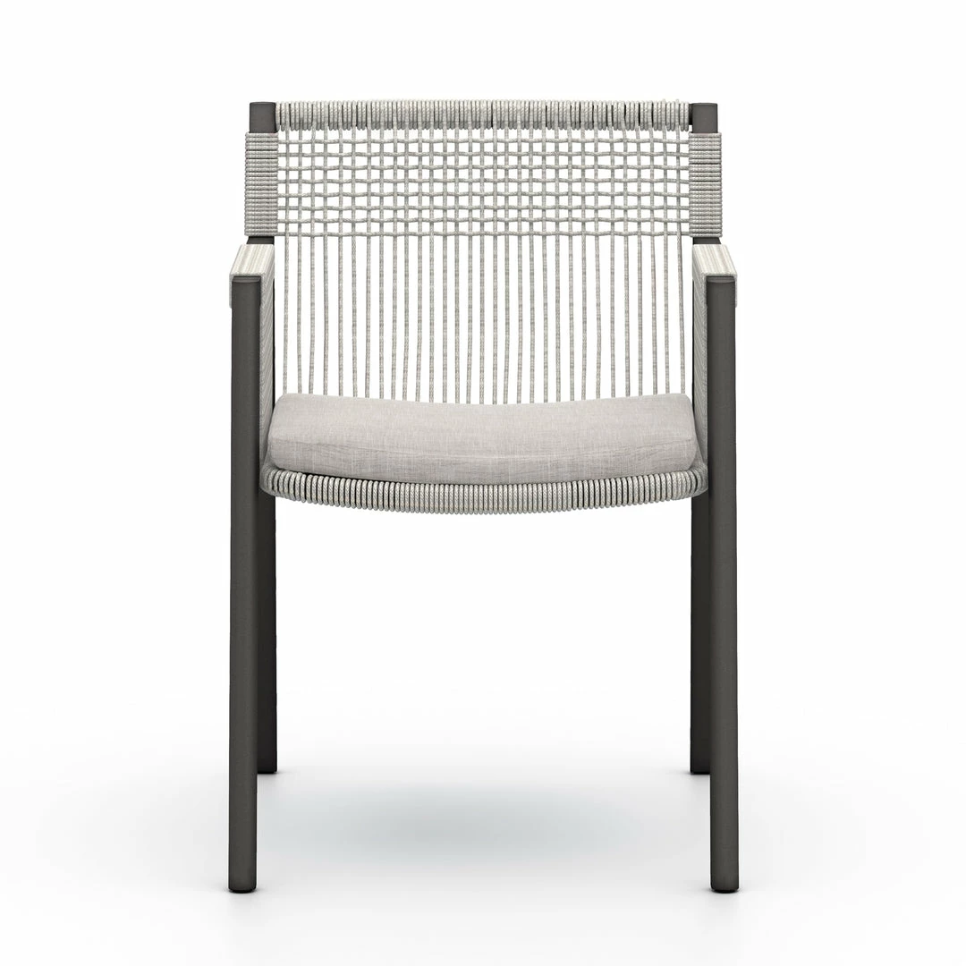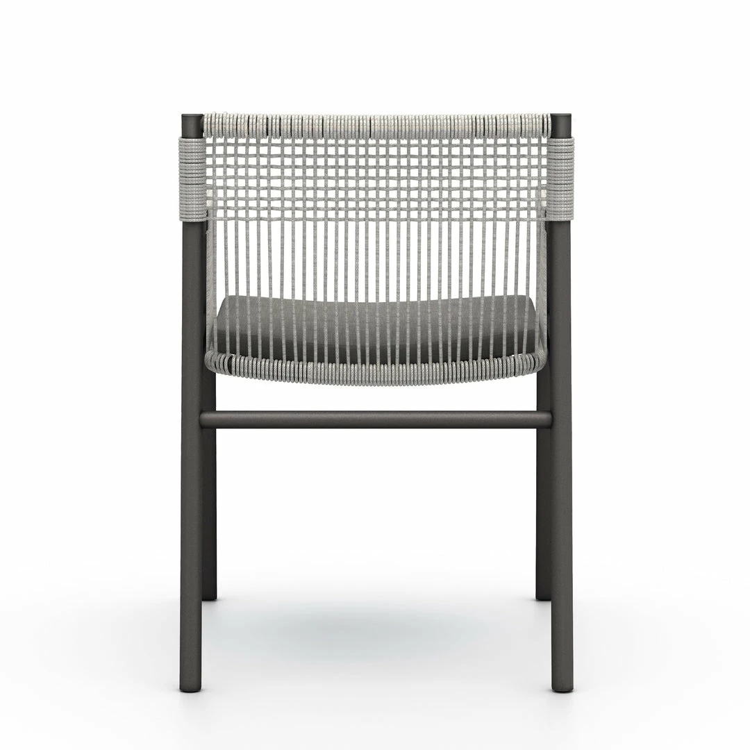 Eyecatching from every angle. Heathered rope is woven at varying widths along the back, sides and arms of this outdoor dining chair for linear detailing all around. Outdoor-friendly aluminum frame with removable seat cushion covered in UV-resistant, water-repellent fabric. Cover or store inside during inclement weather and when not in use.