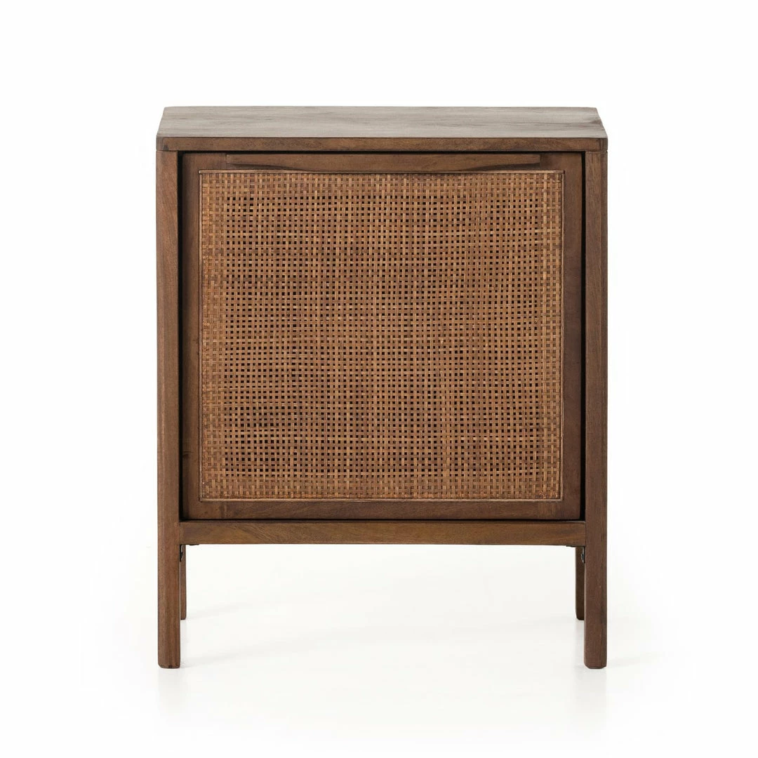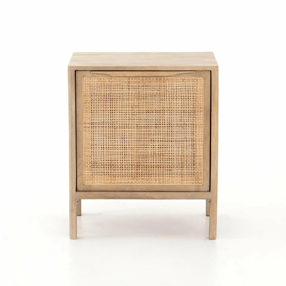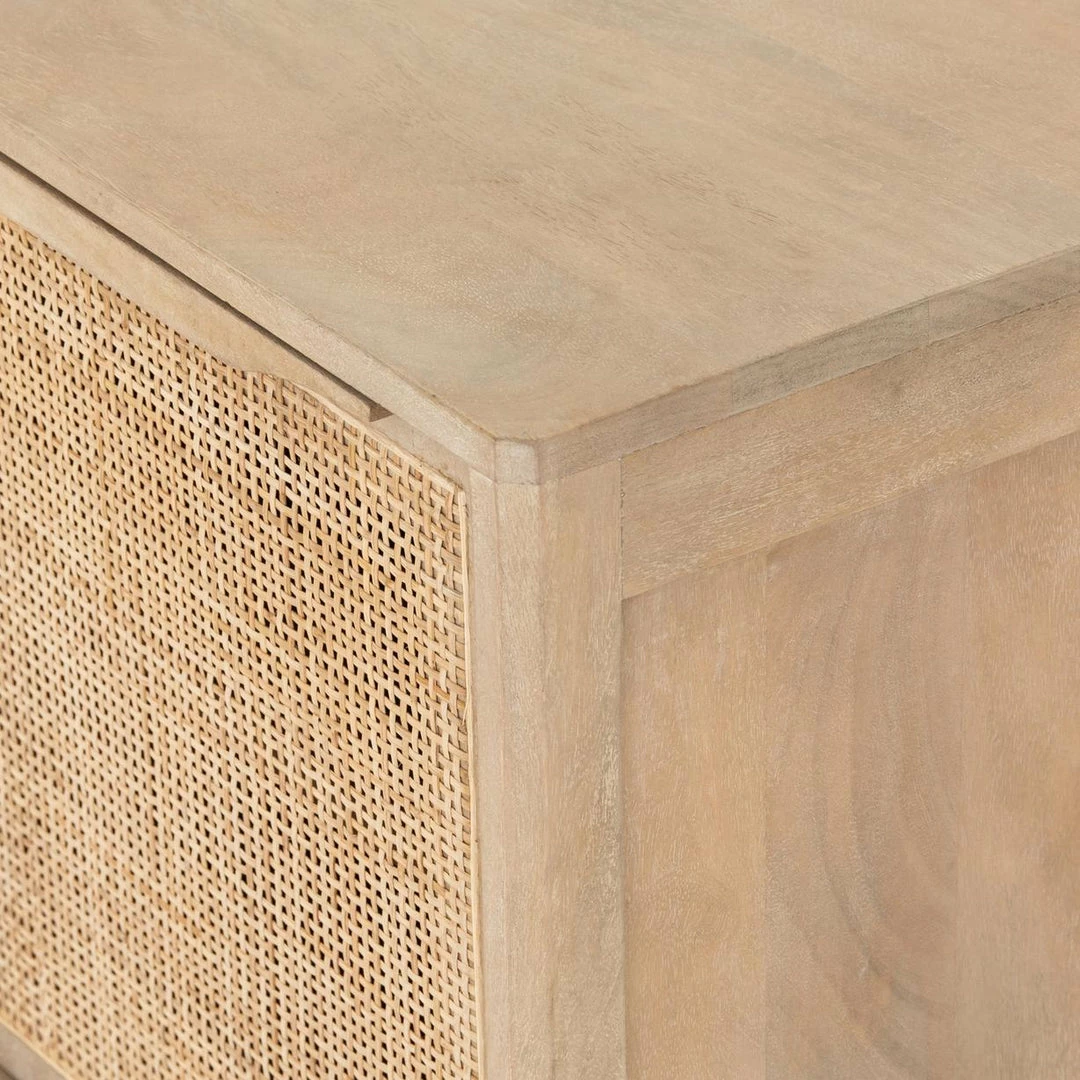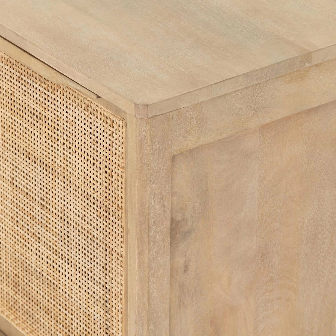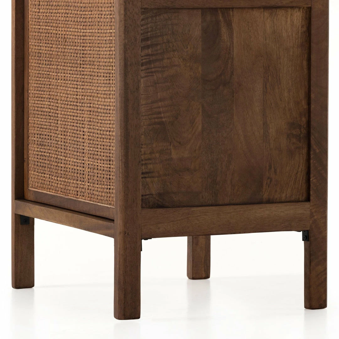 Natural mango frames inset woven cane, for a light, textural look with fresh organic allure. Removable interior shelf for clever convenience.
