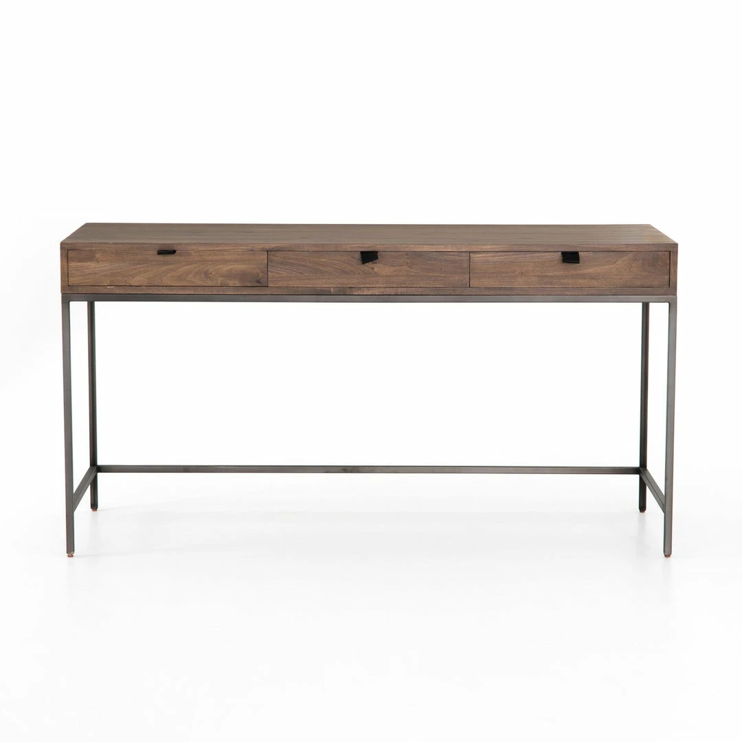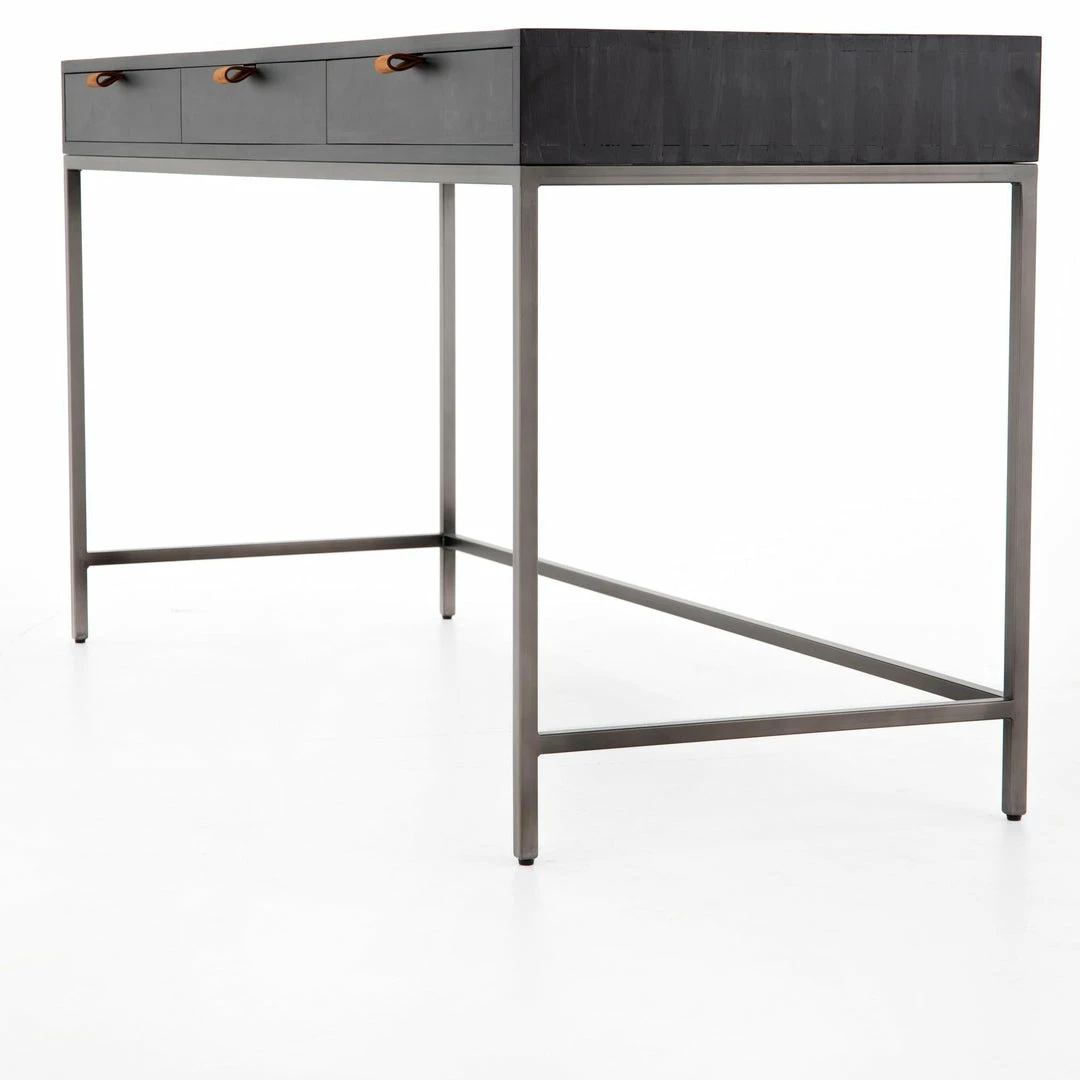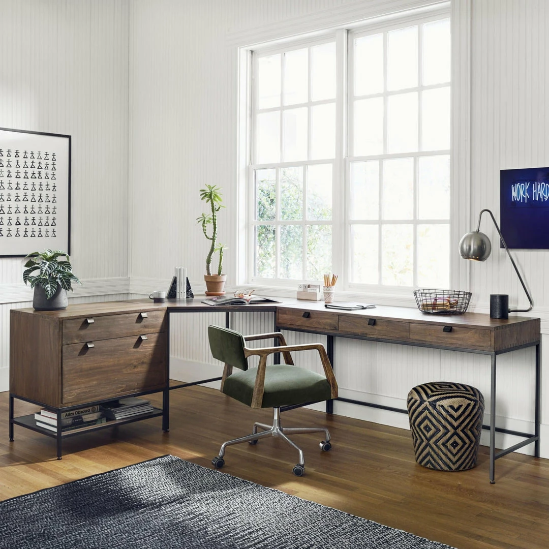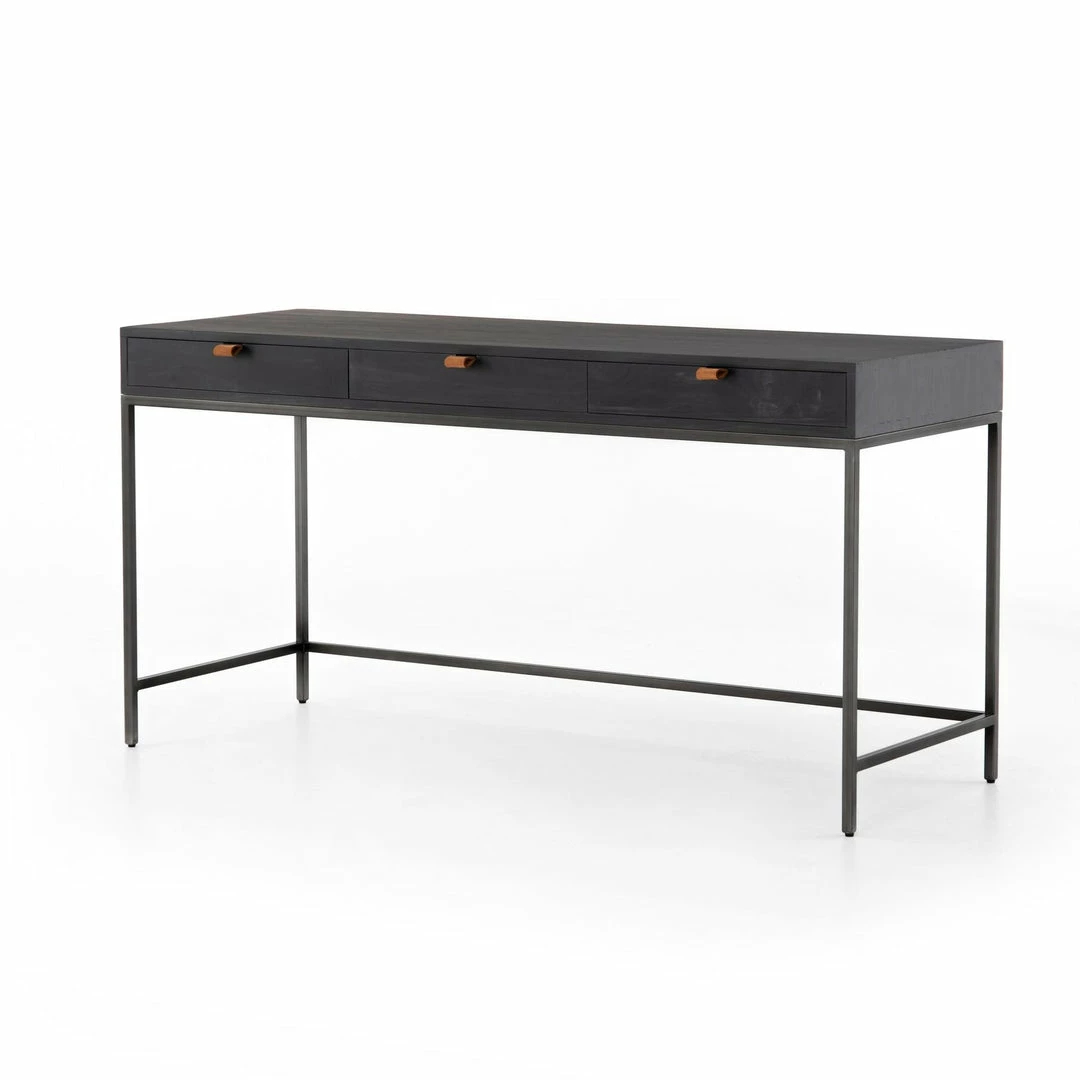 Inspired by clean mid-century design, greyish auburn poplar offers generous desk storage by way of three spacious drawers, with a fully finished back plus metal-secured leather pulls for an element of surprise. Great solo or paired with matching corner desk, file cabinet or credenza.