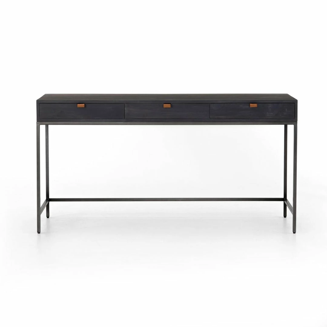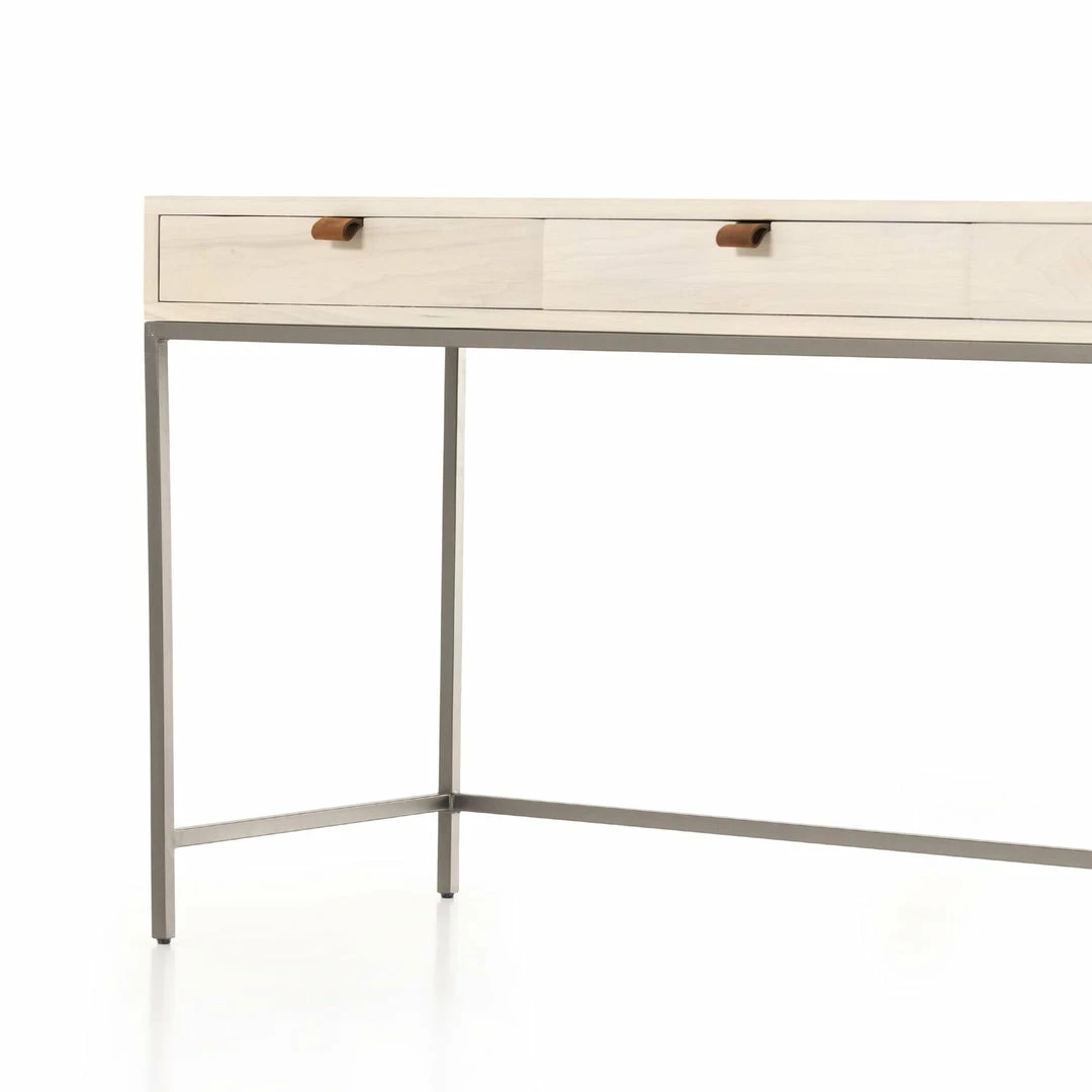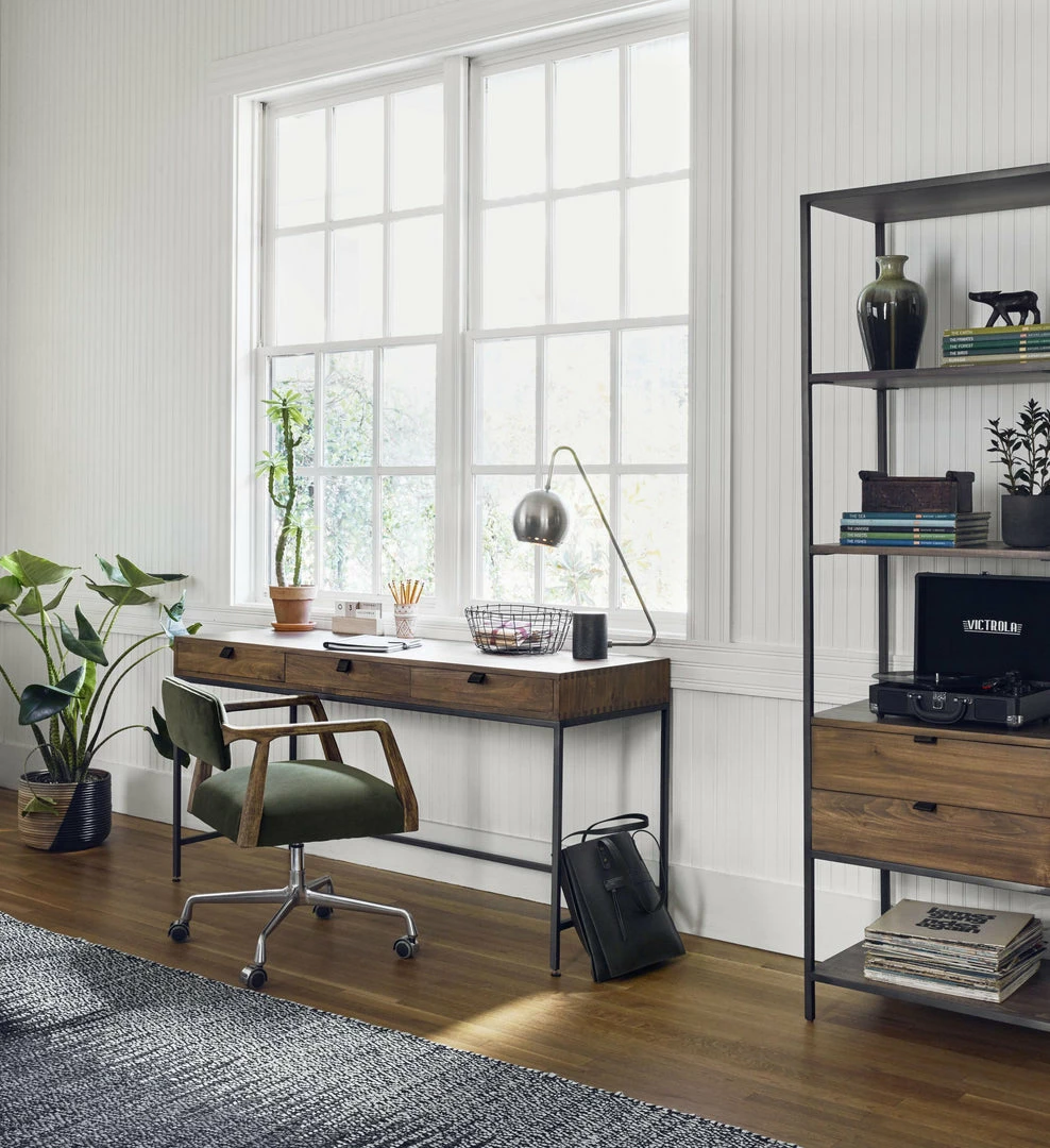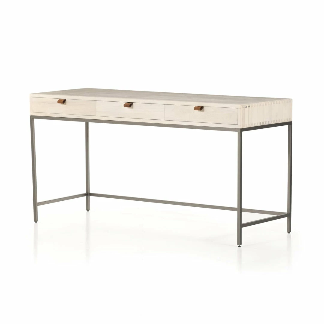 Inspired by clean mid-century design, greyish auburn poplar offers generous desk storage by way of three spacious drawers, with a fully finished back plus metal-secured leather pulls for an element of surprise. Great solo or paired with matching corner desk, file cabinet or credenza.