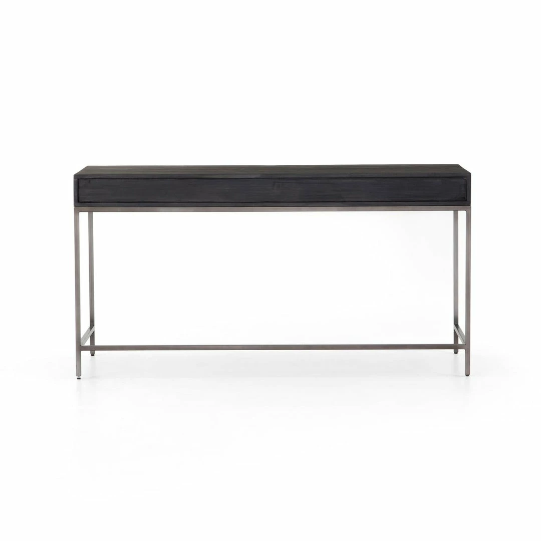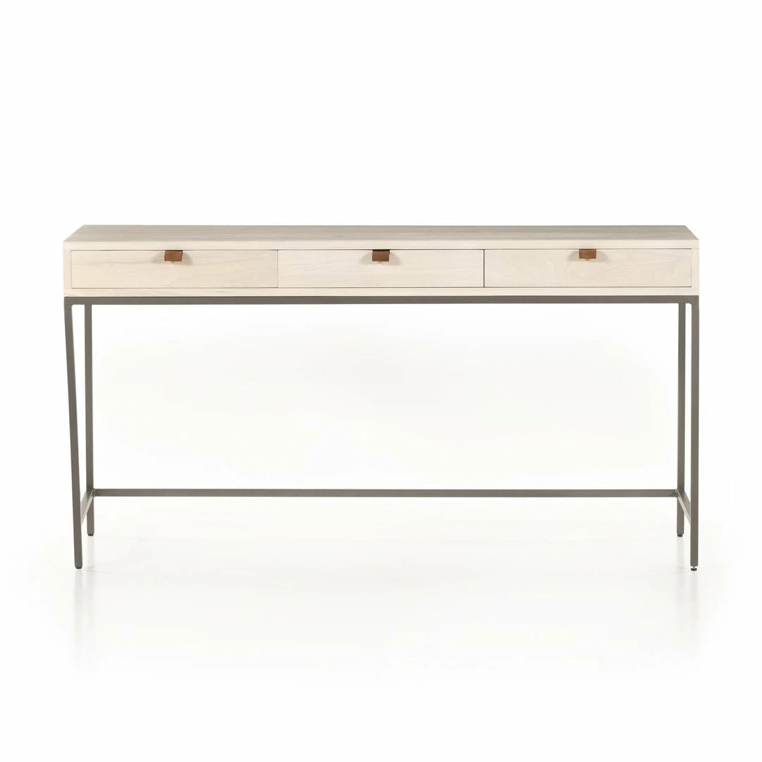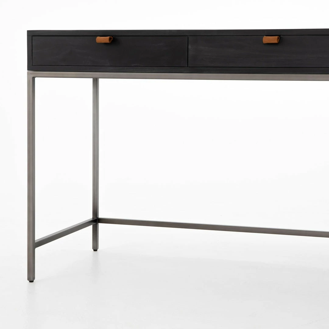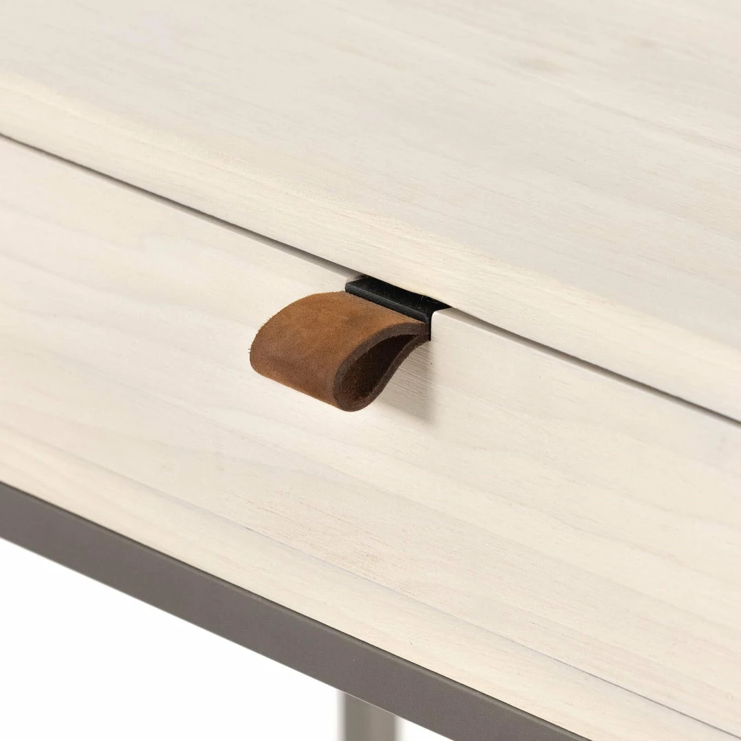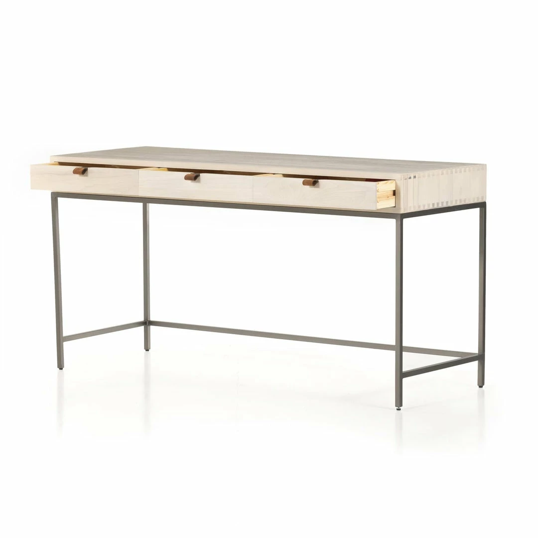 Inspired by clean mid-century design, greyish auburn poplar offers generous desk storage by way of three spacious drawers, with a fully finished back plus metal-secured leather pulls for an element of surprise. Great solo or paired with matching corner desk, file cabinet or credenza.