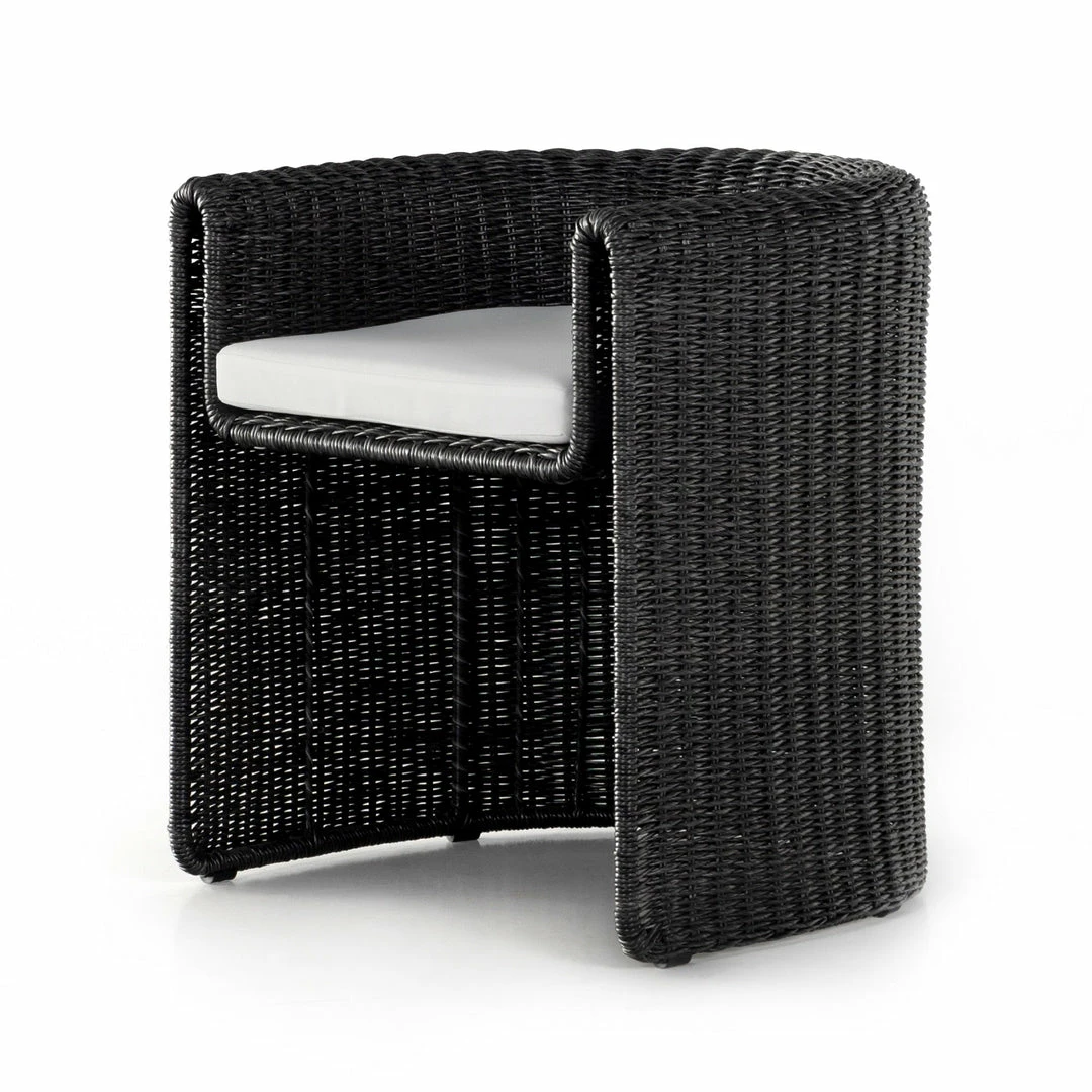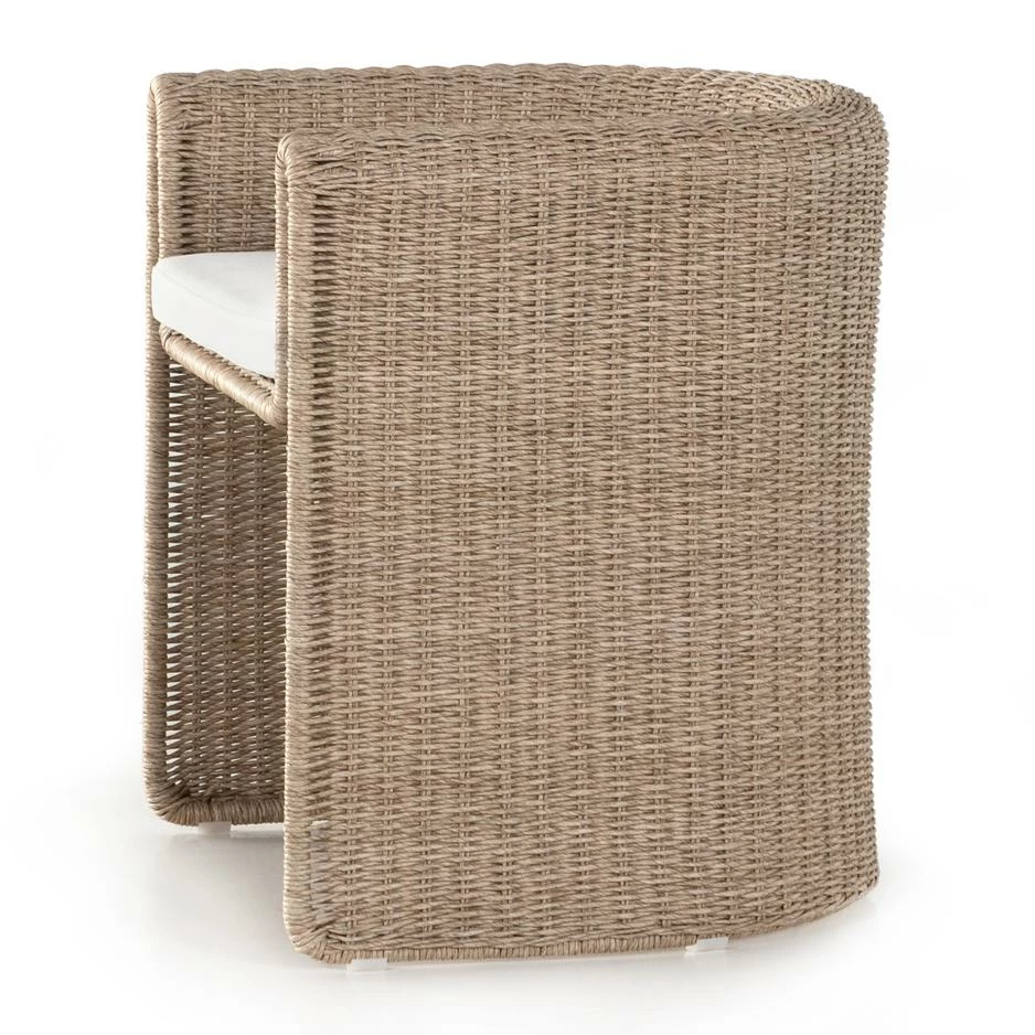 A nod to curvy Seventies styling, woven wicker framing forms a fluid, sling-like shape and waterfall arm, with durable tufted cushioning in a versatile white. Cover or store indoors during inclement weather and when not in use.