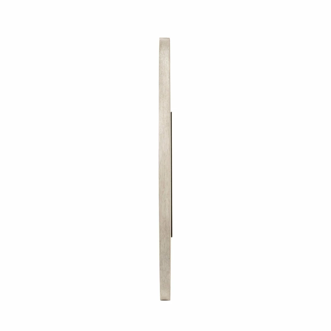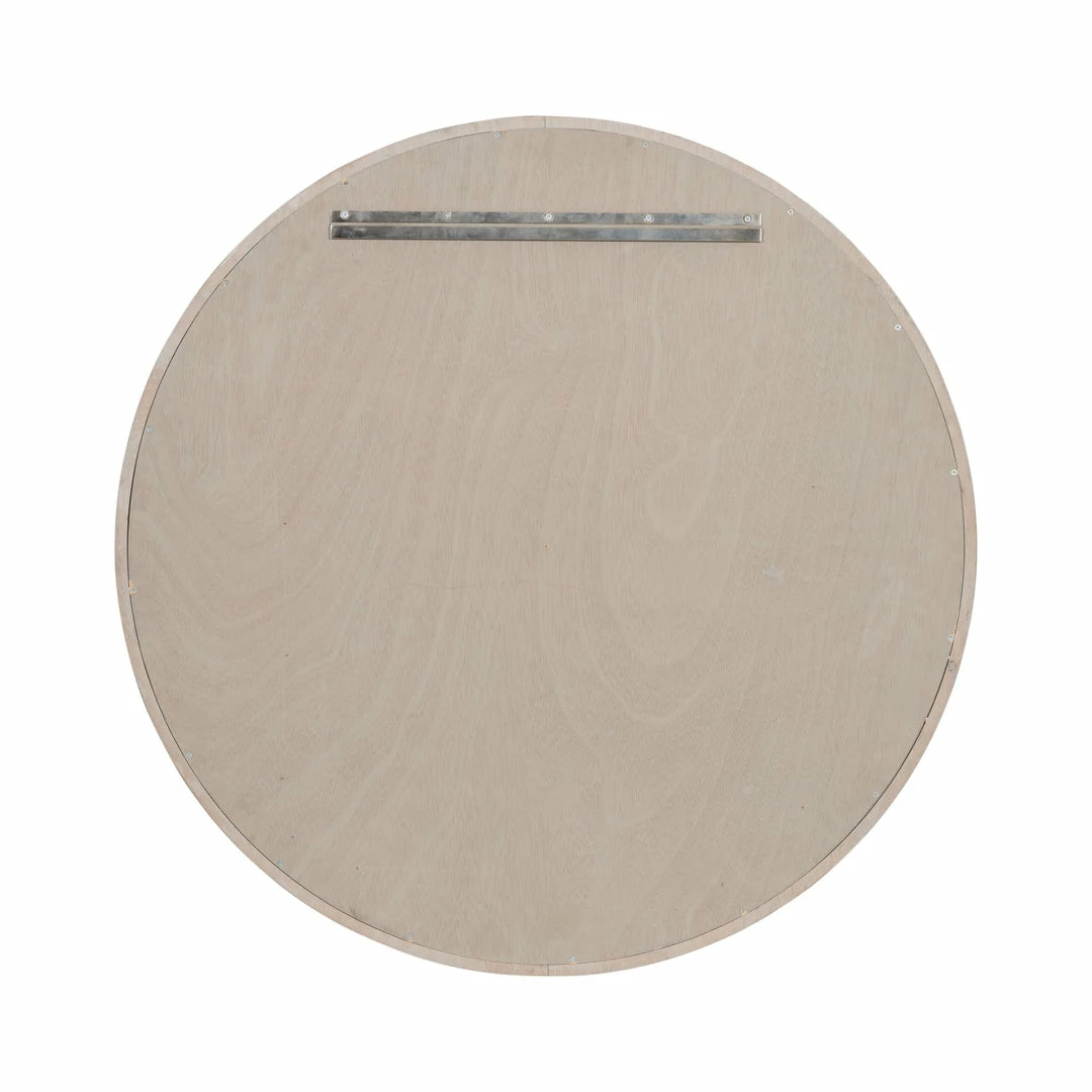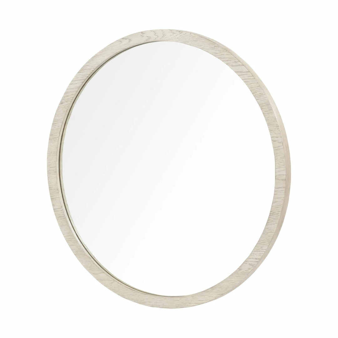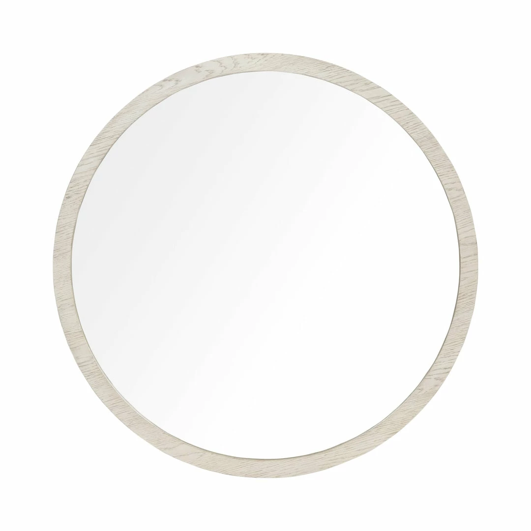 A rounded mirror of white-finished solid oak reflects elegance in any space.