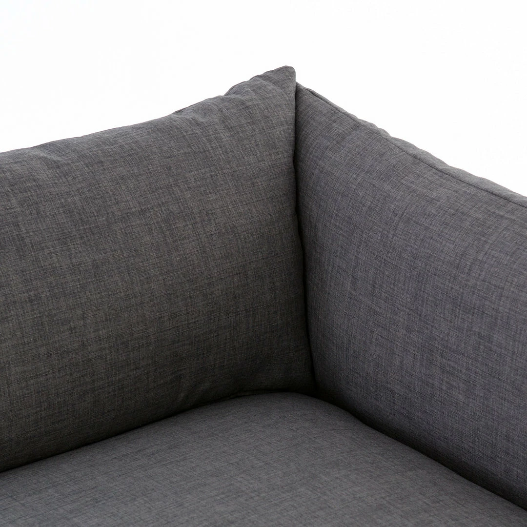 The ultimate low-and-deep lounger. Knife edge cushioning is upholstered in an easy-to-clean charcoal high performance fabric suited for modern living.