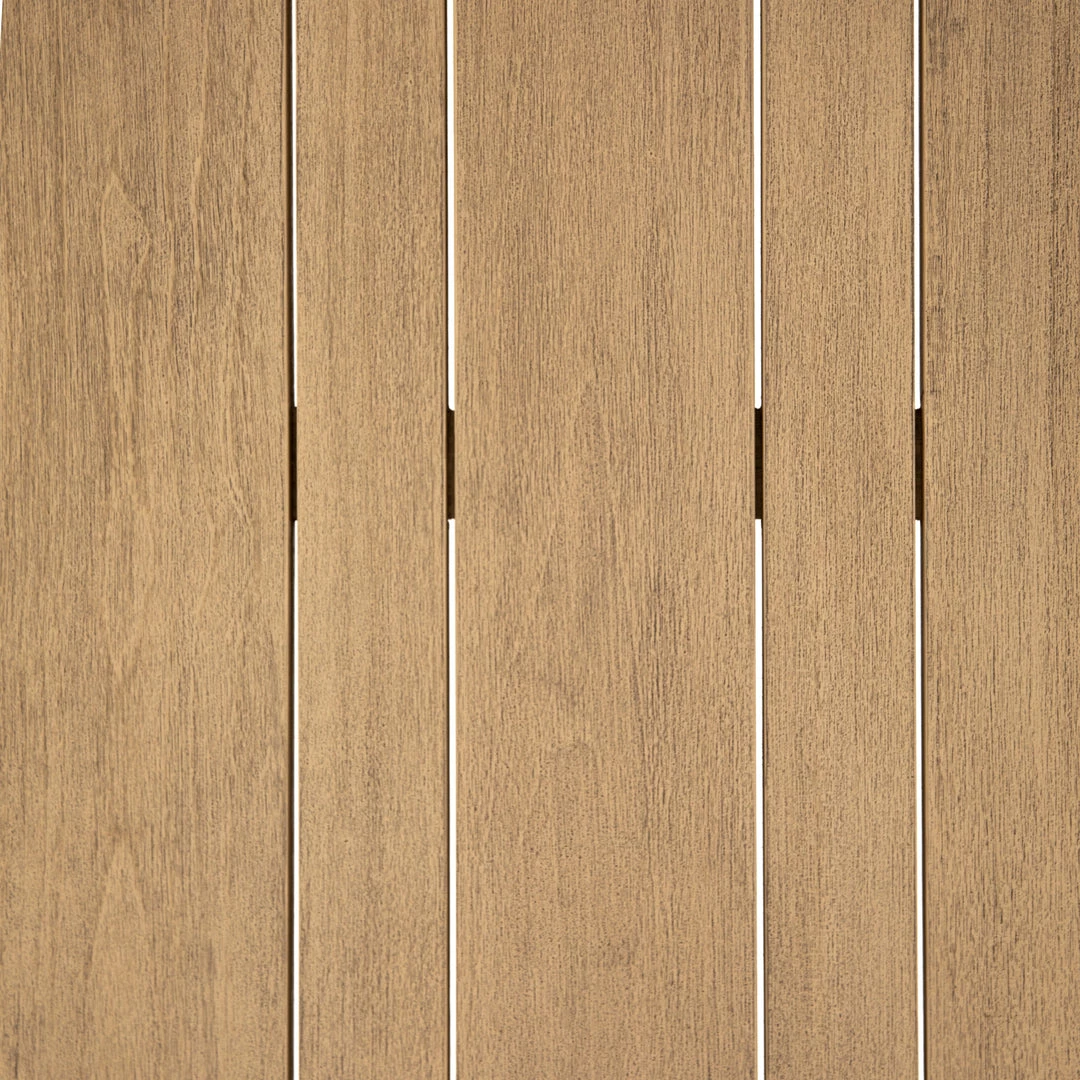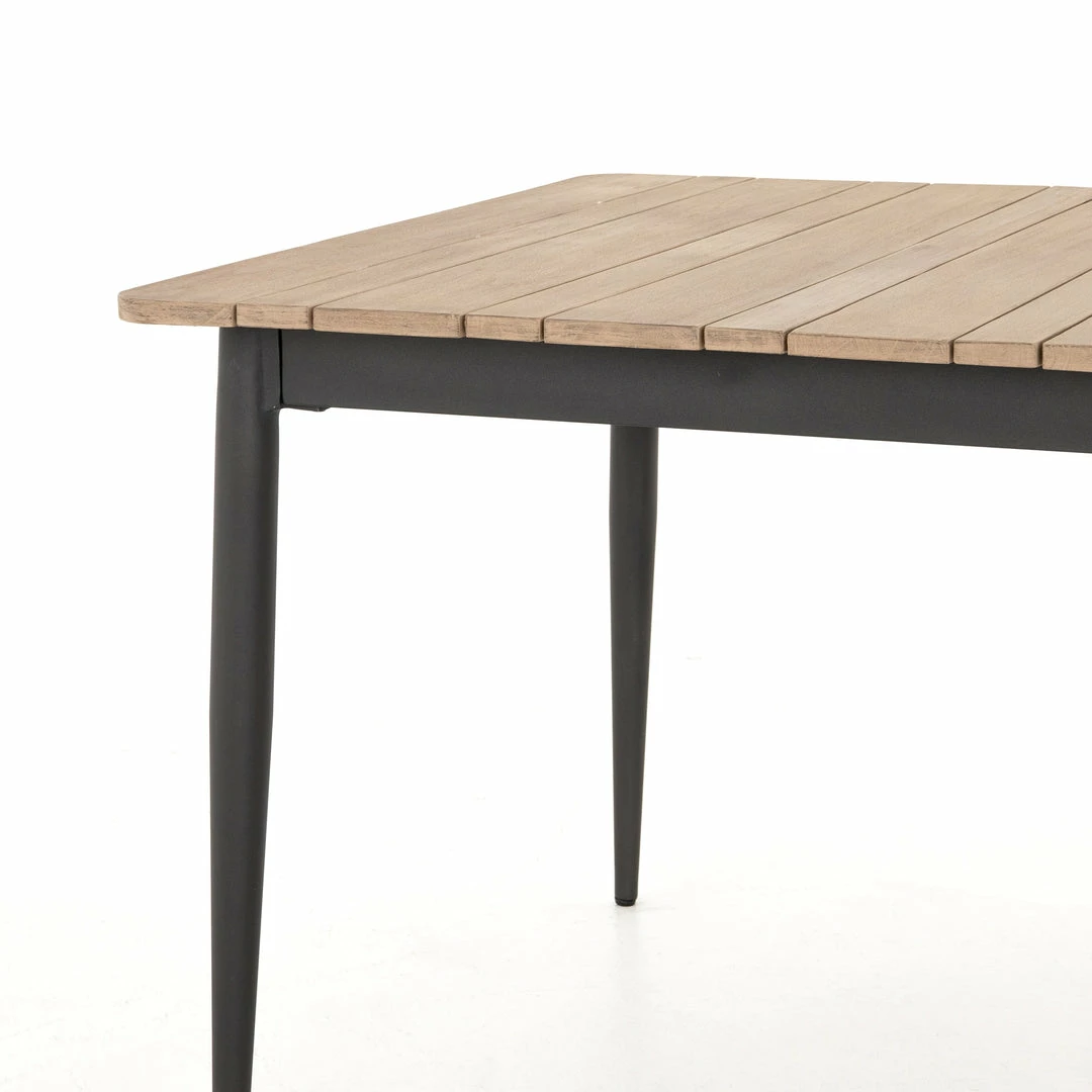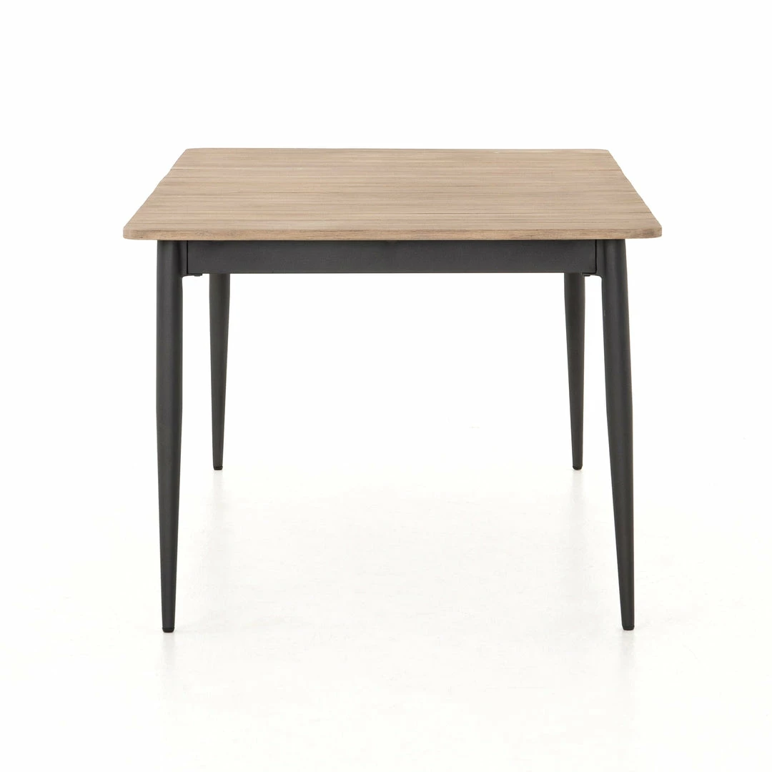 High style, indoors or out. Teak wood is fashioned into a slatted dining table and finished in a washed brown, with slim, bronze-finished aluminum legs for a modern touch. Cover or store indoors during inclement weather and when not in use.