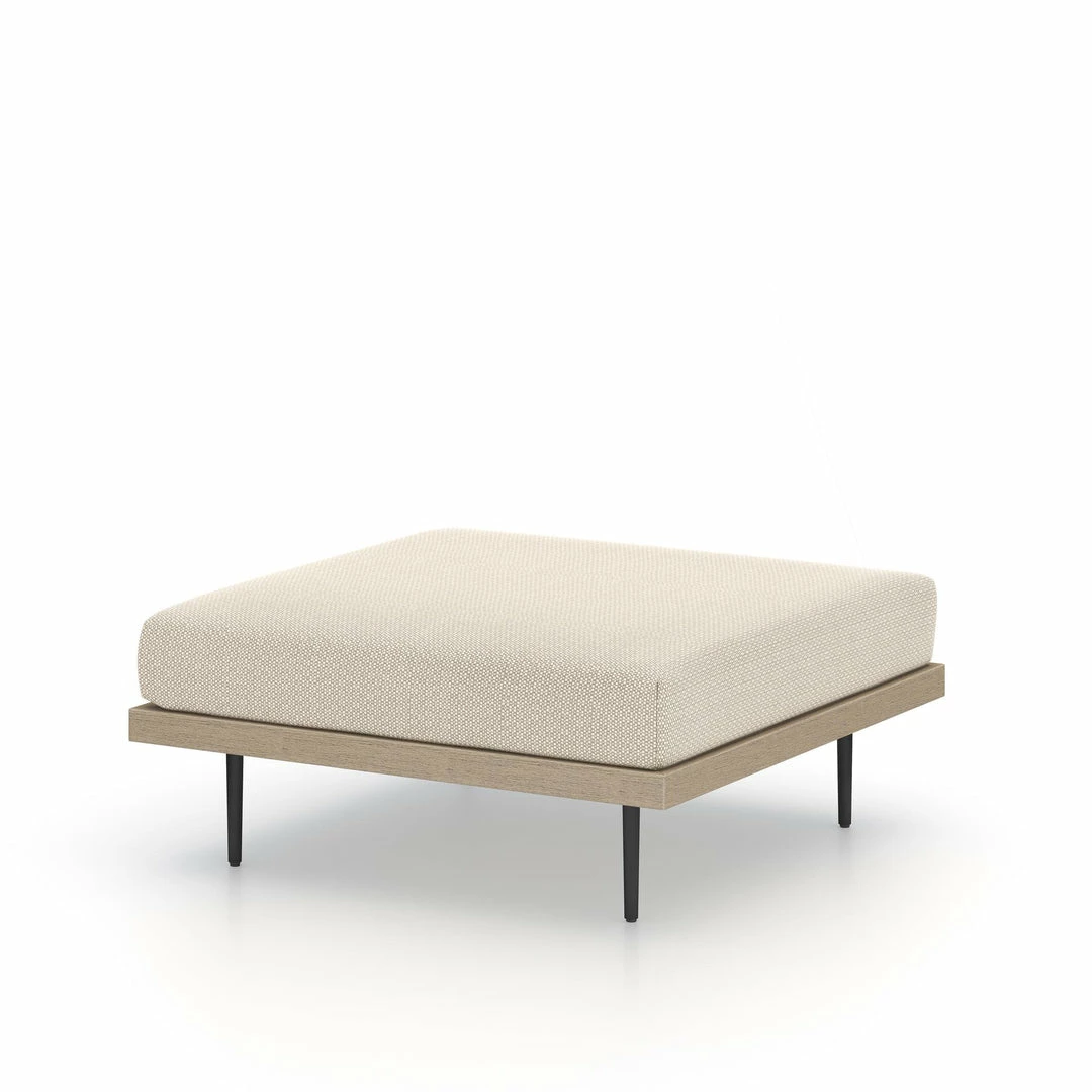 Sculptural modern, made for outdoors. Finished in a washed brown, FSC-certified teak frames durable, weather-resistant cushioning in a neutral sand, with comfy bolster-style arms for lounging. Cover or store indoors during inclement weather and when not in use. Ottoman piece to matching sectional.