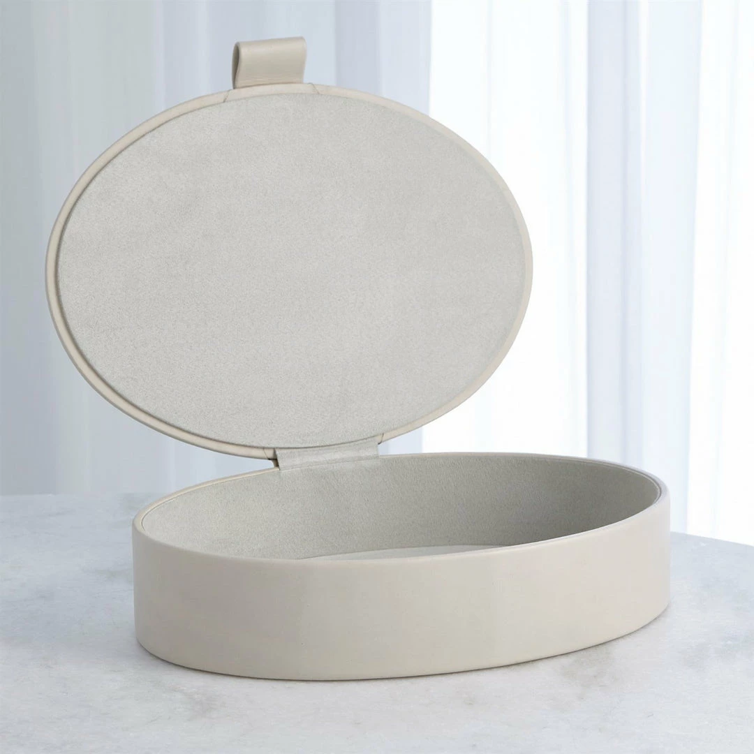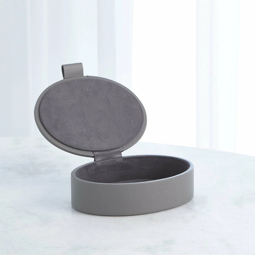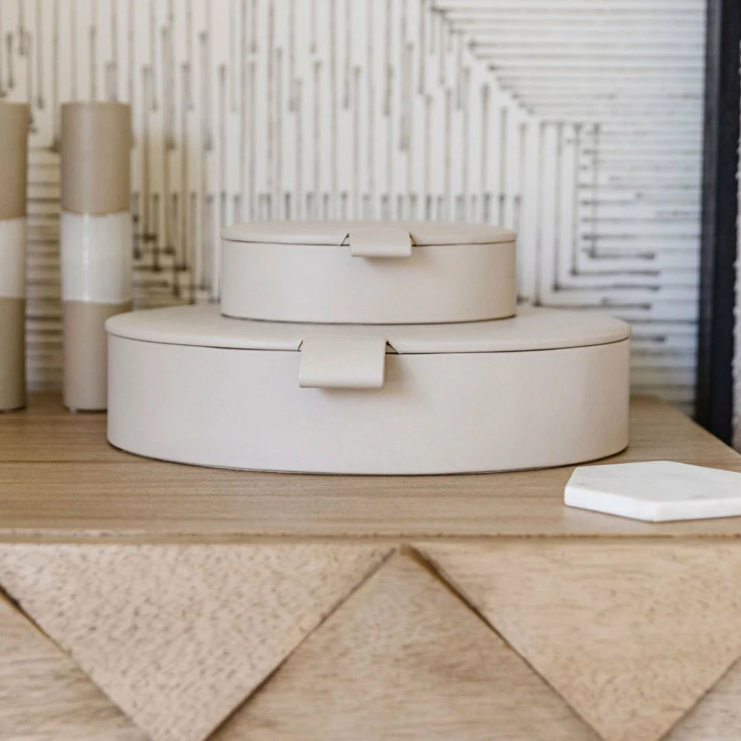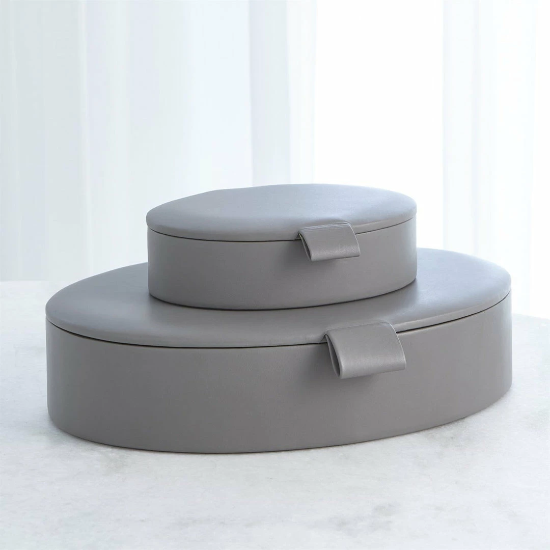 Bring a Barbara Barry classic to your home with the Signature Oval Leather Boxes, with leather pulls and lined in suede.