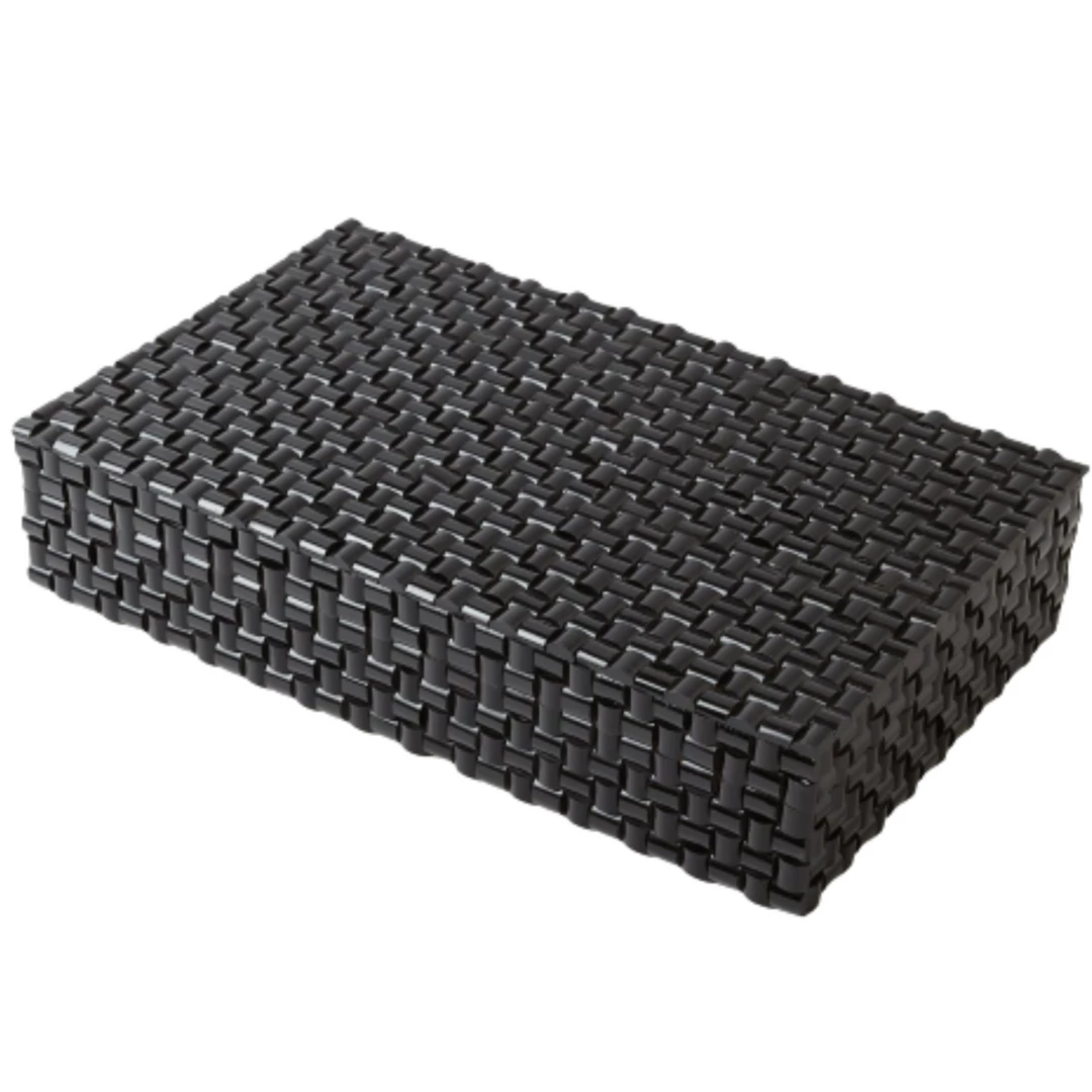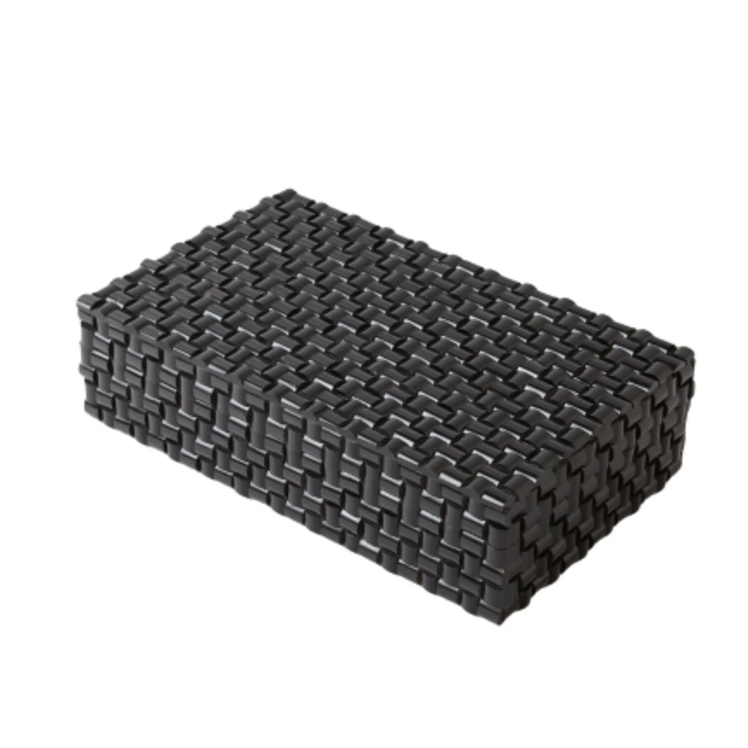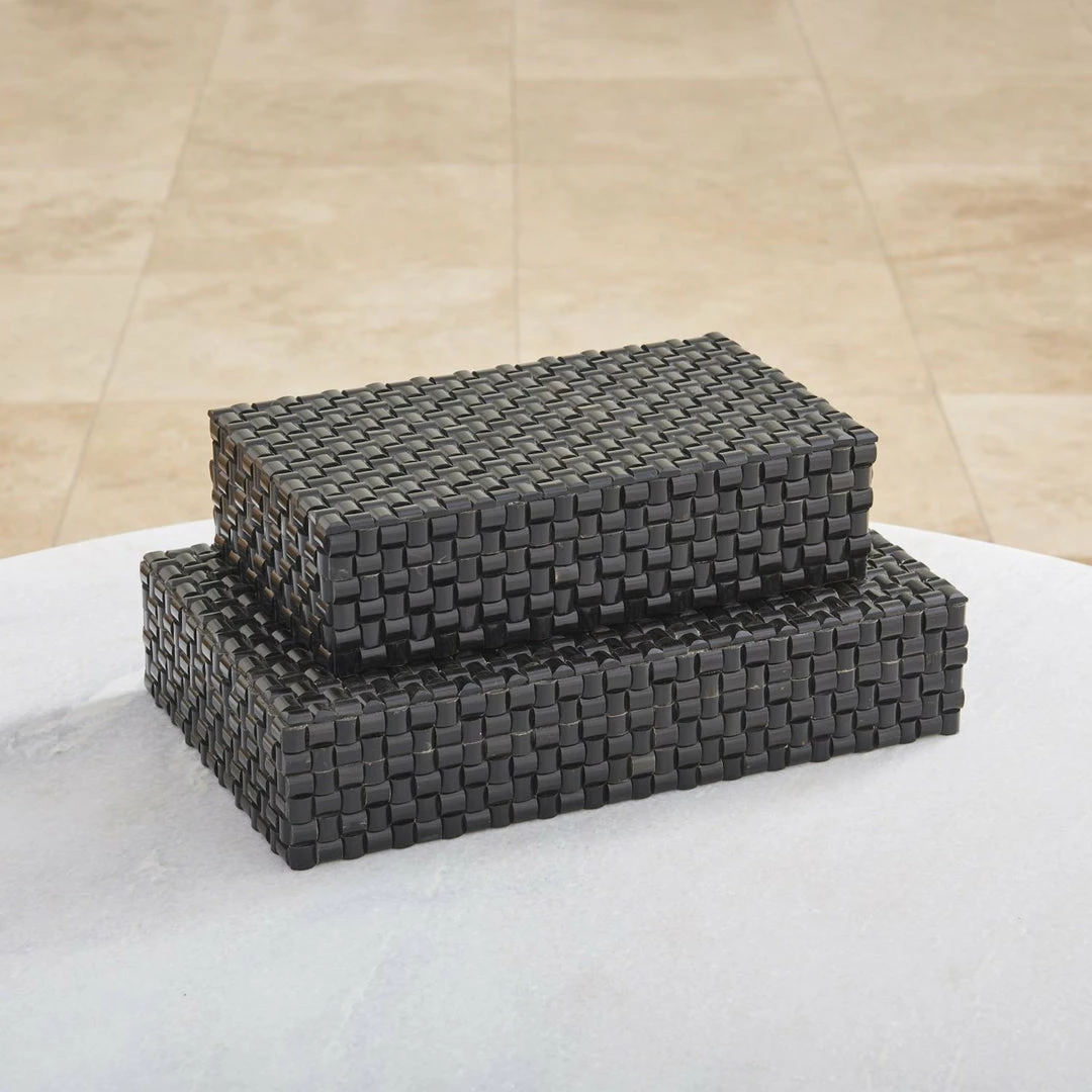 These black boxes with detachable lids are intricately assembled from pieces of horn that are carefully cut and hand-applied giving it the appearance of being woven.