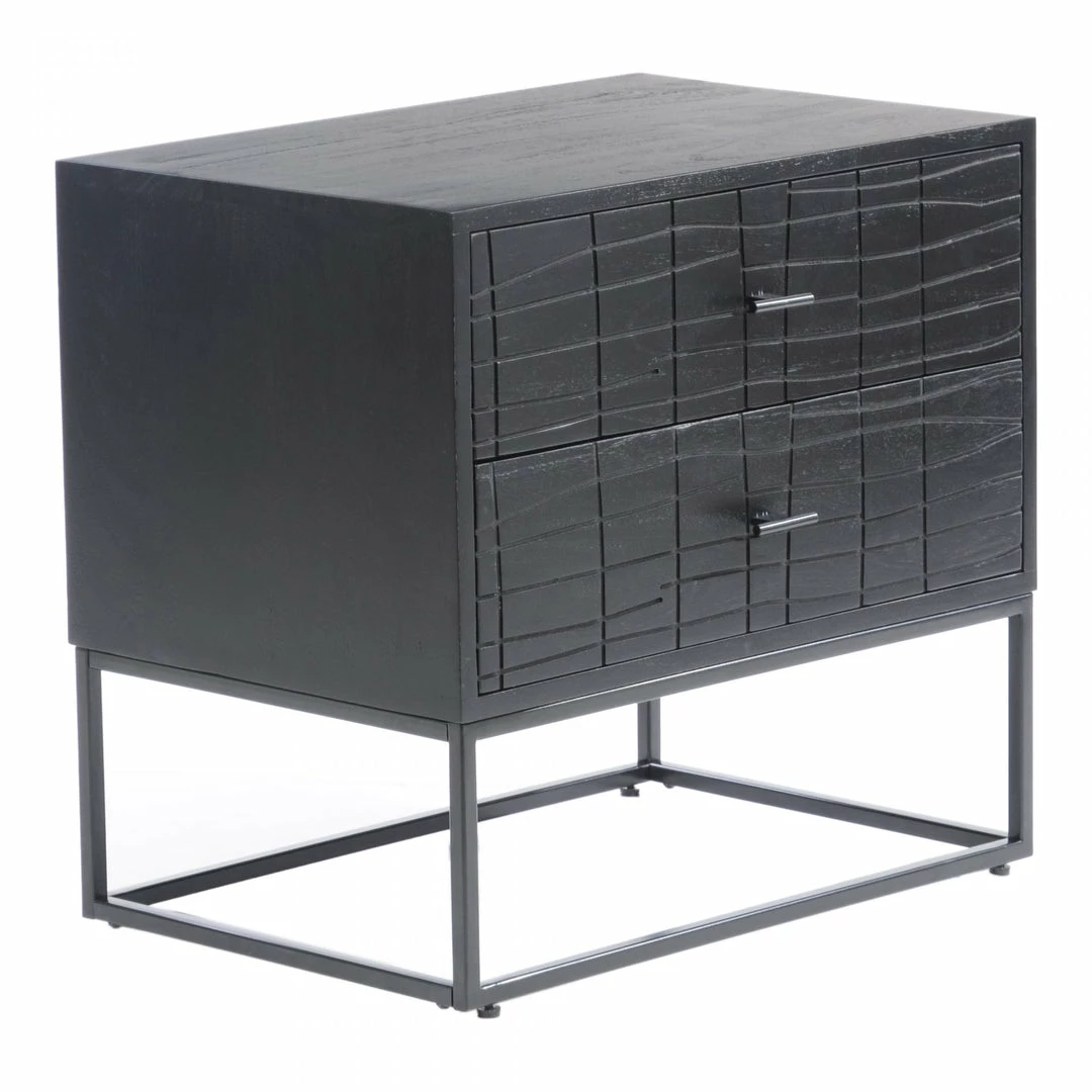 The Atelier nightstand features two sliding drawers with textured detailing. A cool iron frame supports this minimal stand. The ideal stylish spot for a complementary lamp, candle, or cup of tea.