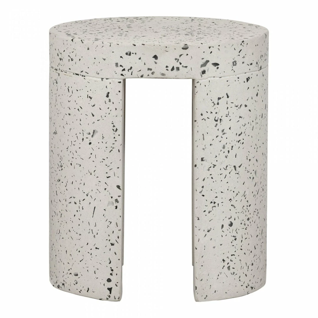 Smooth and minimal, this stool is constructed in a unique concrete terrazzo composite that focuses on the natural beauty of minerals with its speckled, contemporary aesthetic. Perfect for an open-plan garden or patio setting, this stools rounded geometric shape contrasts so well within an organic environment.