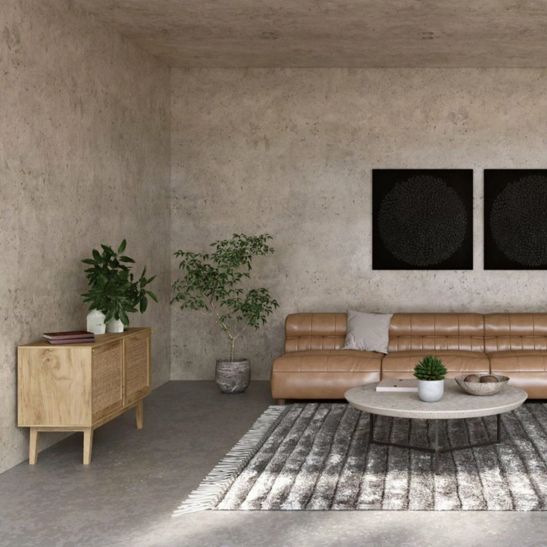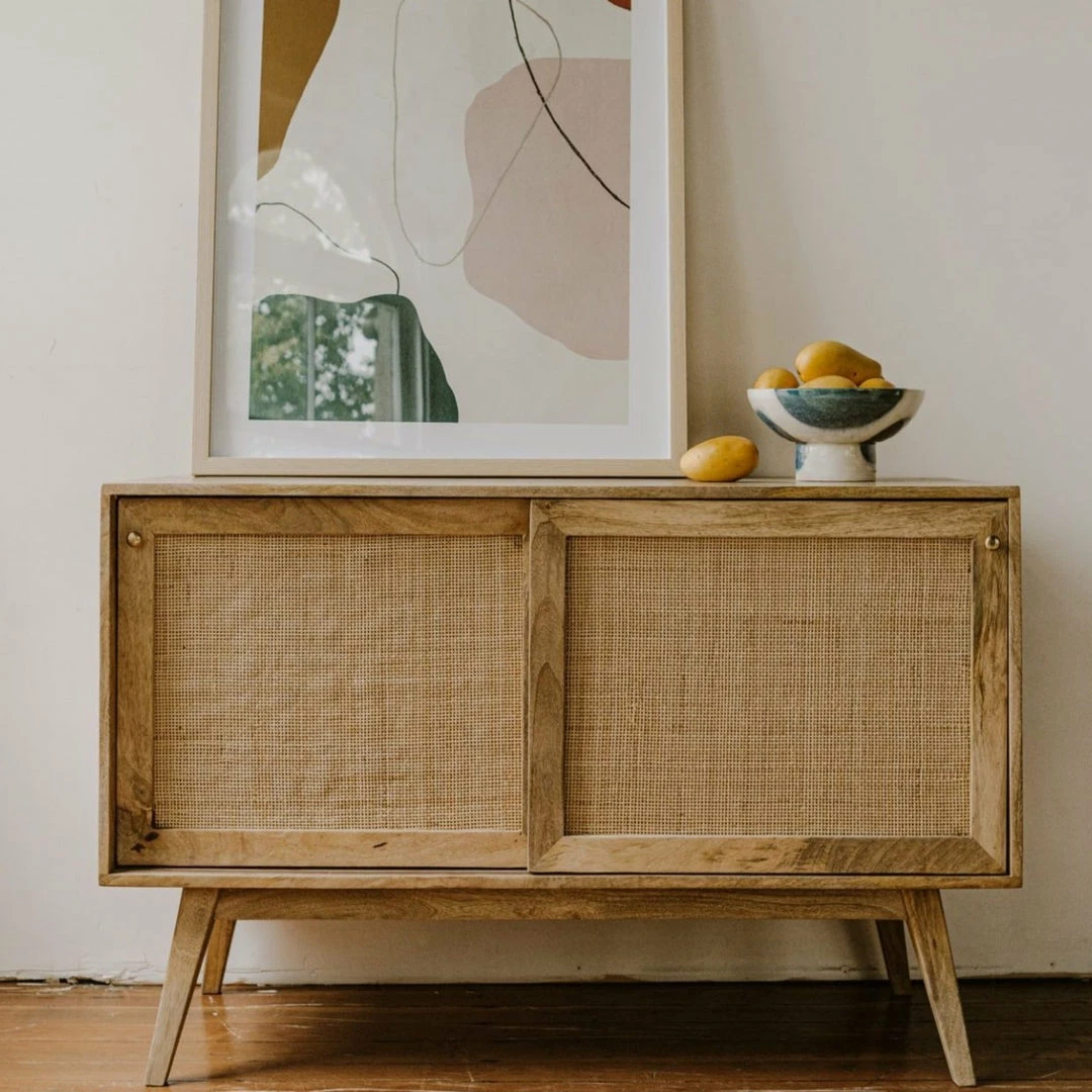 A perfect sidepiece. Natural wood grain, whorls, and knots lend it a bohemian or rustic look in your home. Its two sliding reed doors feature golden knobs for a modern touch.
