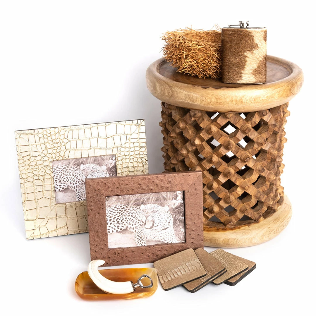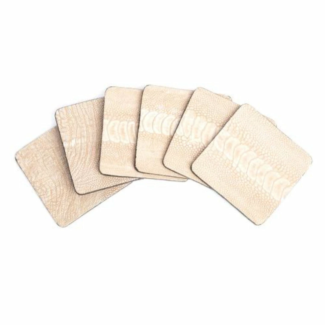 Stonewashed, individually stitched by hand, made of genuine Ostrich shin leather. They come in a set of six, wrapped in a complimentary leather tie. The coasters are waterproof and extremely durable. Due to the use of natural materials, each piece is unique and may vary slightly from the image shown.