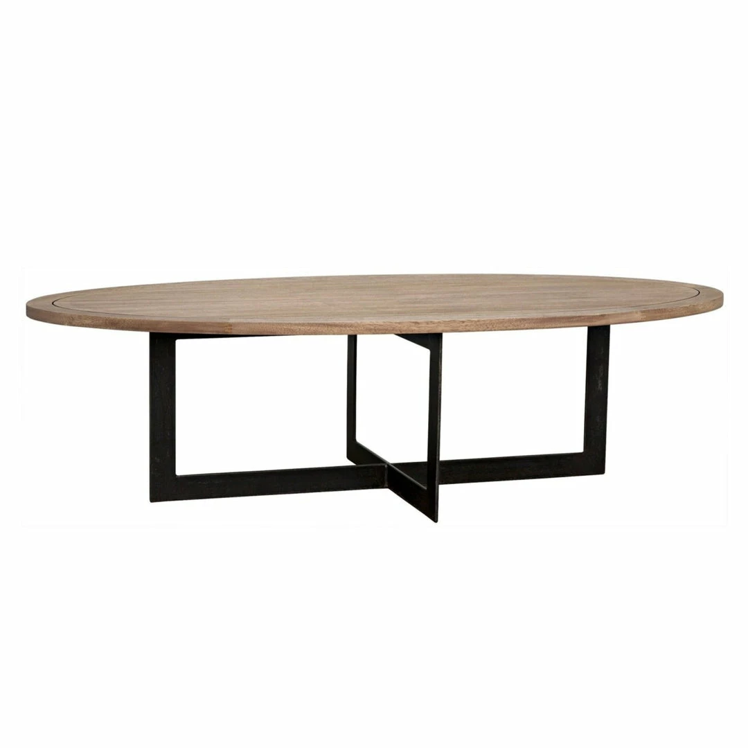 A simple, minimally finish metal base is topped with an oval of walnut in this updated take on a traditional coffee table.