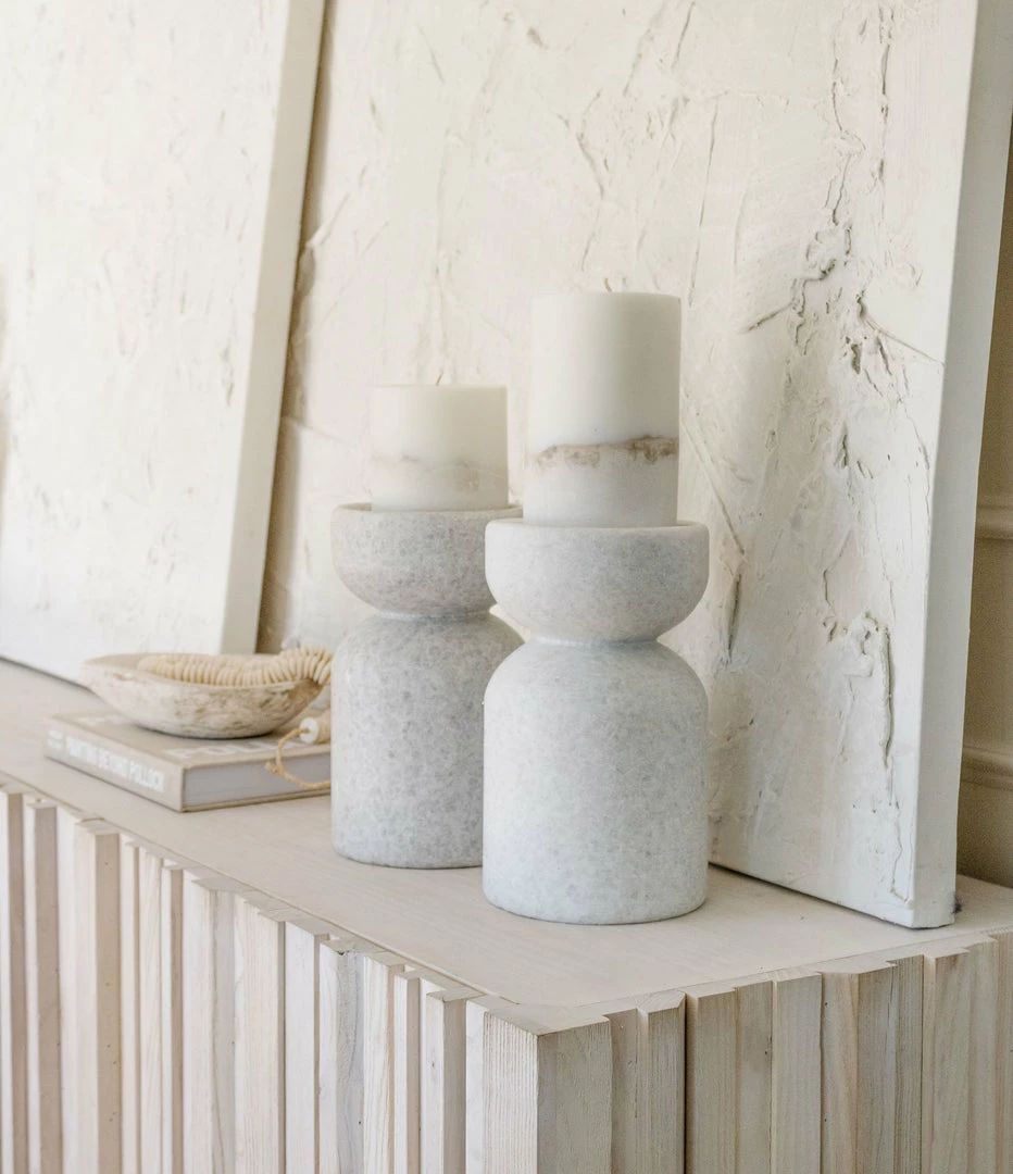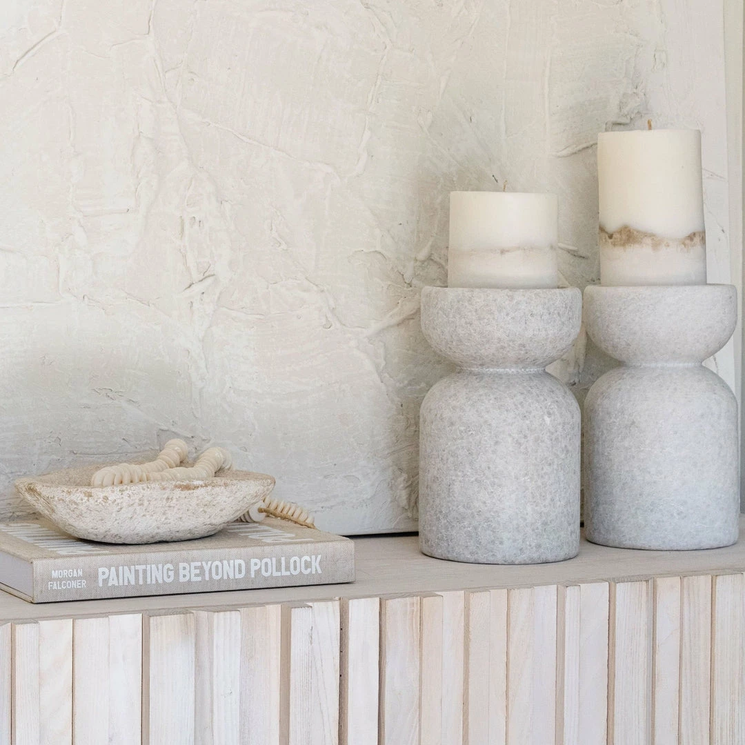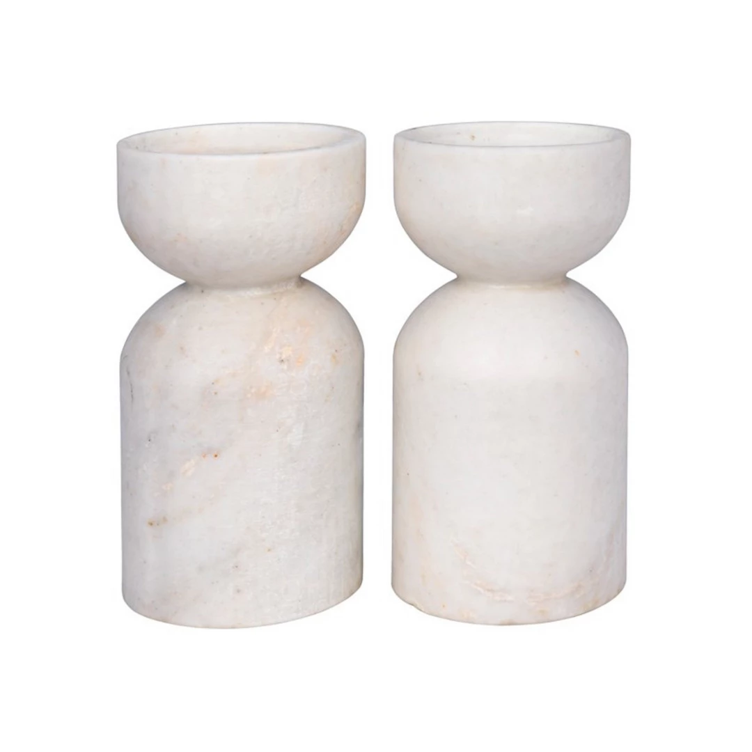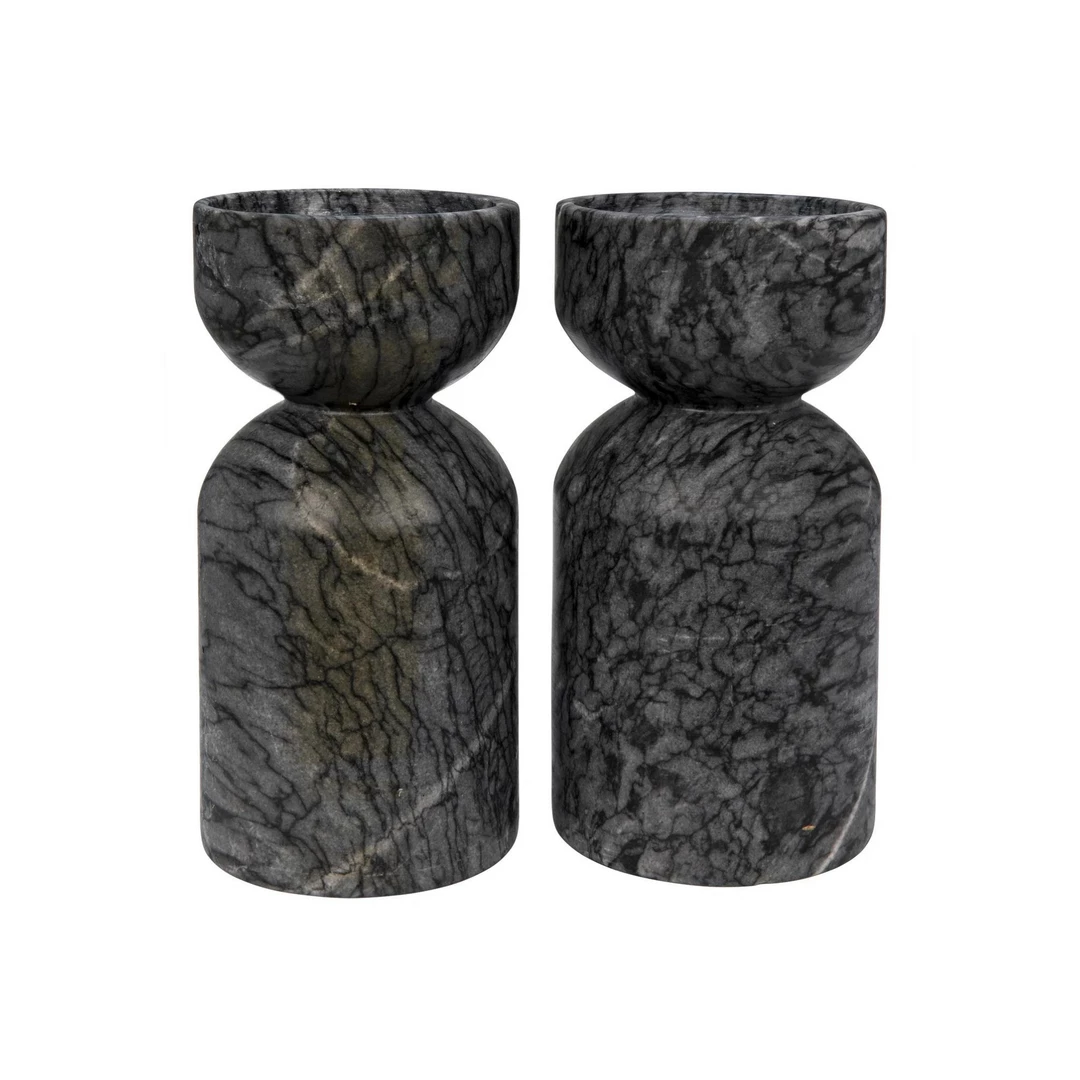 These contemporary curved candleholders have been hand-carved of solid black or white marble. Sized for use with pillar candles and sold in sets of two. No two pieces of stone, and therefore no candle stands, will be identical.
