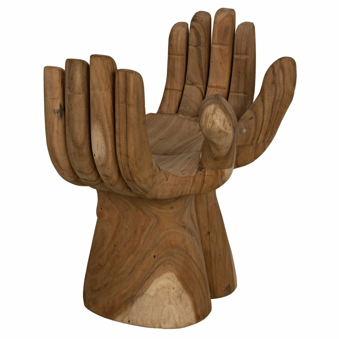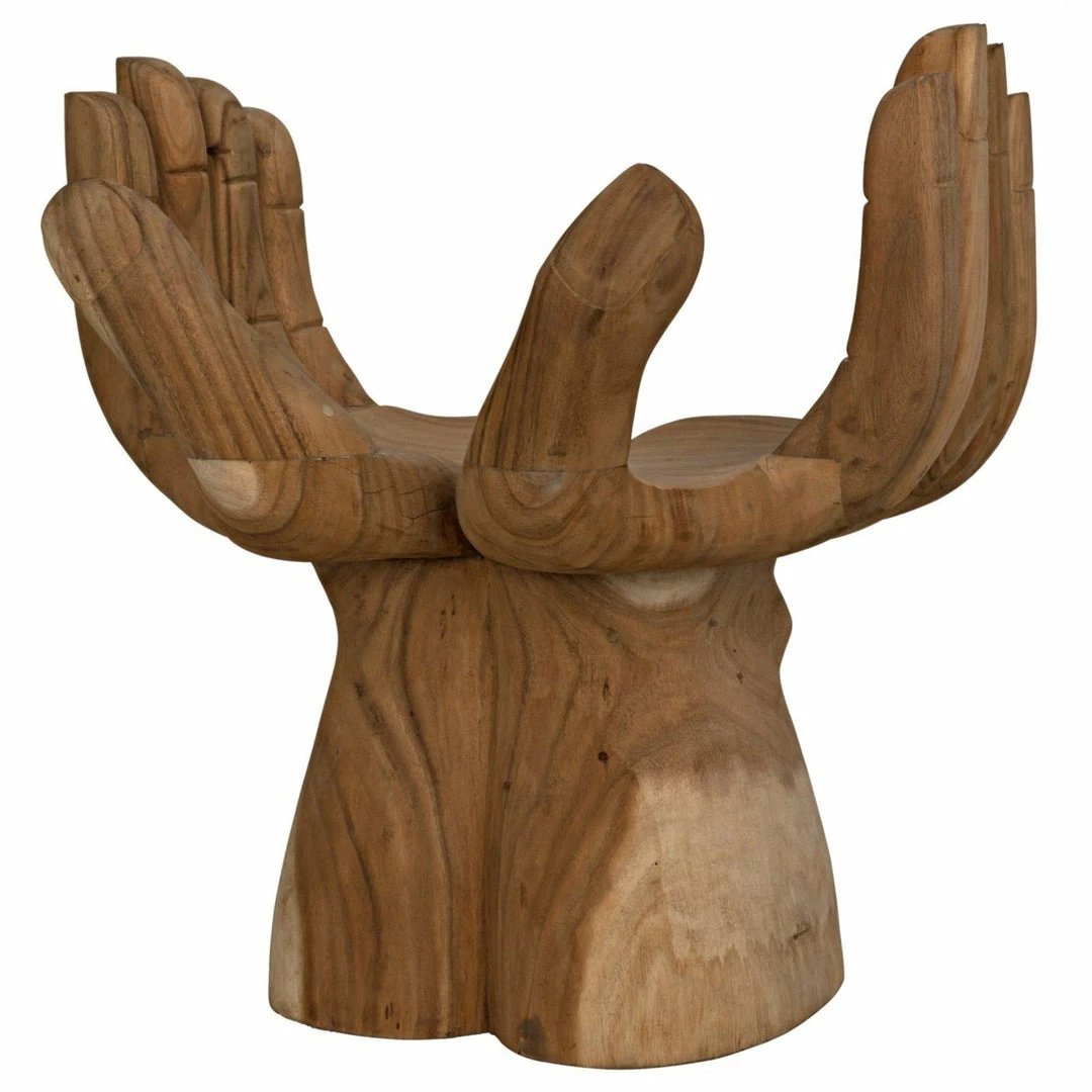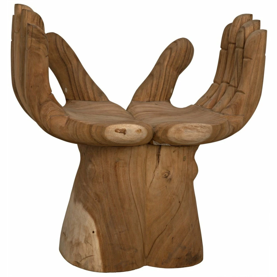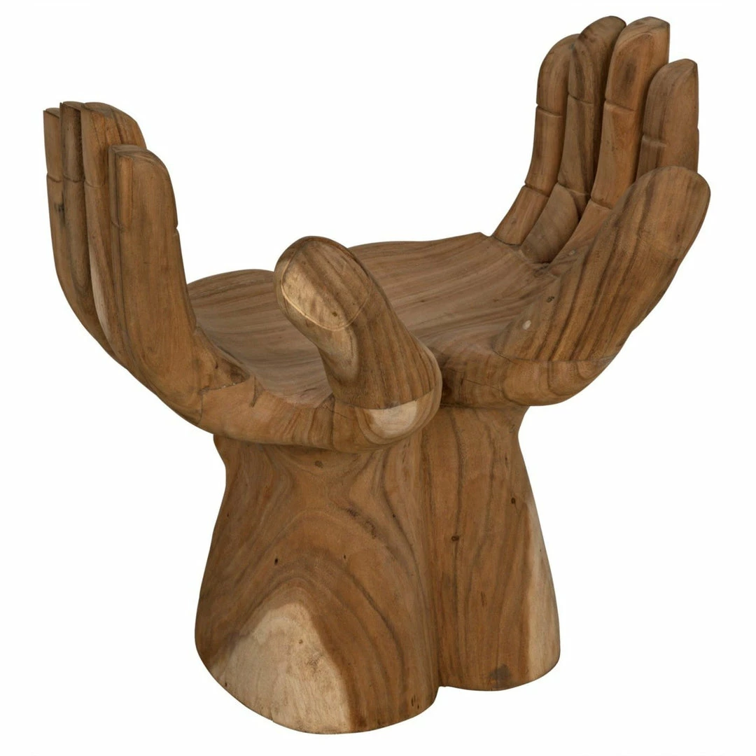 Intriguing and ethereal, bold yet whimsical, this dramatic chair cradles you in two hand-carved teak hands. Each piece is created lovingly by artisans who embrace the idiosyncrasies of the hardwood to create true works of art, ensuring that no two will be identical.