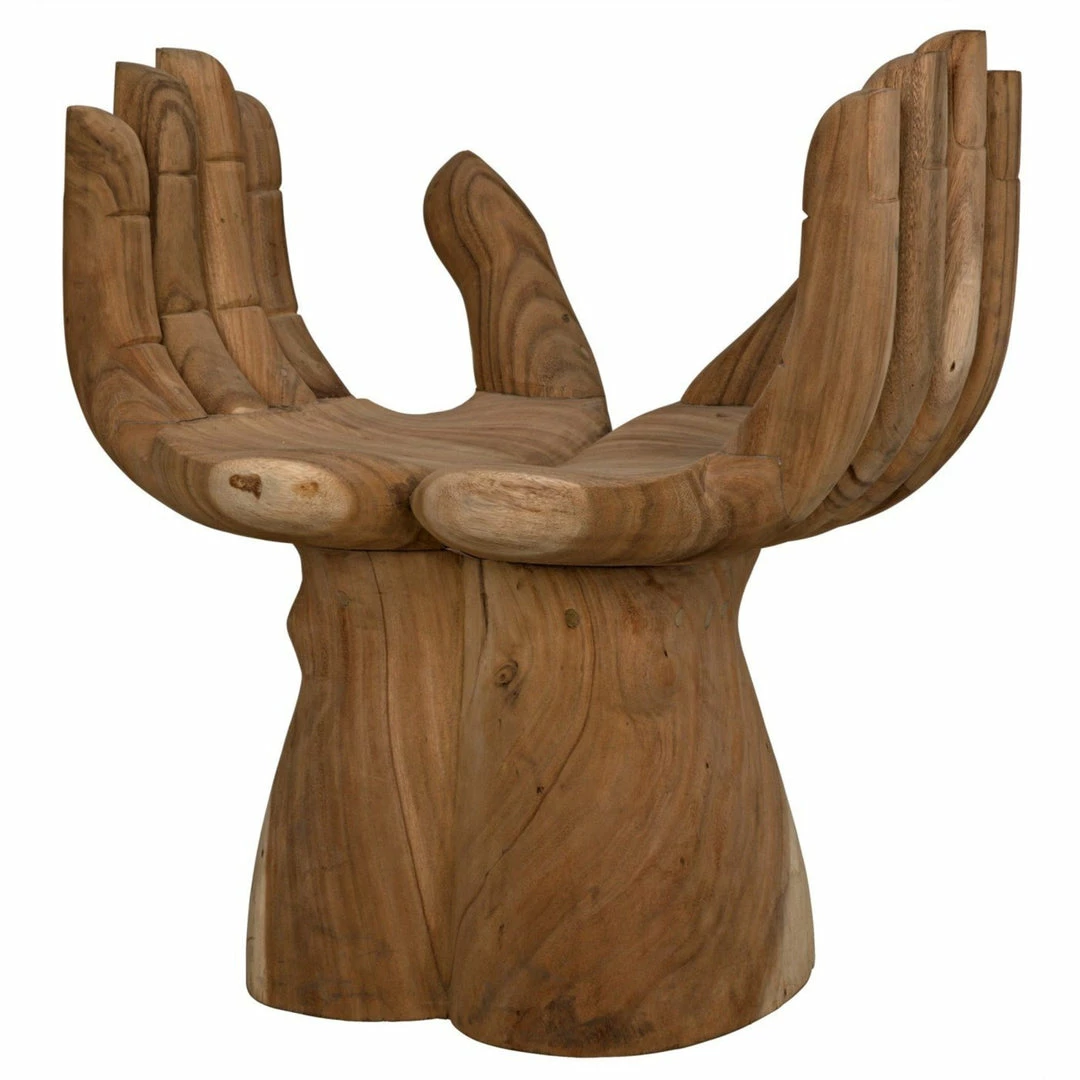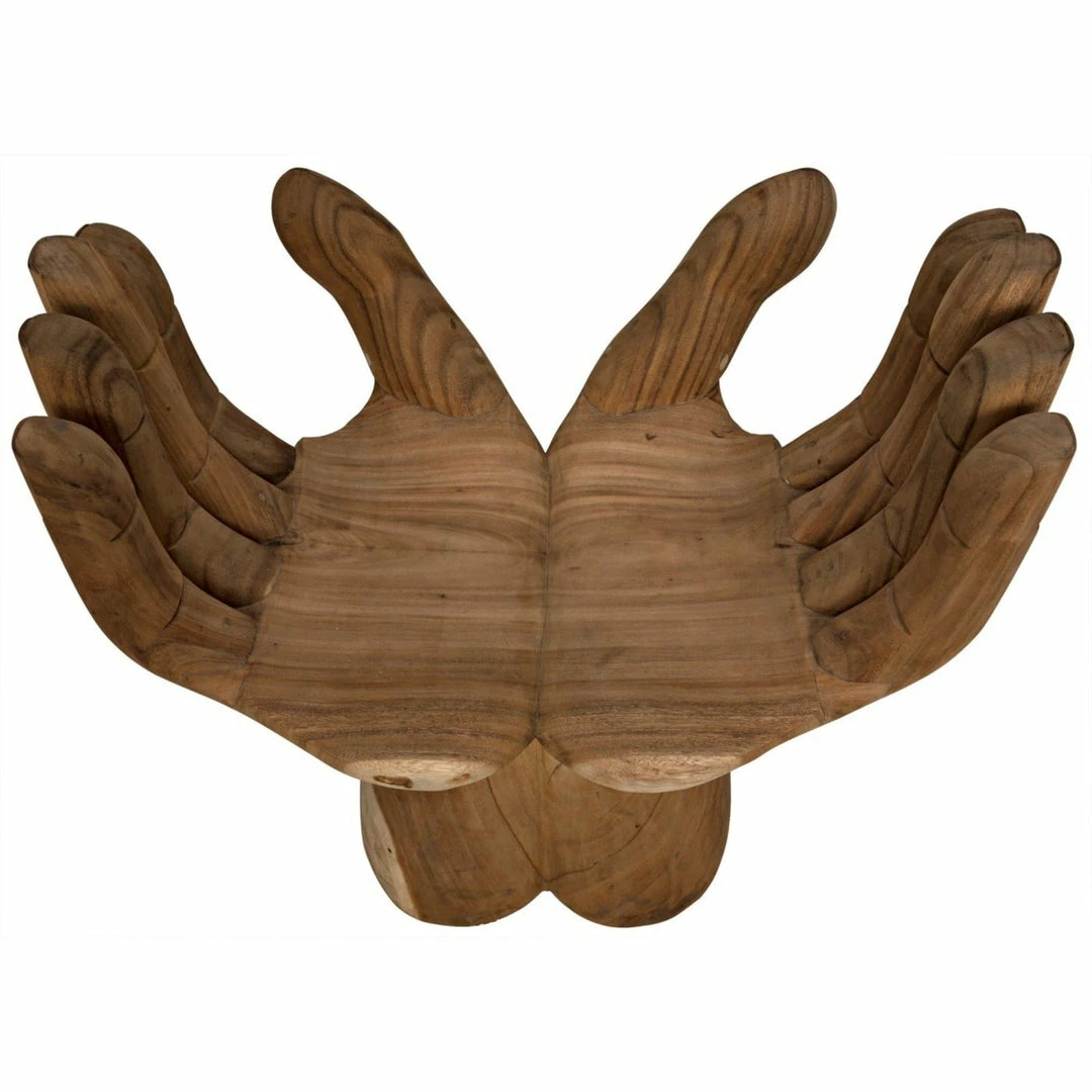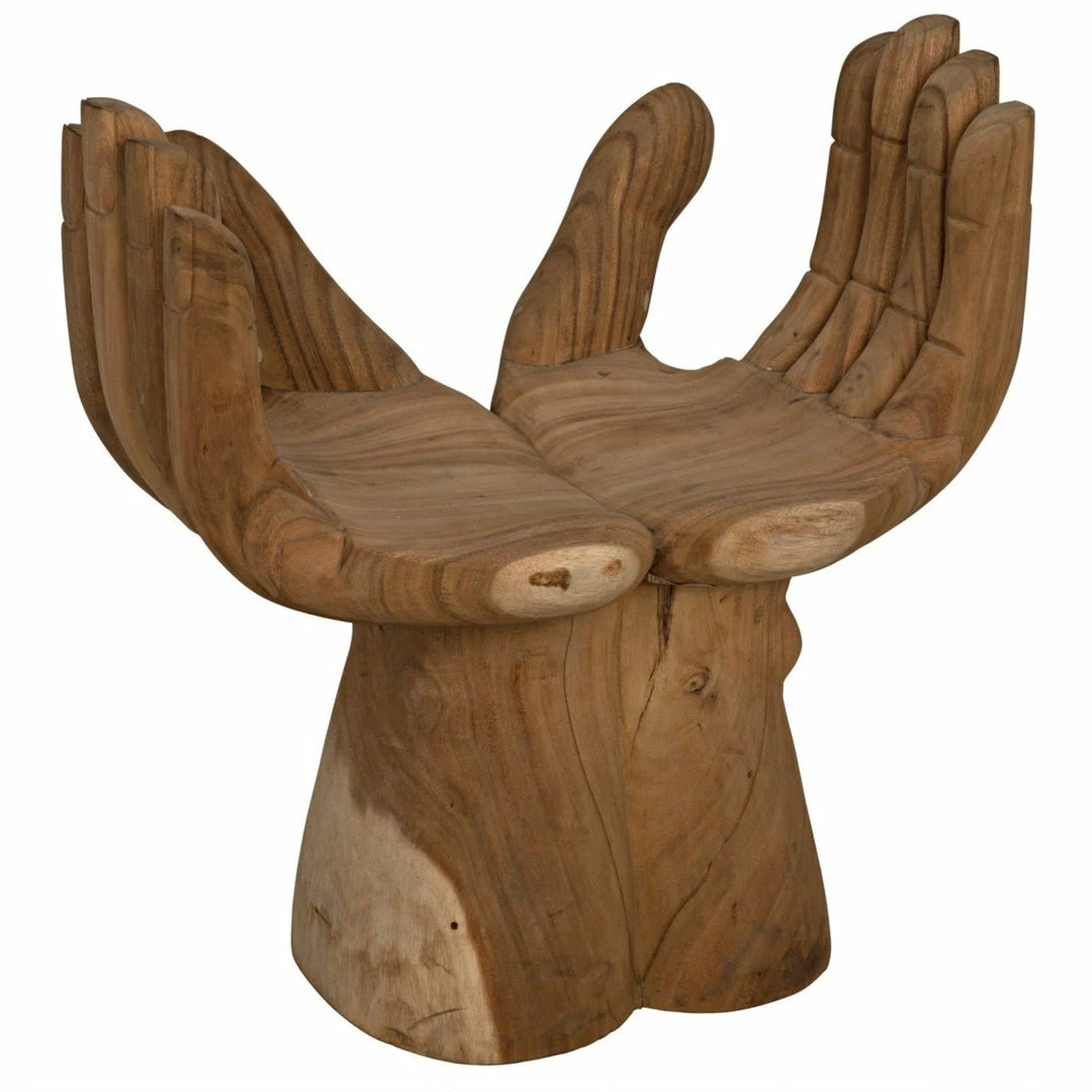 Intriguing and ethereal, bold yet whimsical, this dramatic chair cradles you in two hand-carved teak hands. Each piece is created lovingly by artisans who embrace the idiosyncrasies of the hardwood to create true works of art, ensuring that no two will be identical.