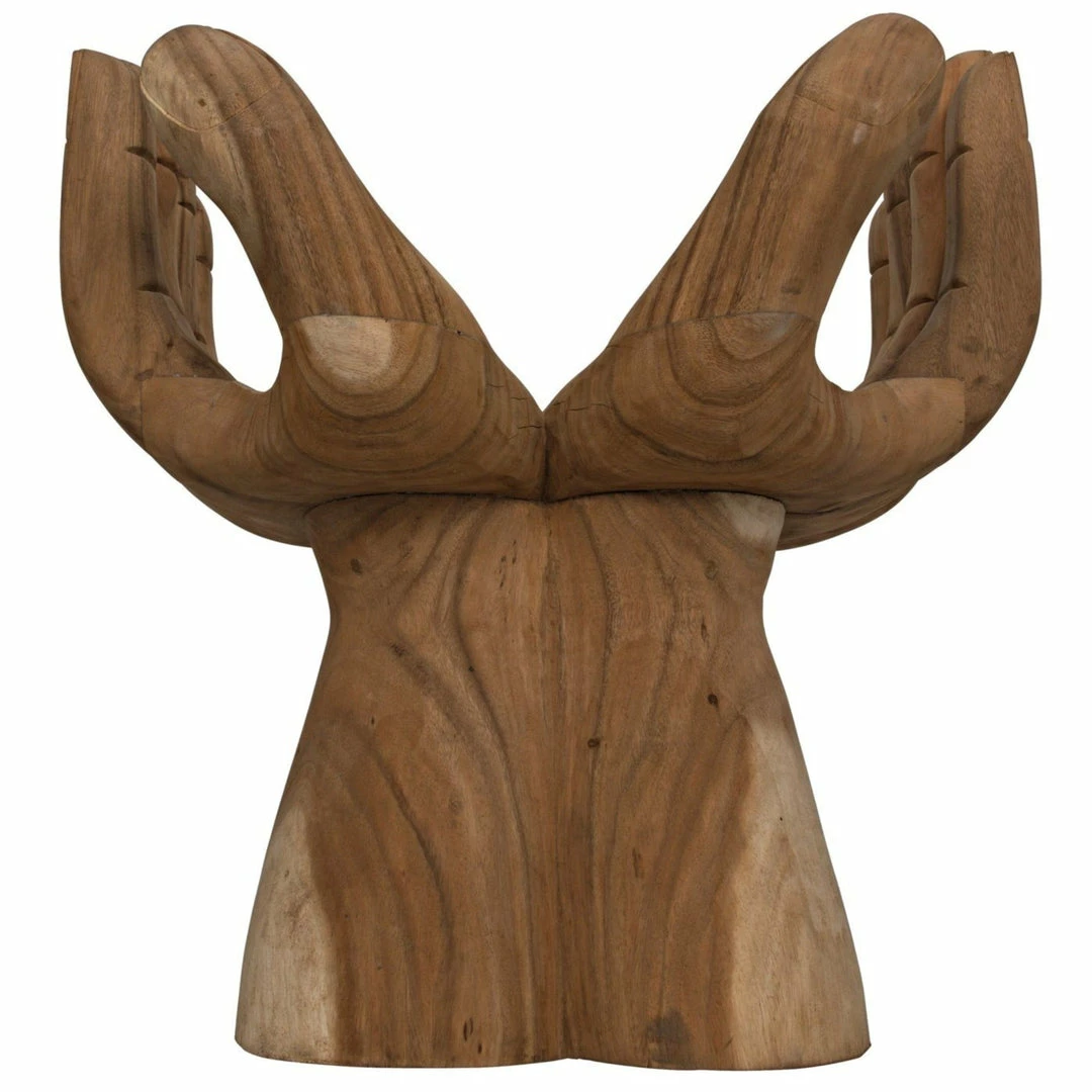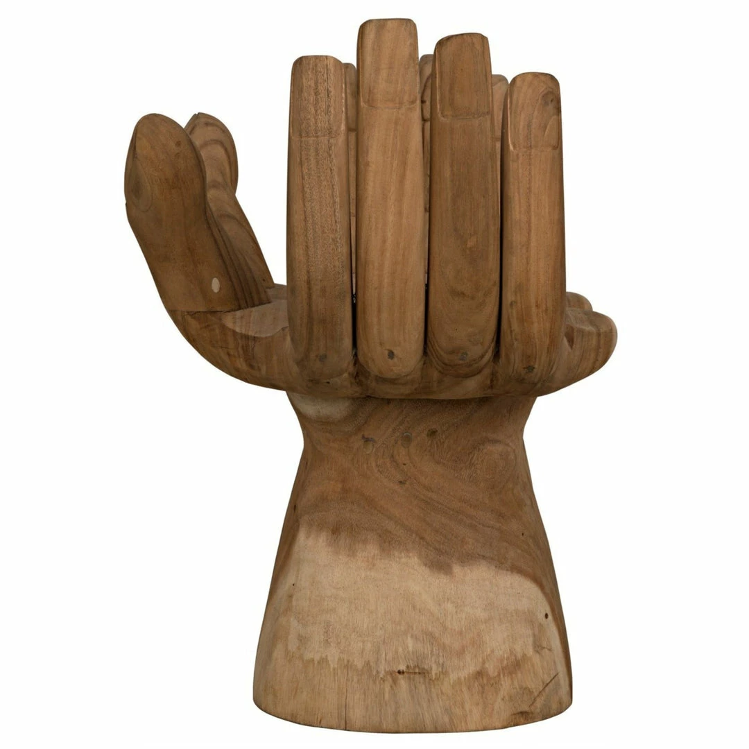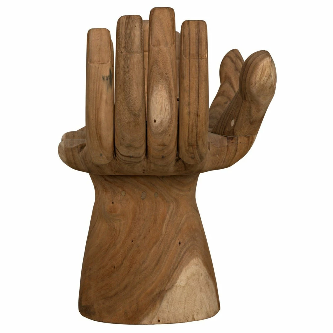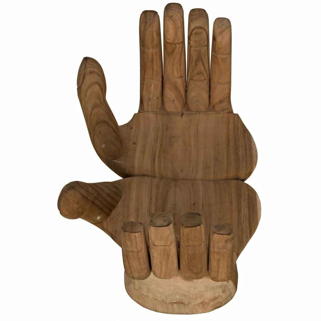 Intriguing and ethereal, bold yet whimsical, this dramatic chair cradles you in two hand-carved teak hands. Each piece is created lovingly by artisans who embrace the idiosyncrasies of the hardwood to create true works of art, ensuring that no two will be identical.