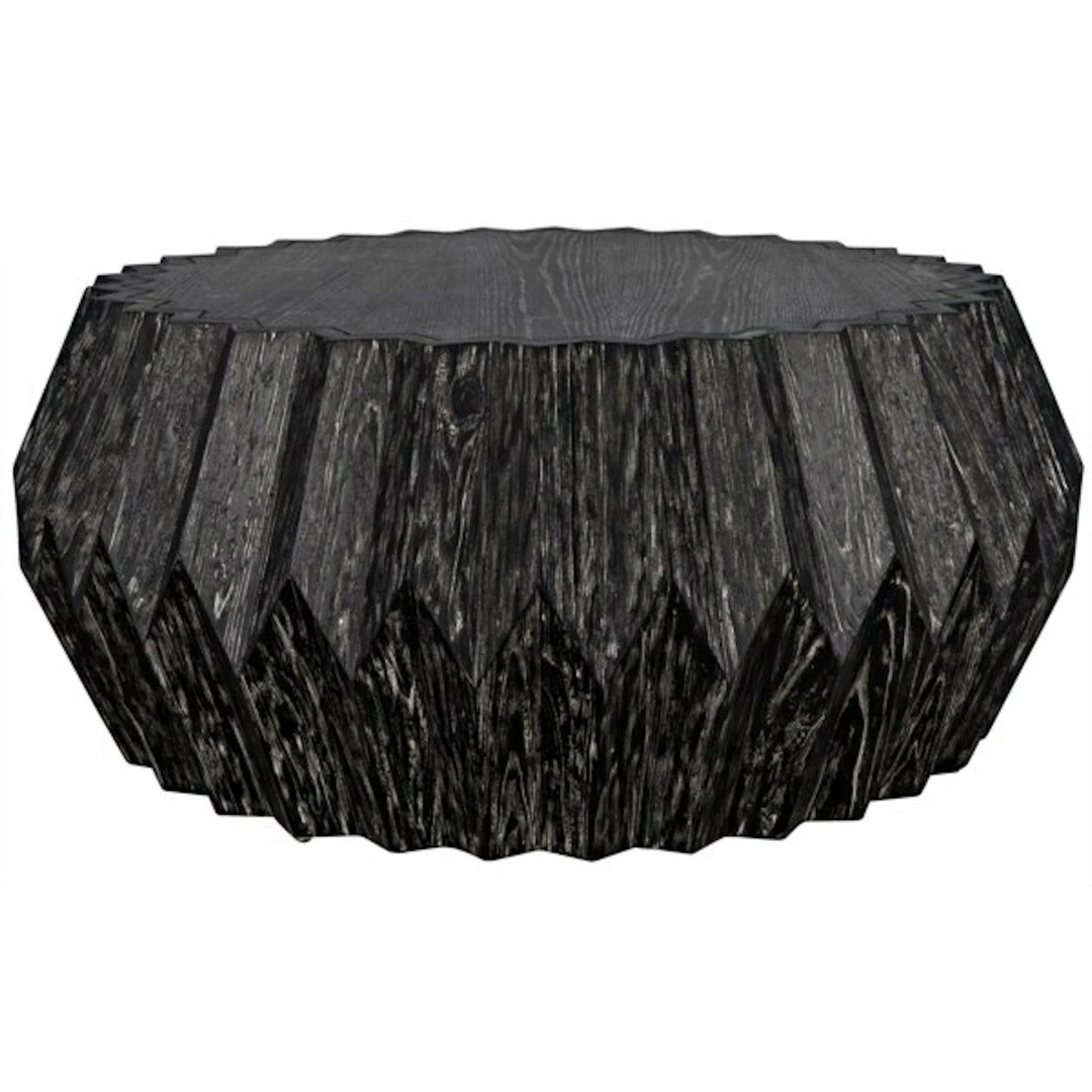 Expertly hand-carved of Mindi wood, with pinked zig-zag edging on the top and bottom that feeds into a deeply decorative ridged body, this incredible design makes a stunning coffee table.