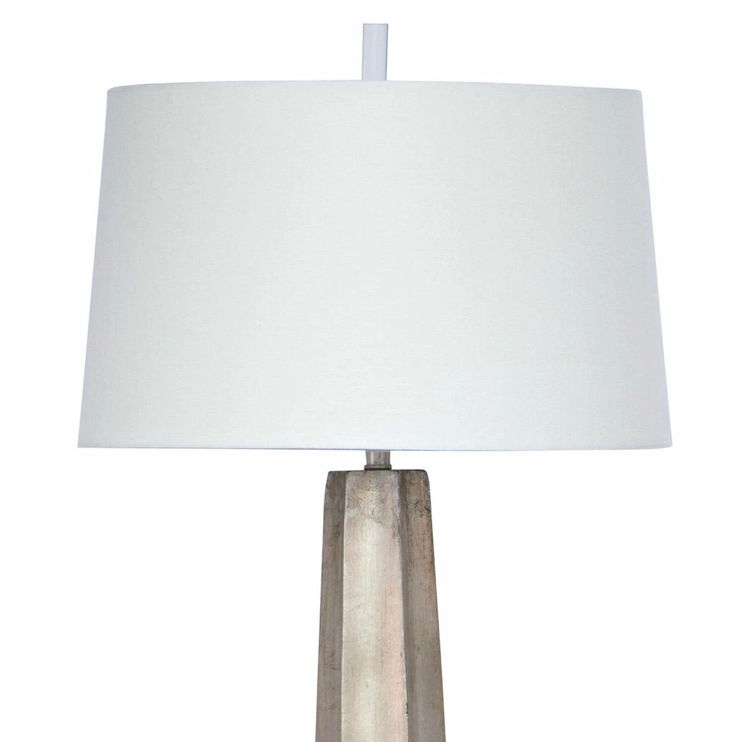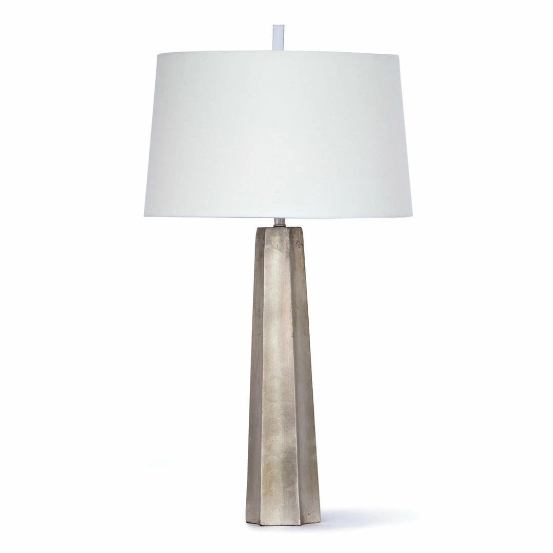The retro, tapered shape of its base capped with a tapered natural linen traditional shade and fitted with polished hardware allows this lamp to impart glamour, throwback style. Available finishes in Brass and Nickel.