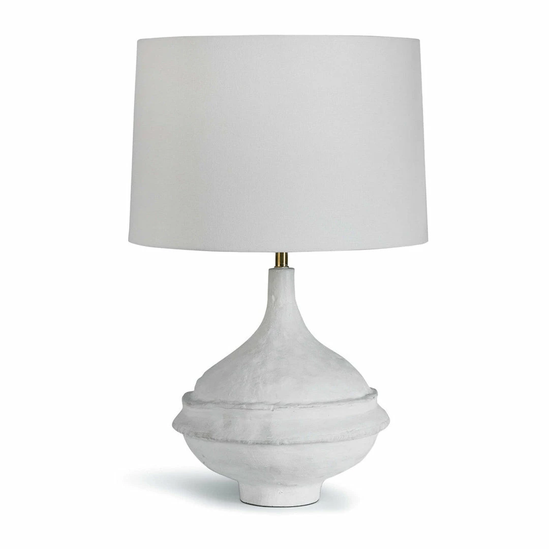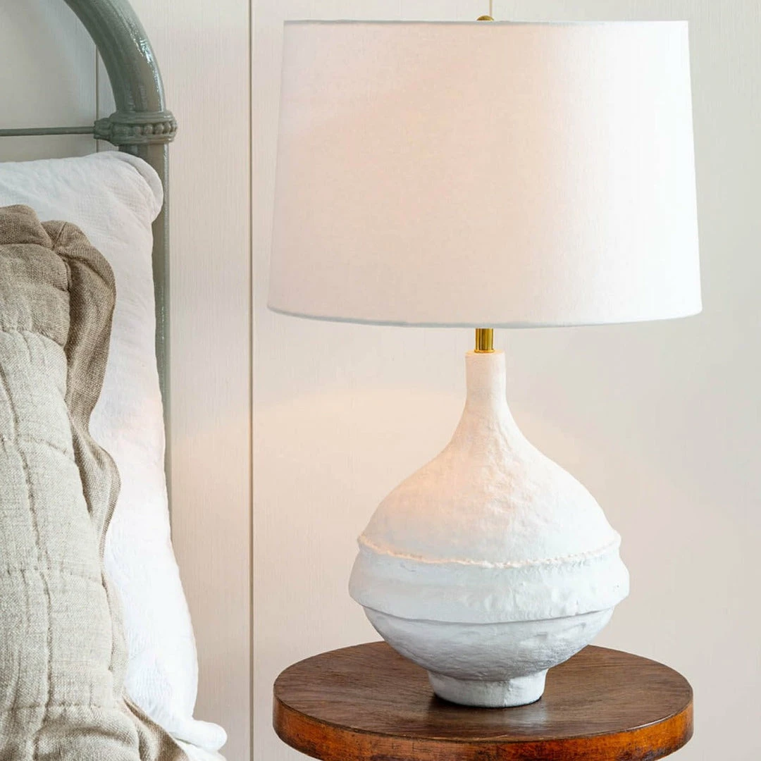 Inspired by a paper maché bowl, this versatile lamp is at home in a variety of spaces. Complex curves, paired with a matte white finish give this table a unique appearance. Slight imperfections were left in, adding beauty and originality.
