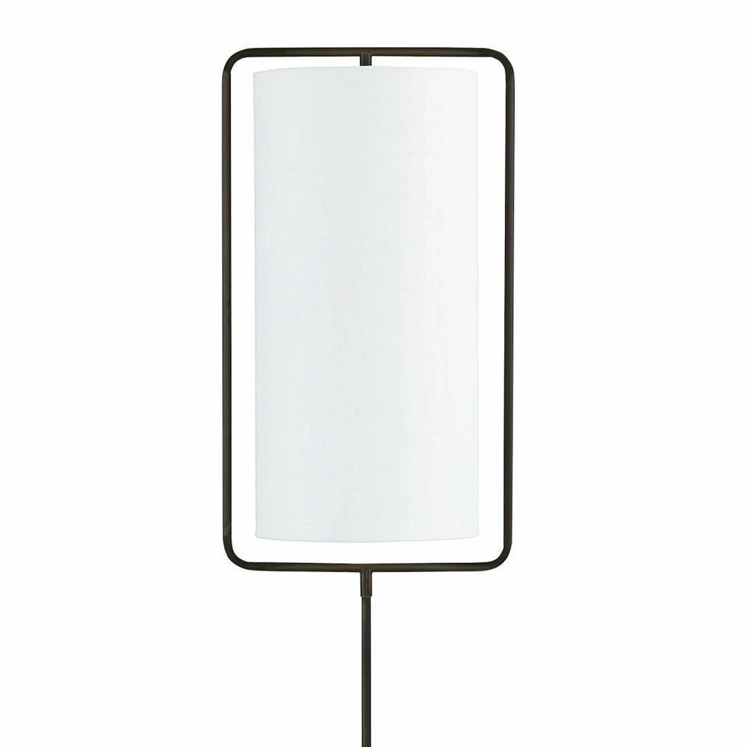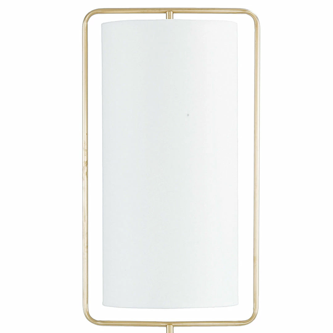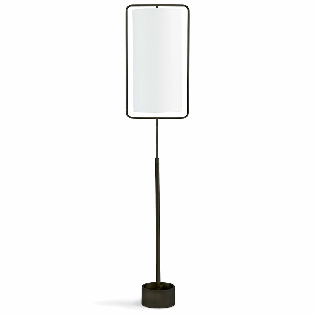 The crisp white shade is ensconced in a tubular steel frame creating an ultra-modern look. The lamp’s gorgeous geometric and distinctive silhouette bring together an innovative blend of circular, rectangular and cylindrical shapes for a seamless merger of form and function. Available Finishes in Natural Brass and Oil Rubbed Bronze.