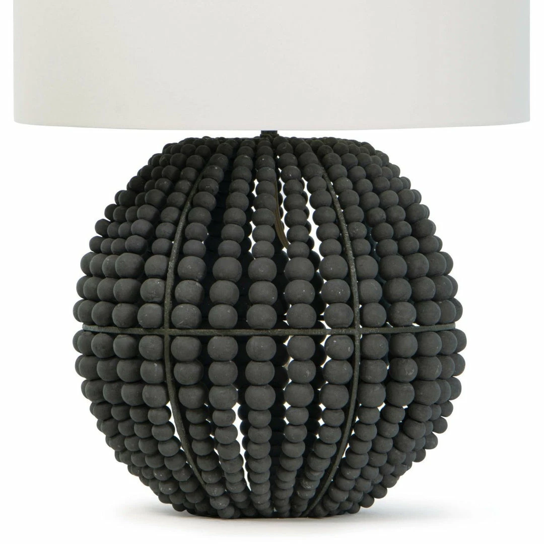 Coastal style meets modern charm with the Saint-T table lamp. A bevy of draped charcoal grey wooden beads, dresses up the steel structure, bringing out an earthy glamour to a living room, dining room or bedroom.ย ย Birch Wood material and Grey finish.