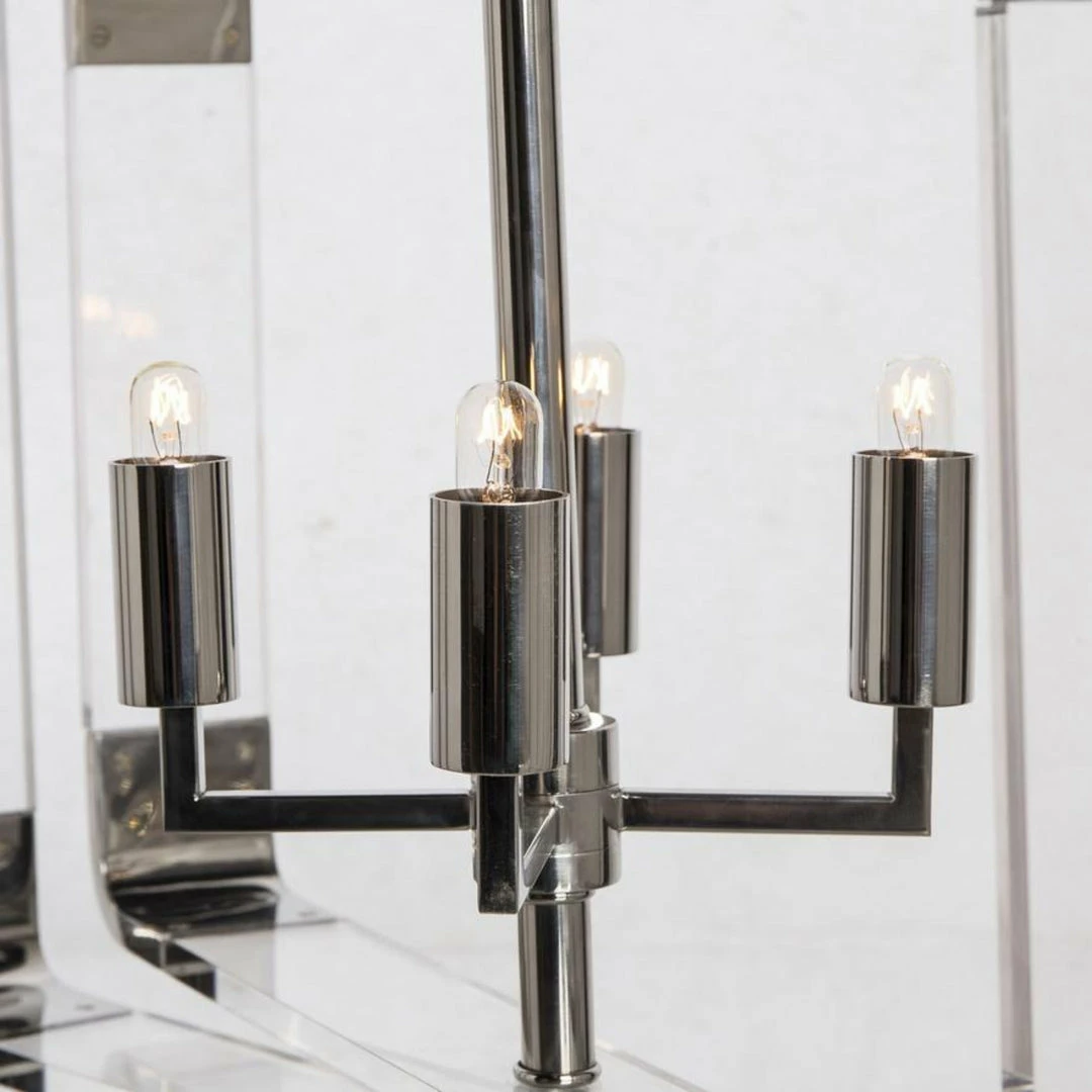 A signature Nellcote Studio piece, this light was created to be a mobile luminaire sculpture for the home. Crafted from a unique combination of polished acrylic and polished brass, each of the seven layers spins independently of the other, allowing for infinite configurations and design possibilities. Four candelabra sockets provide ample light, wrapped in matching solid brass or solid nickel.
