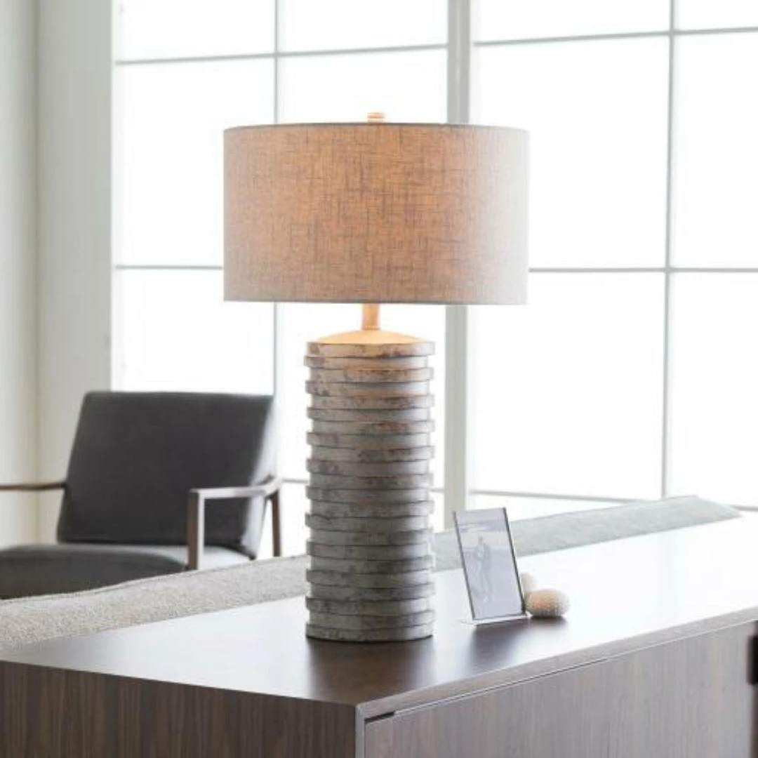 Table Lamp available in 2 colors White and Tan,ย Ivory Hand Finished Composition Body,ย ย Light Gray Cotton Shade