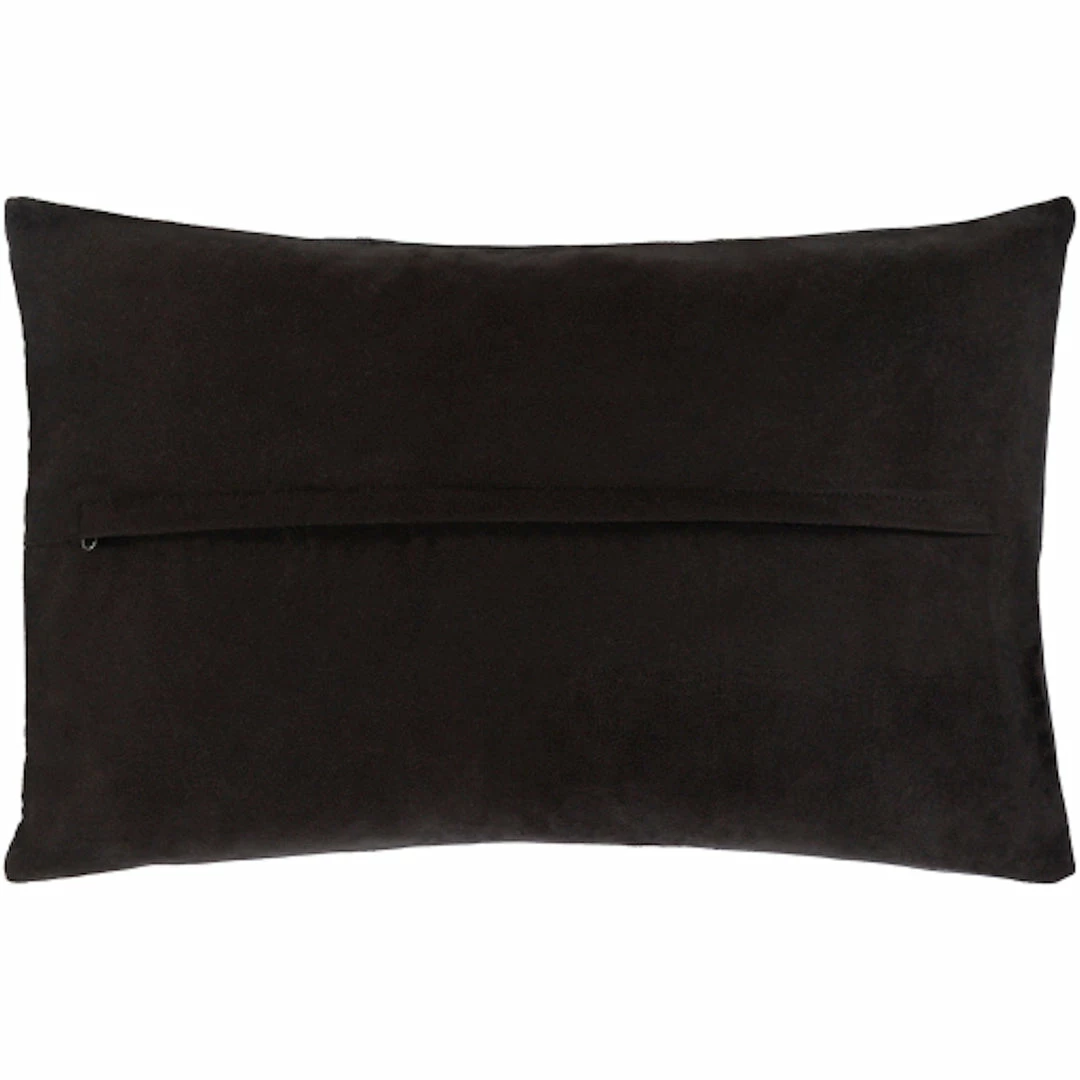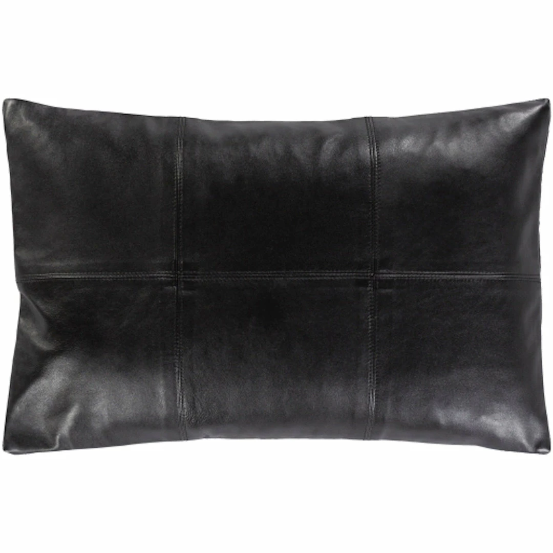 The Launch Pillow is a black pillow made of 50% leather and 50% polyester in the front and 100% polyester in the back. It has a knife edge look and is the perfect chic look to add to your bed, couch, etc.