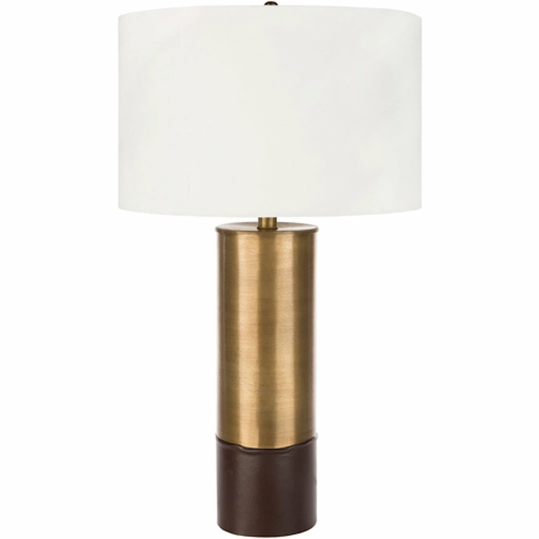 Table Lamp,ย Antiqued Leather,Metal Body,ย White Cotton Shade,ย Antiqued Metal Base,ย Metal Finial